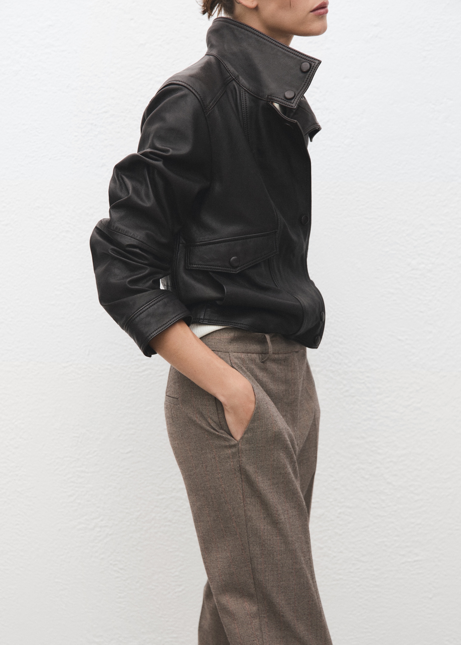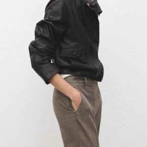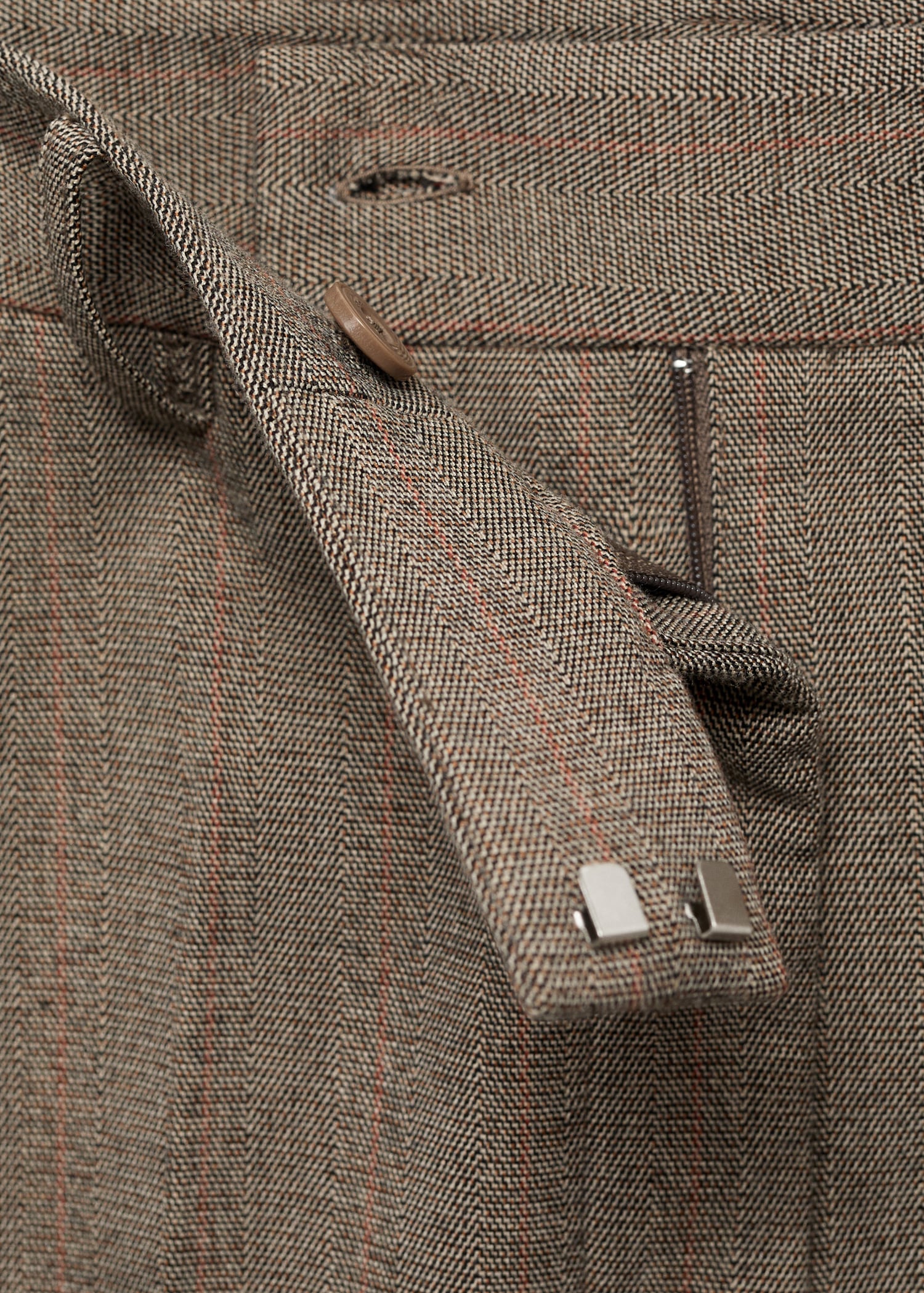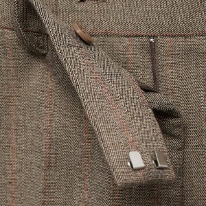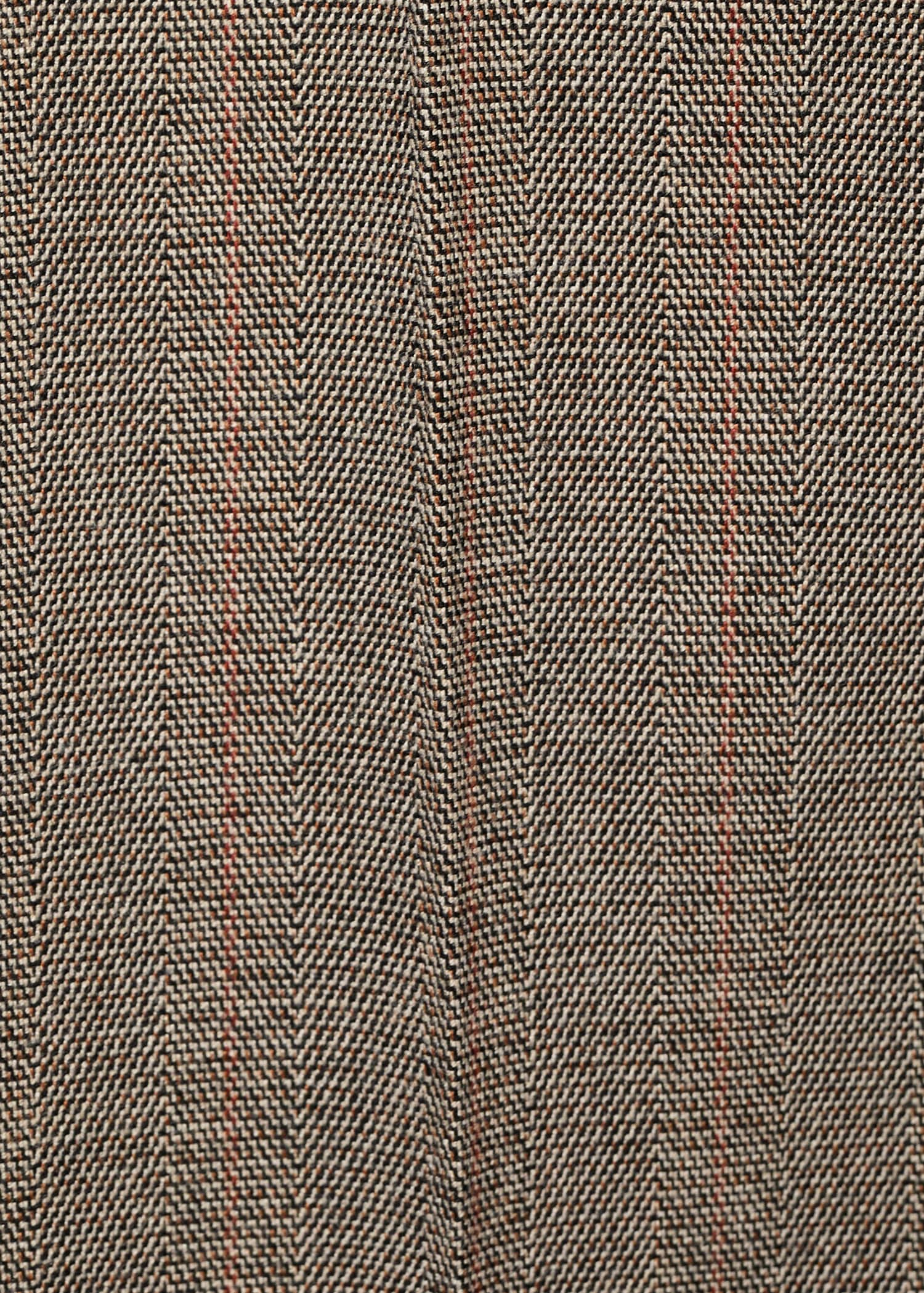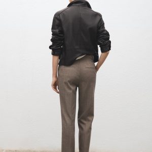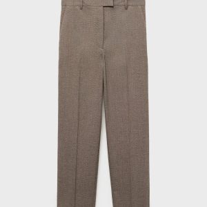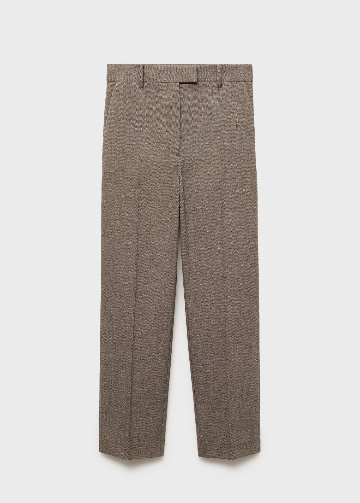 Crop design. Fitted design. Pinstripe design. Mid-rise. Belt loops. Two side pockets. Zipper, button and concealed hook-and-loop fastener with placket. Inner lining. Available Plus