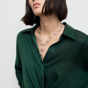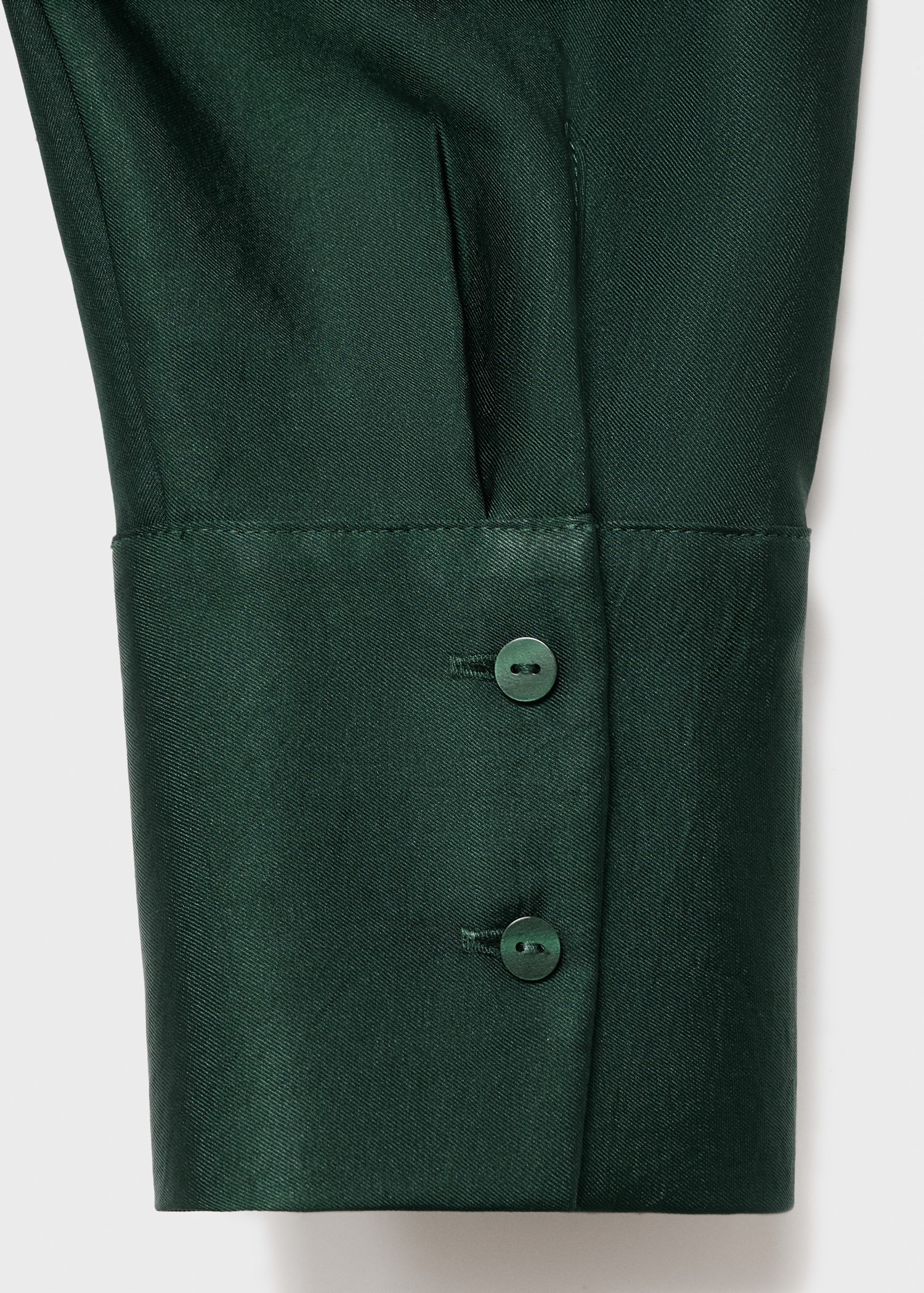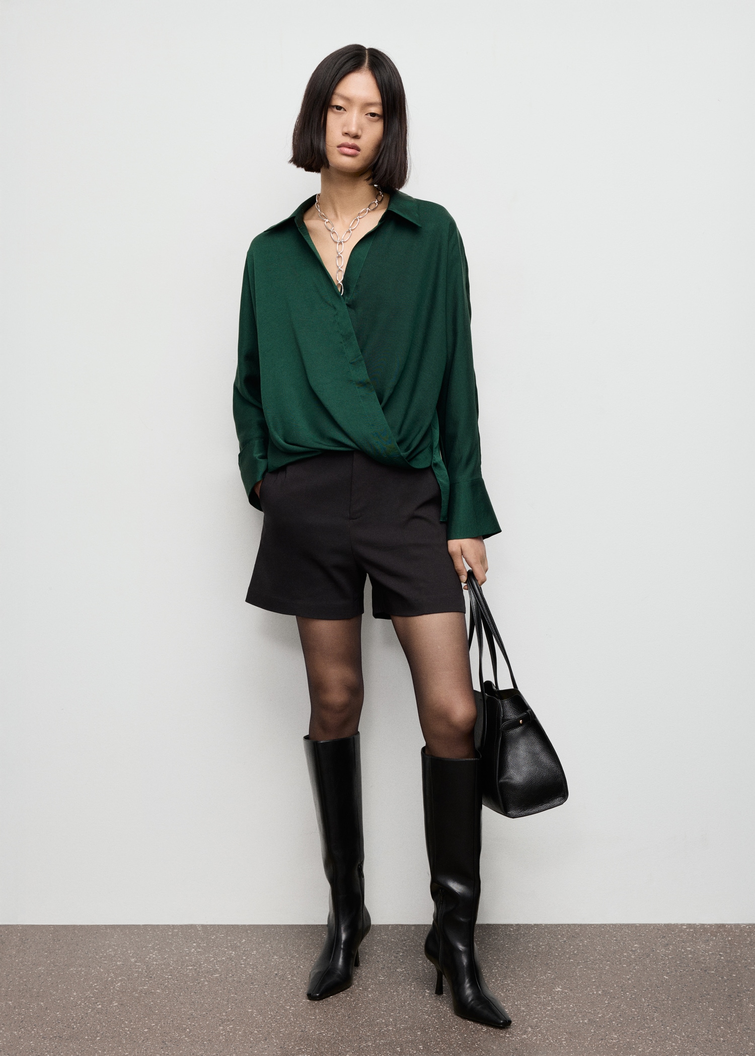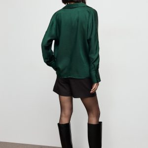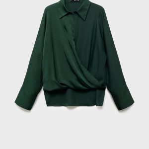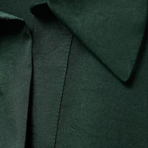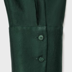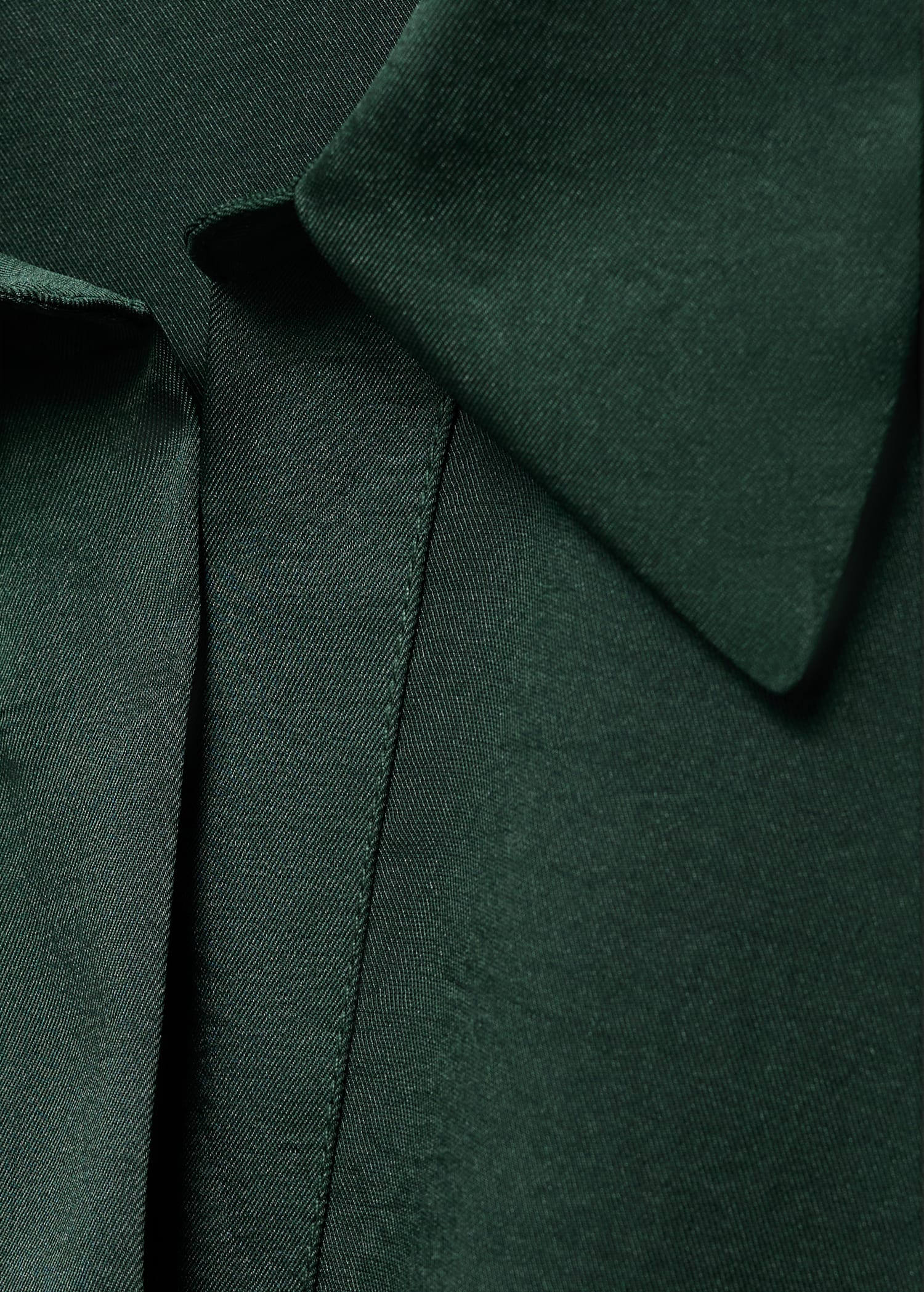 Crafted from satin fabric, this garment features a wrap design with a shirt collar. The long sleeves have buttoned cuffs, and the front fastening includes hidden buttons.