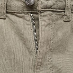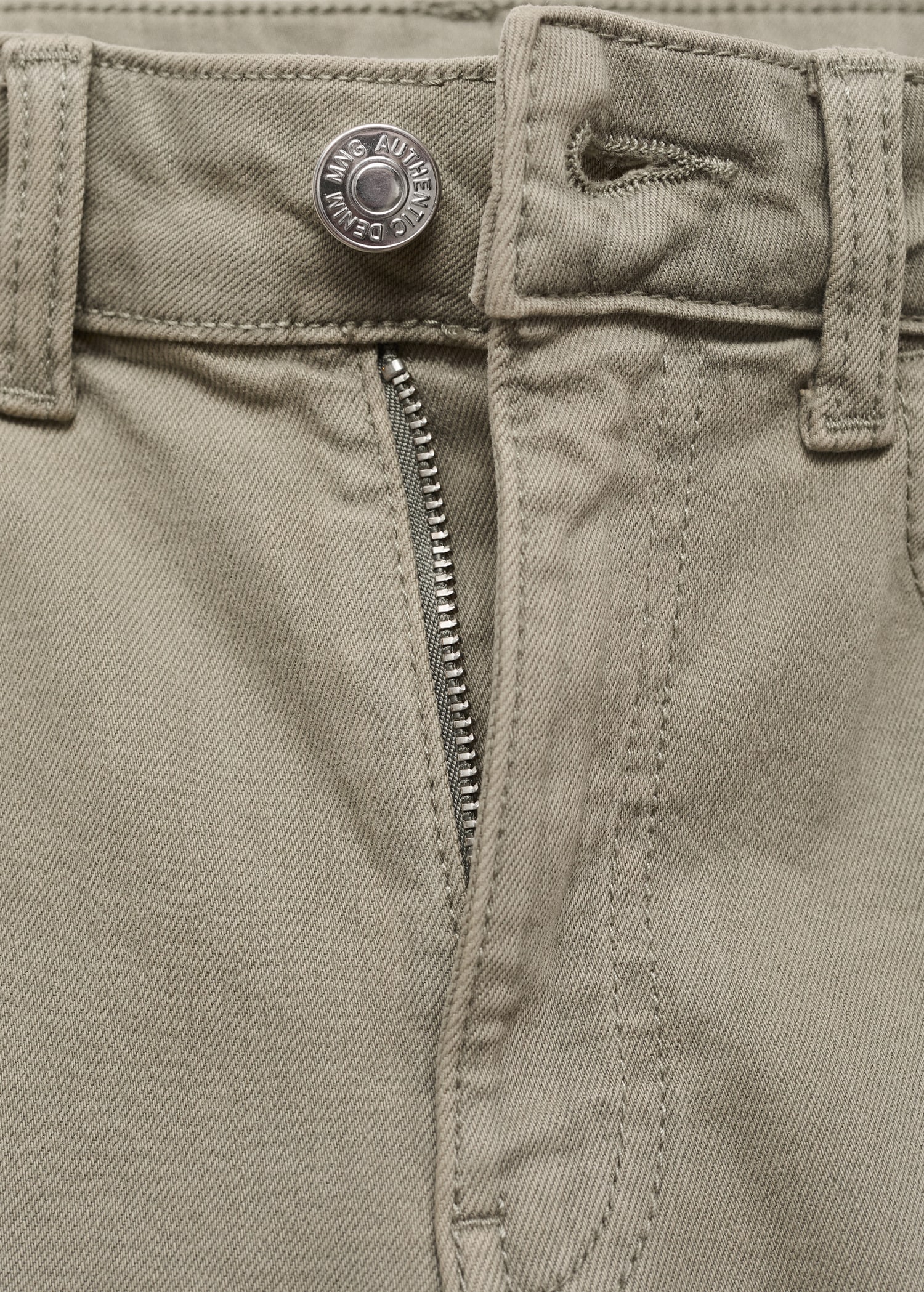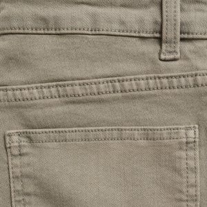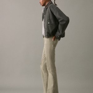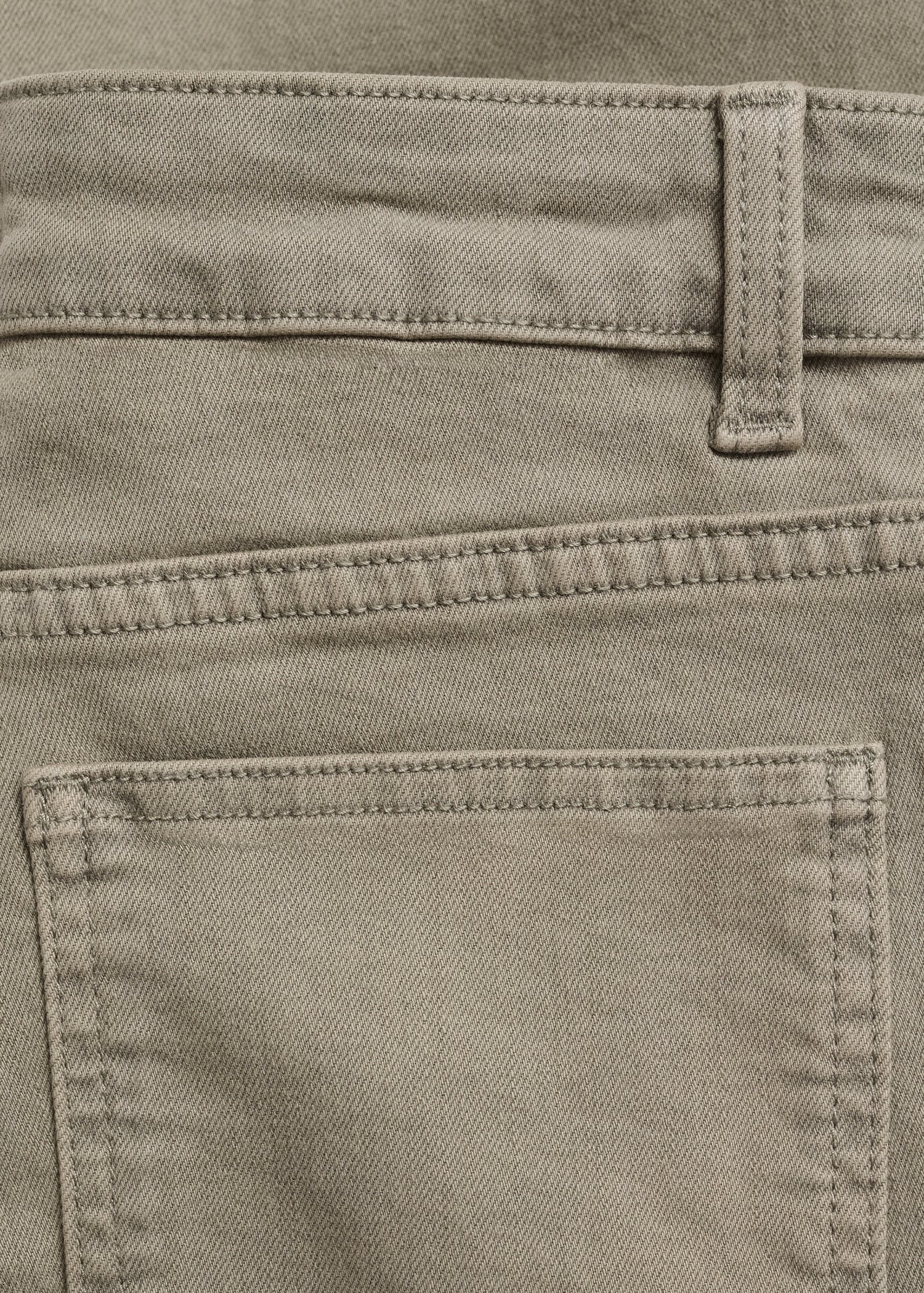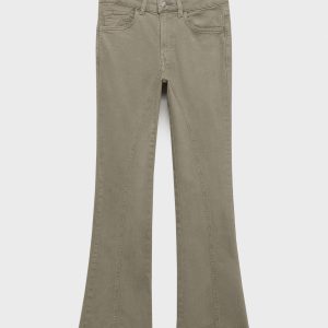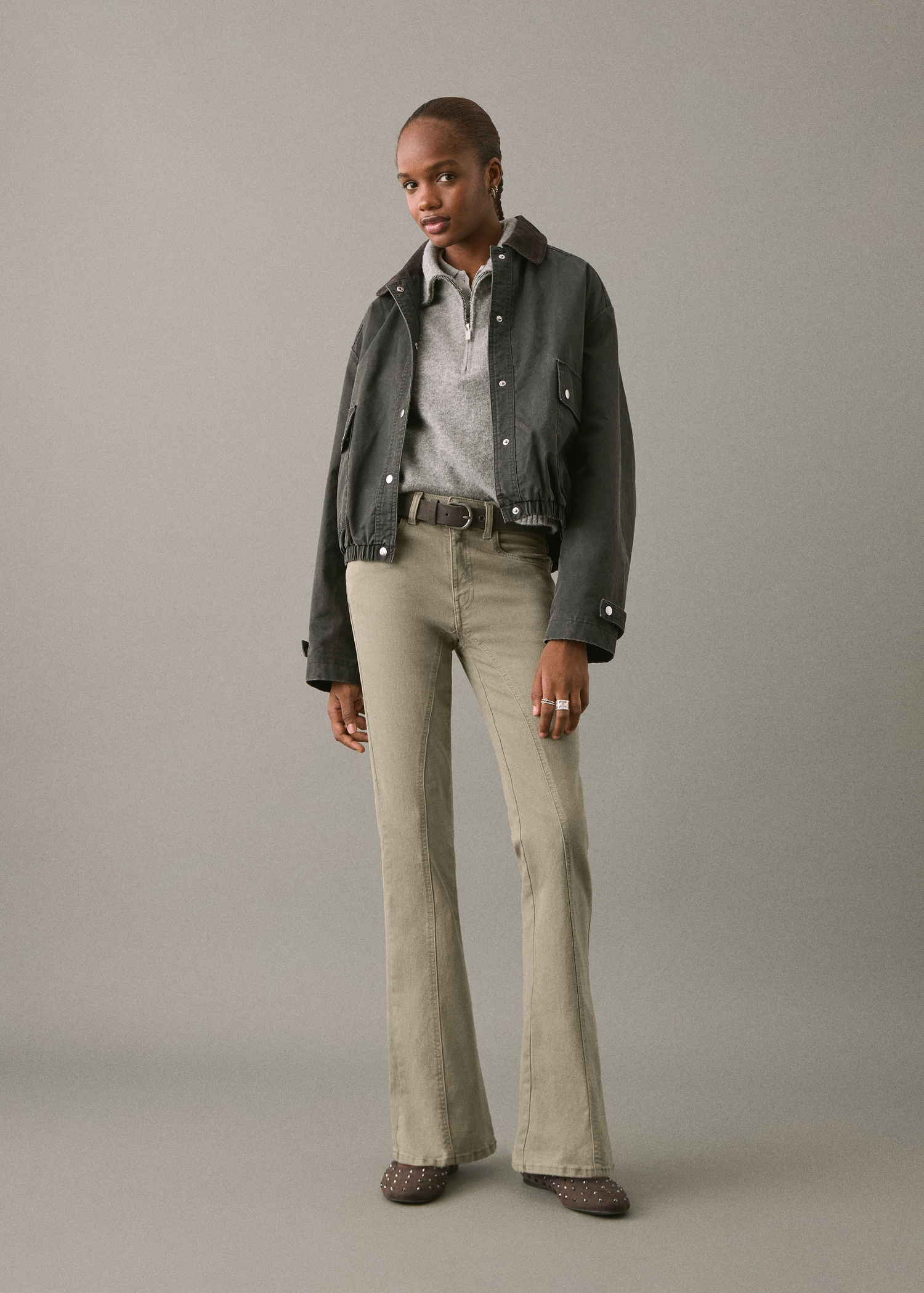 Cotton fabric. Stretch fabric. Long design. Flare design. Regular Waist Rise. Belt loops. Button and zipper closure. Coin pocket. Two side pockets. Two patch pockets at the back. Decorative seams
