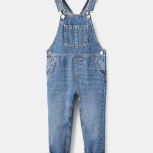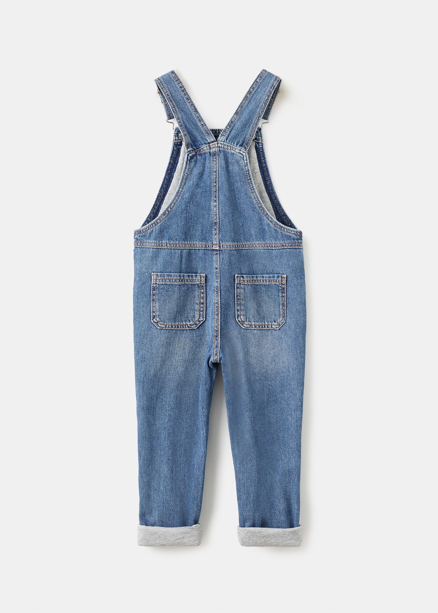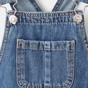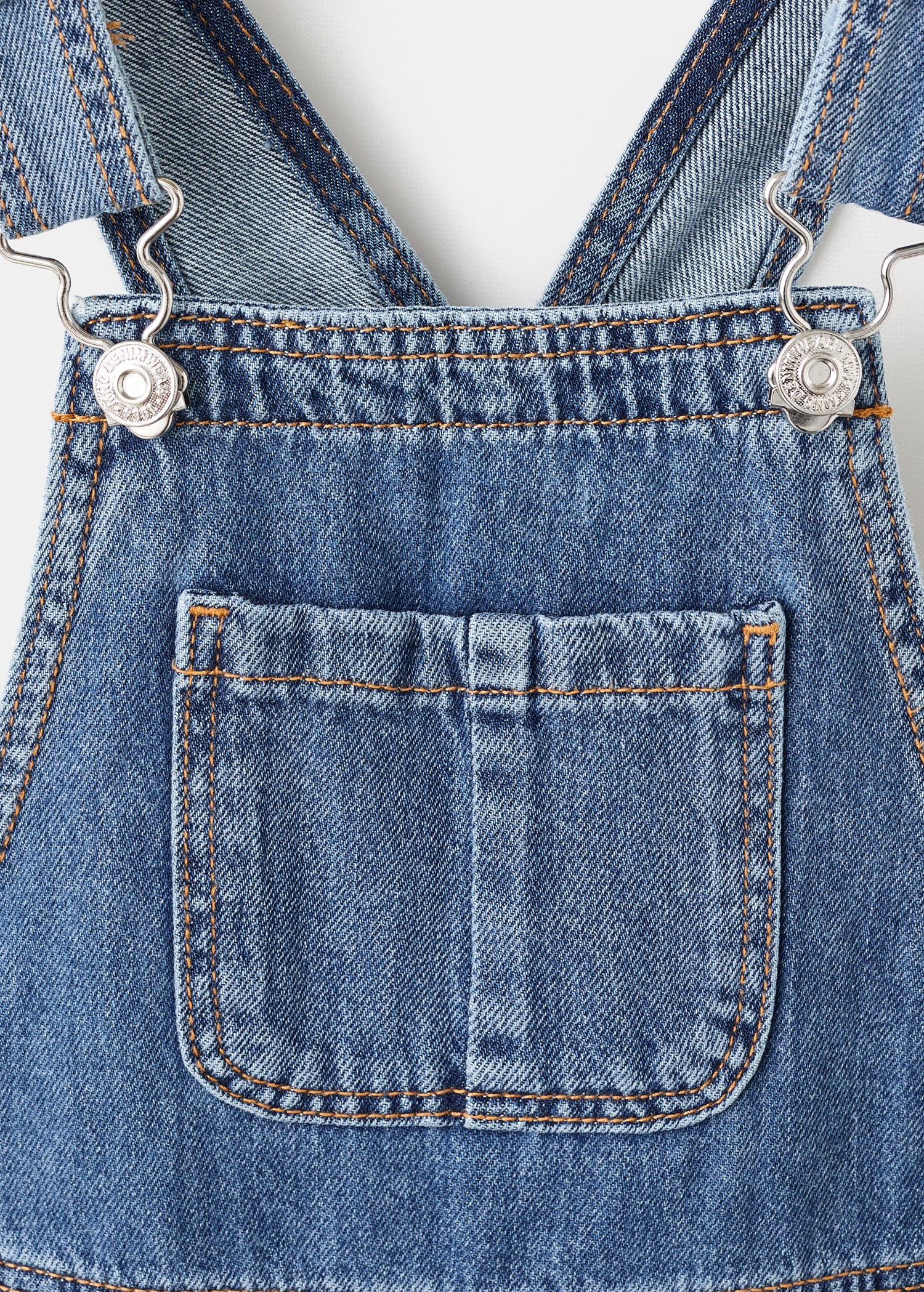 100% cotton fabric. Long design. Straight neckline. Adjustable straps. Straps with button closure. Side button closure. Patch pocket on the chest. Two side pockets. Two patch pockets at the back