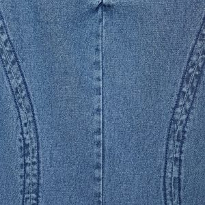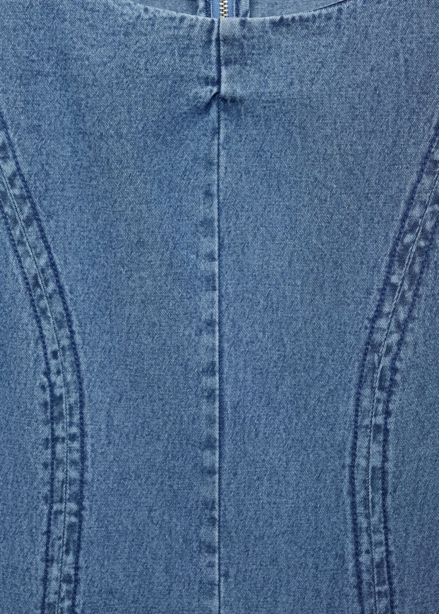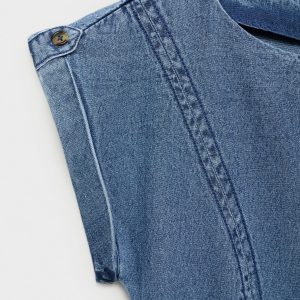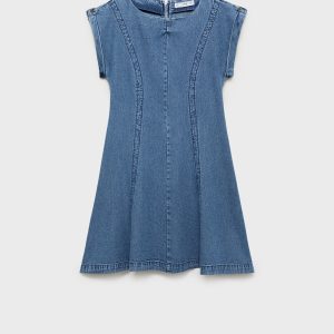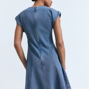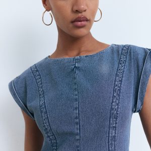 Cotton denim fabric. Short design. A-line design. Crew neck. Short sleeves with turn-up cuffs. Stitching detail. Back zipper closure. This garment is part of our casual collection, designed to stylishly accompany you in your day-to-day life