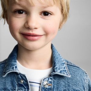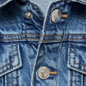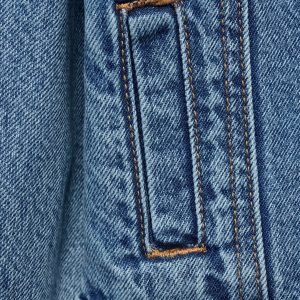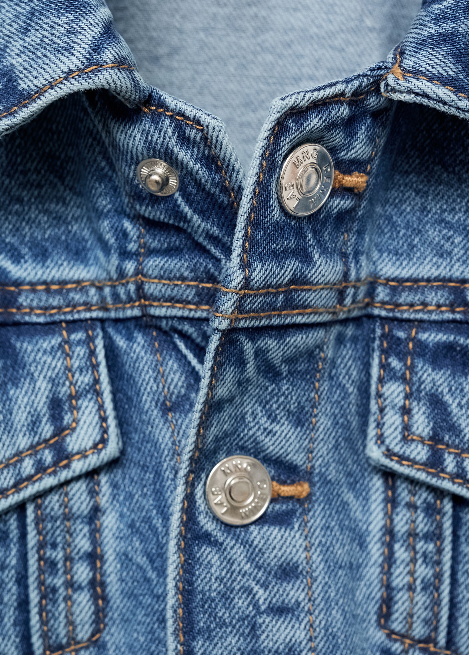 Cotton denim fabric. Straight Design. Shirt collar. Long sleeves with buttoned cuffs. two flap and button pockets on the front. Two side pockets. Front button closure