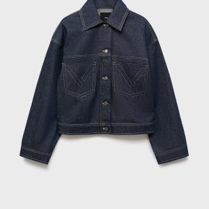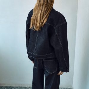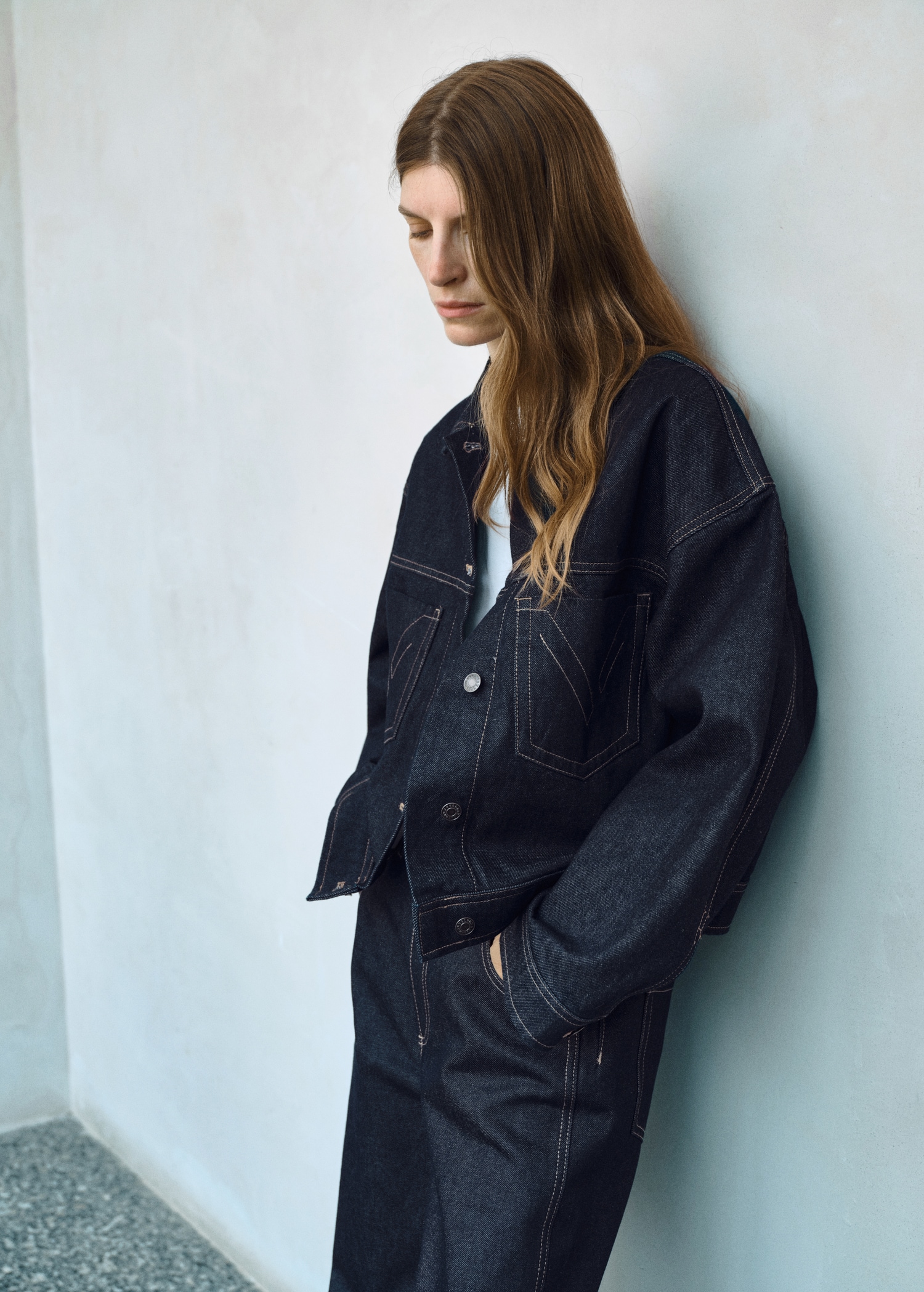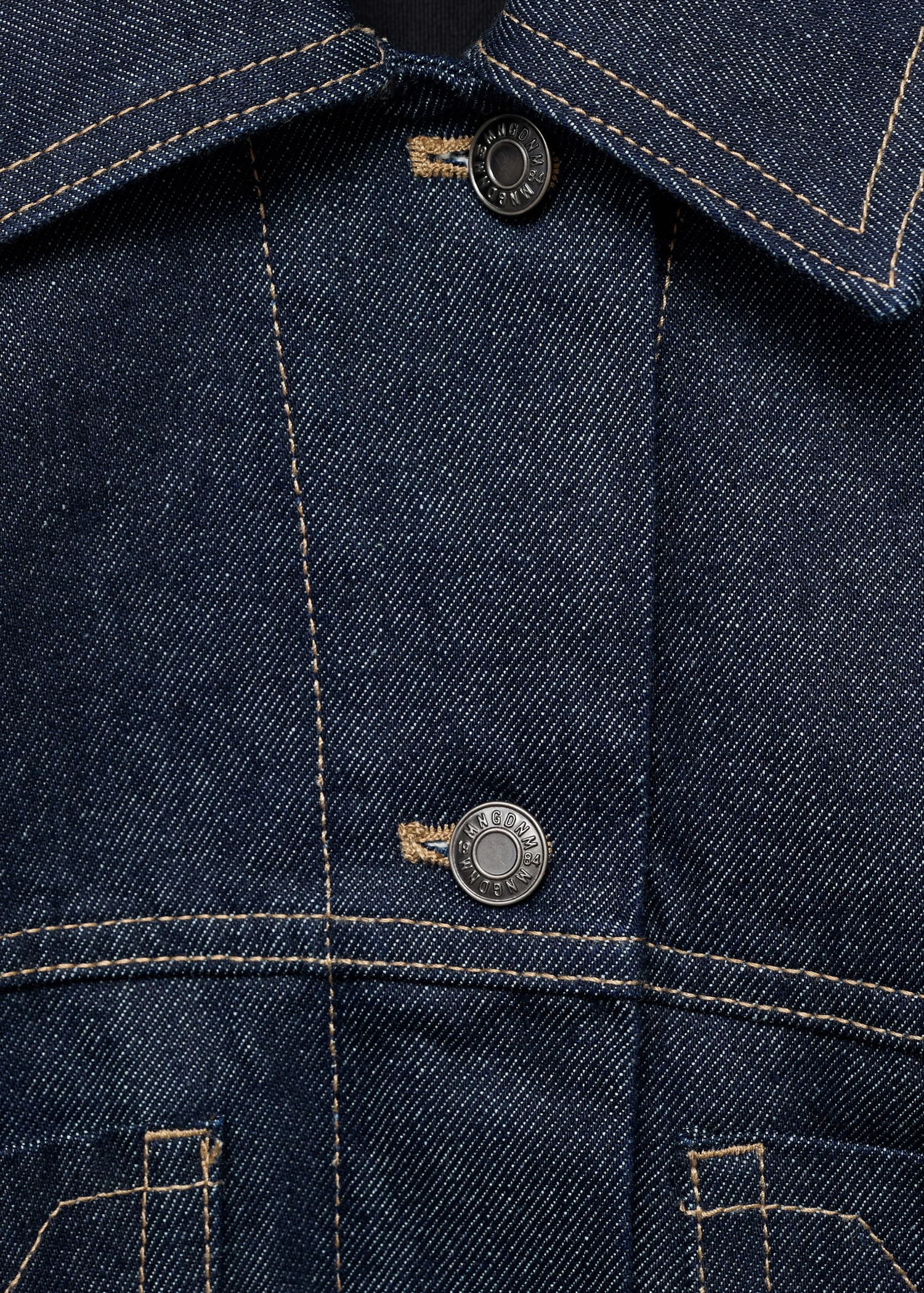 Cotton denim fabric. Straight Design. Shirt collar. Long Sleeve. Two patch pockets at chest. Decorative seams. Front button closure. Total look