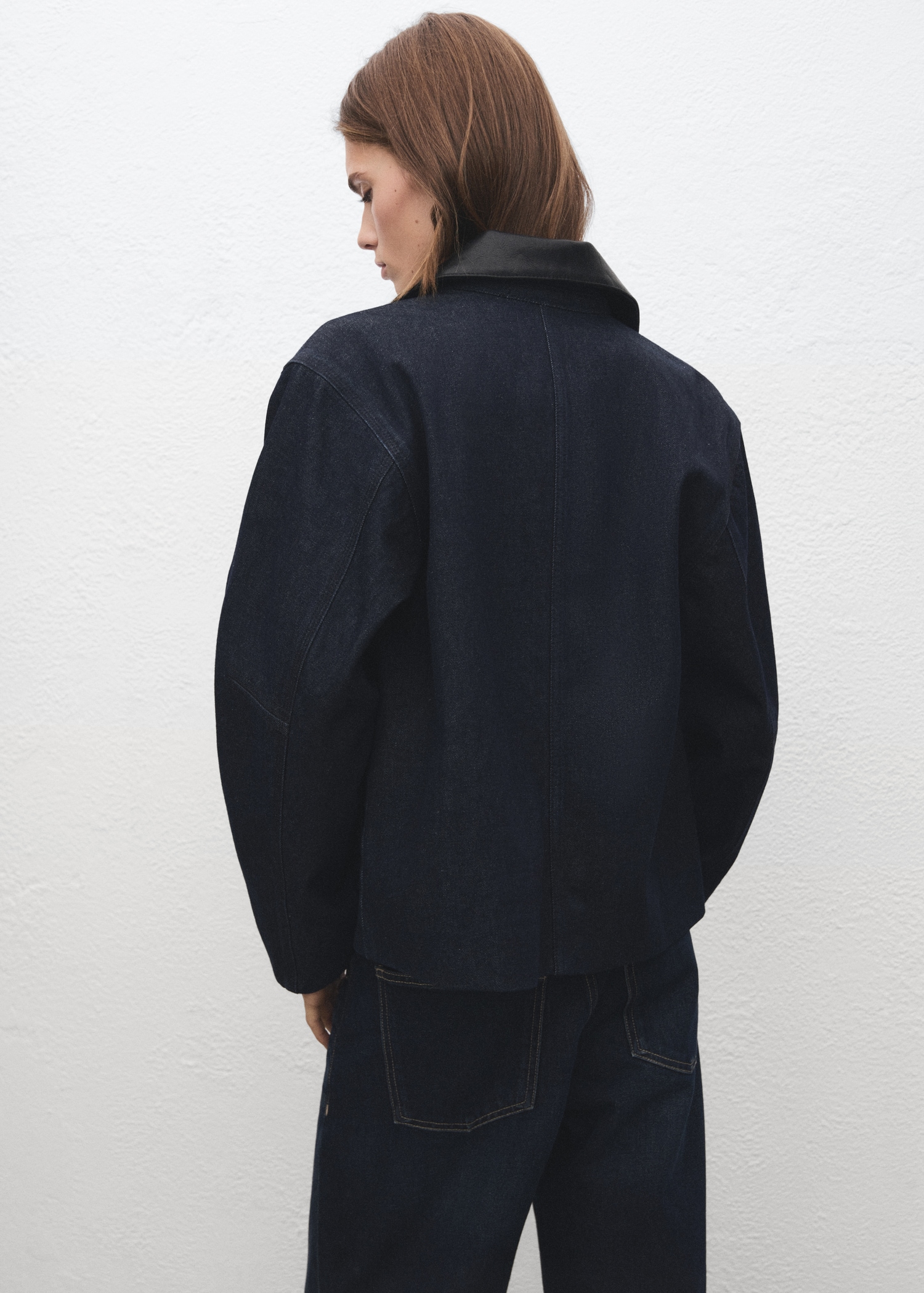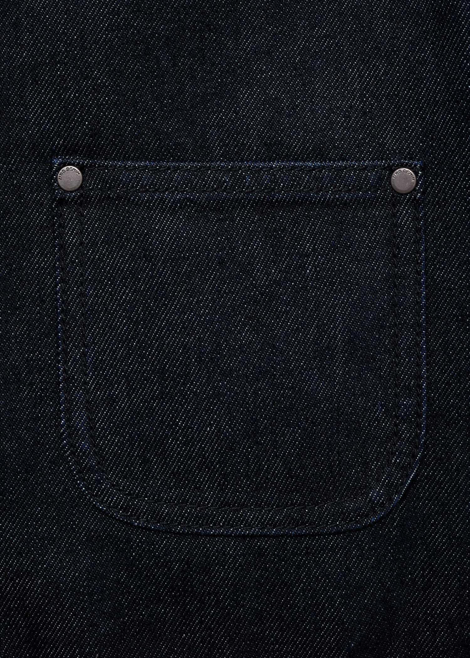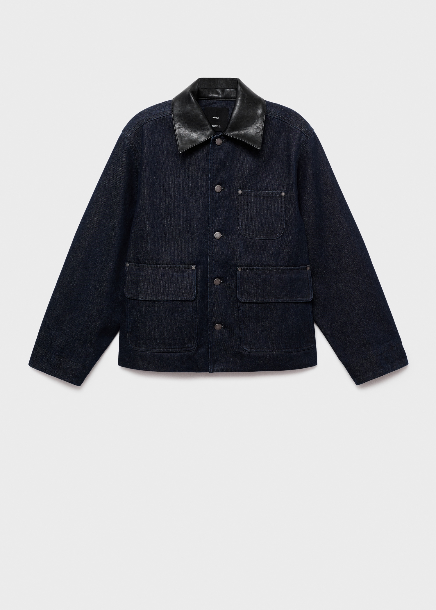 Cotton denim fabric. Straight Design. Leather-effect shirt collar. Long Sleeve. Patch pocket on the chest. Two patch pockets and front flap pockets. Front button closure. Total look