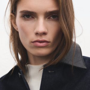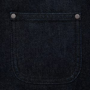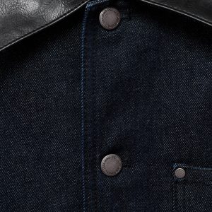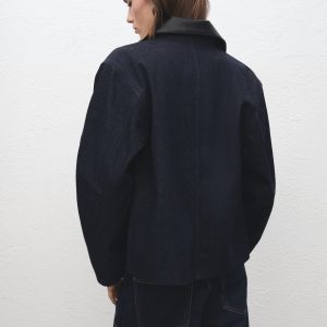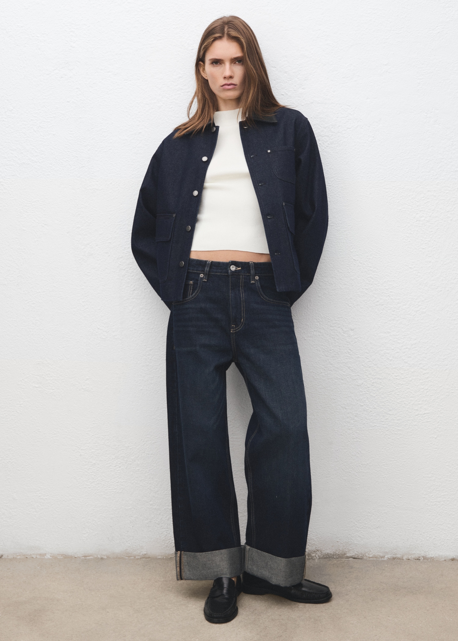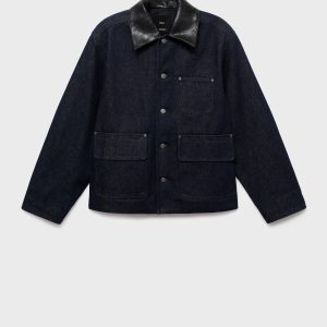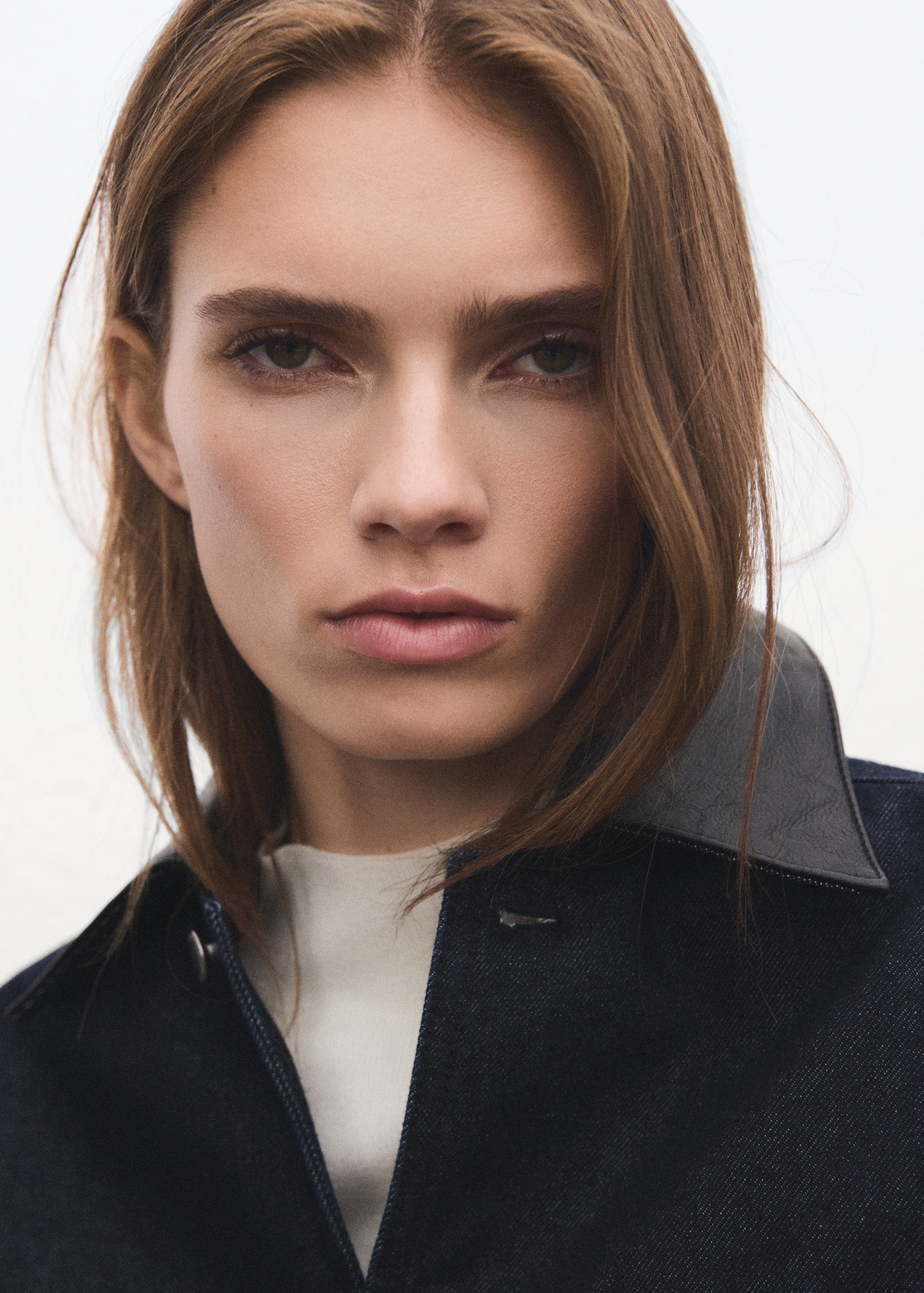 Cotton denim fabric. Straight Design. Leather-effect shirt collar. Long Sleeve. Patch pocket on the chest. Two patch pockets and front flap pockets. Front button closure. Total look