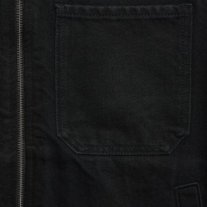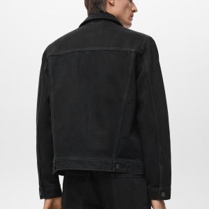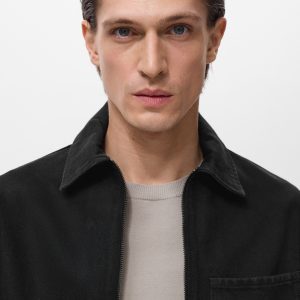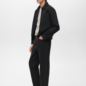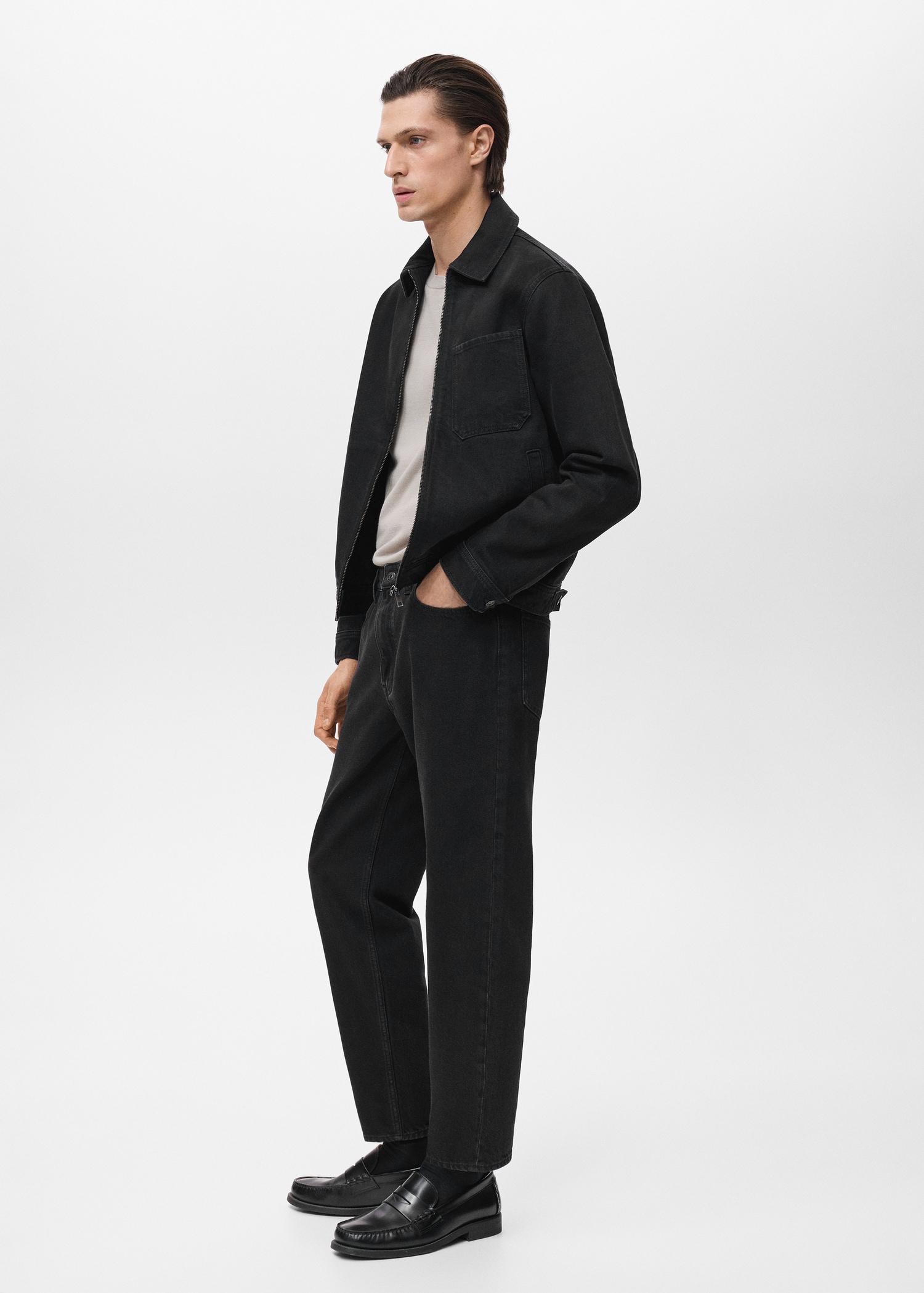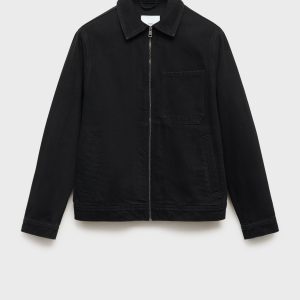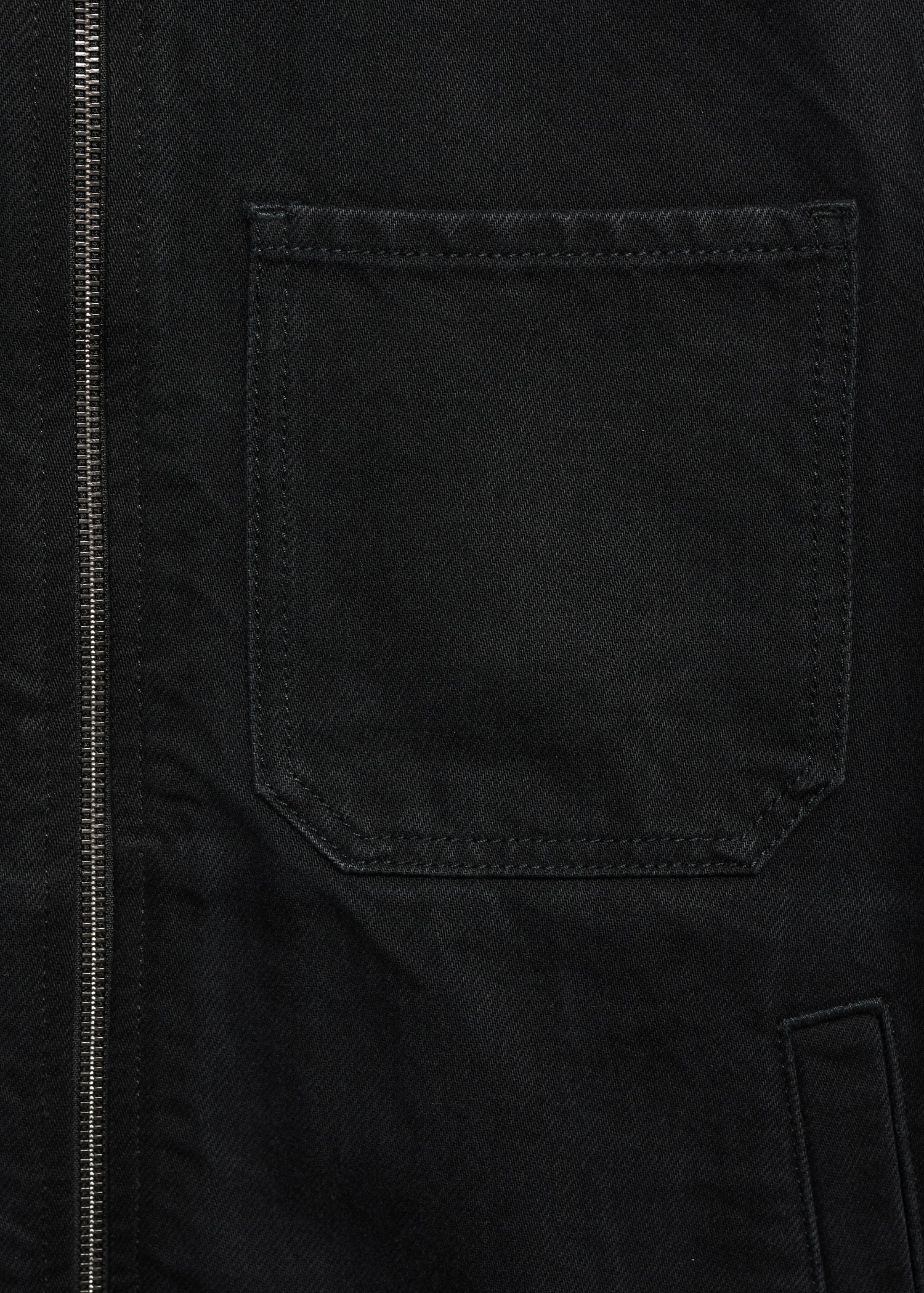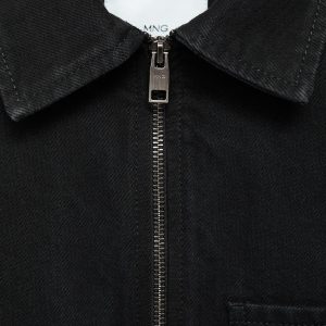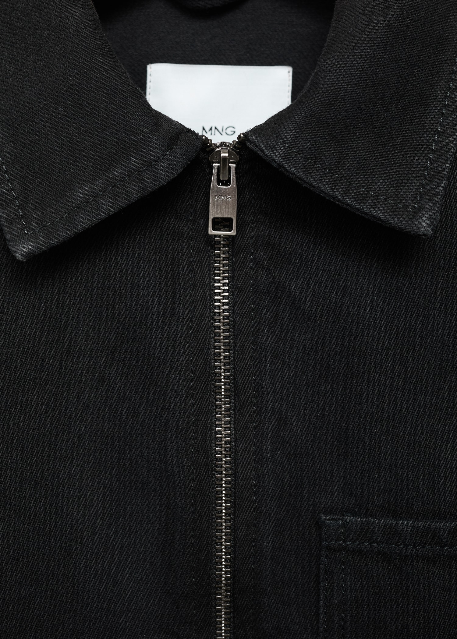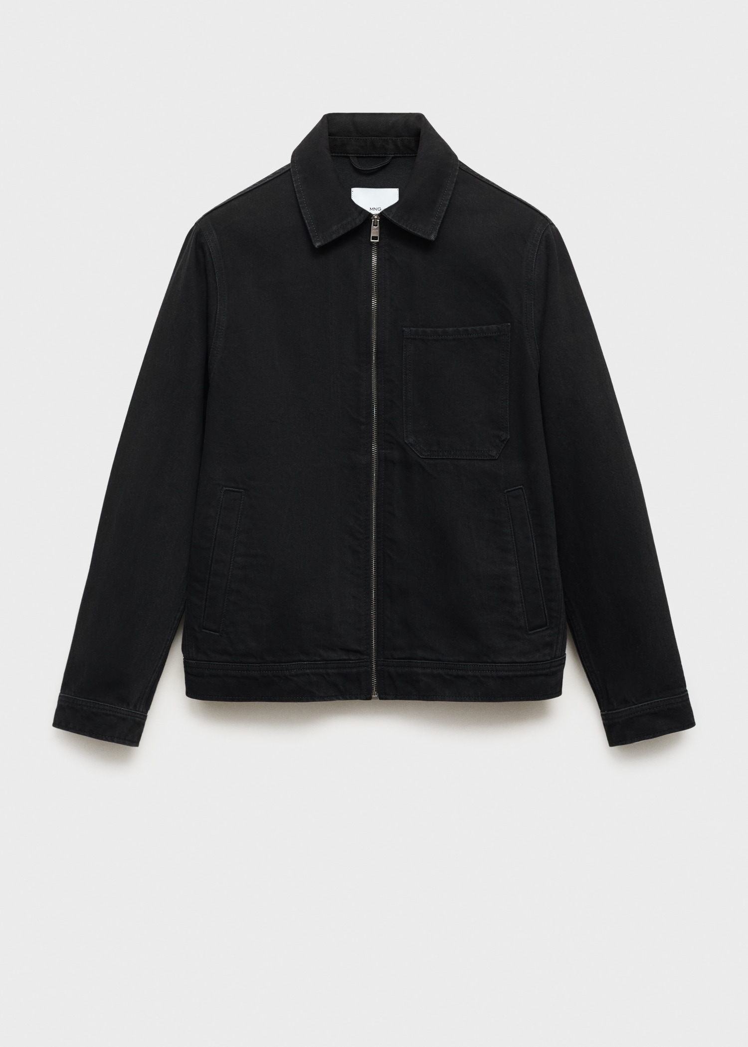 Slim fit. 100% cotton denim-style fabric. Shirt collar. Front zipper closure. Long sleeves with buttoned cuffs. Two side welt pockets. Adjustable tabs at the back