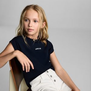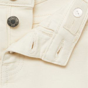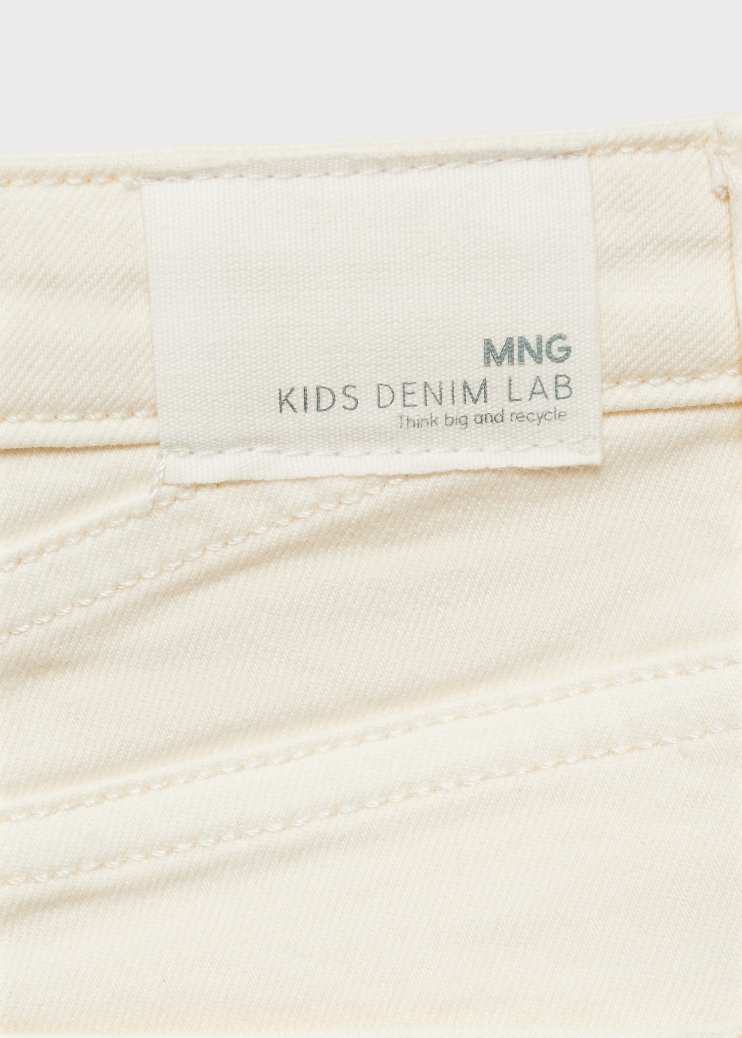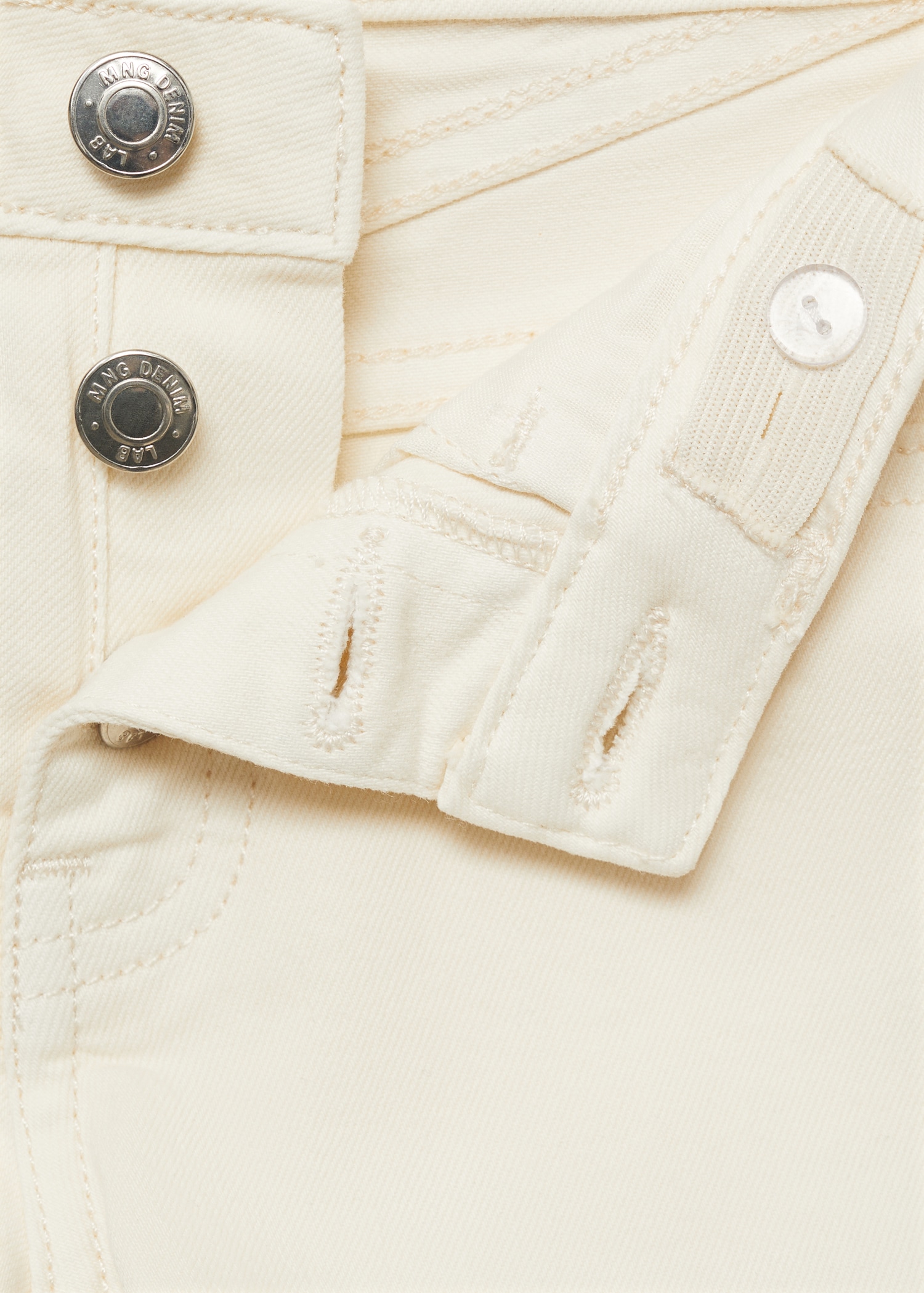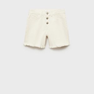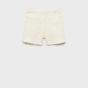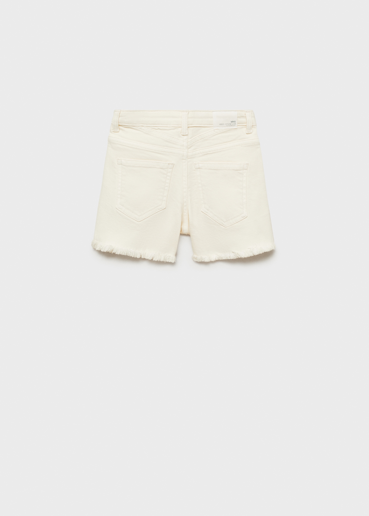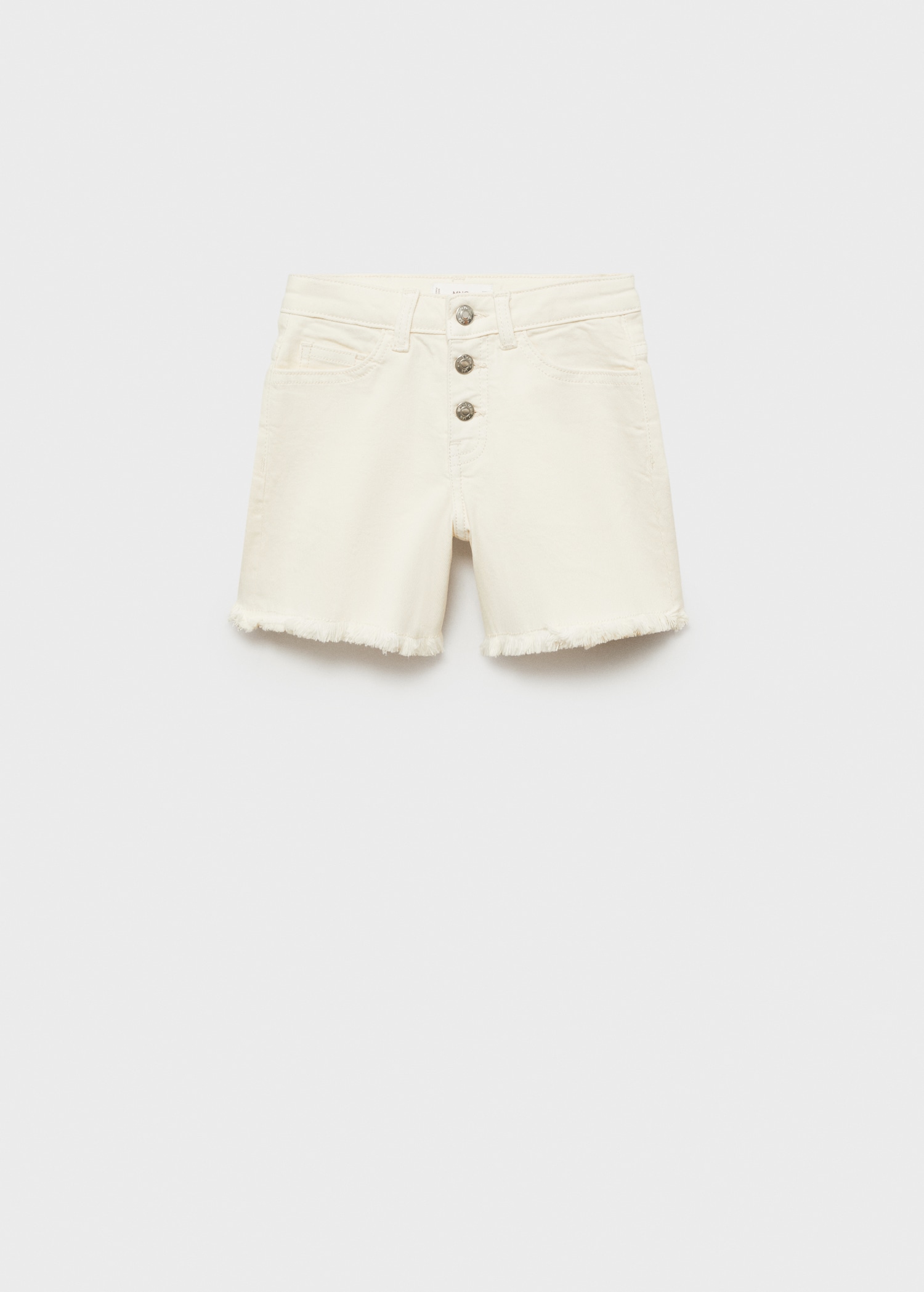 Cotton denim fabric. Straight Design. Short design. Three front pockets. Two patch pockets at the back. Belt loops. Frayed hem. Adjustable waist. Three-button front closure