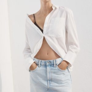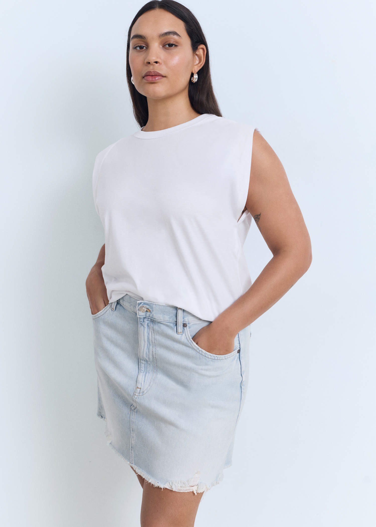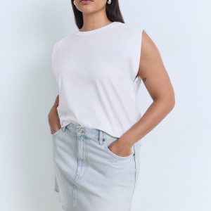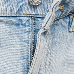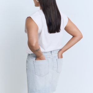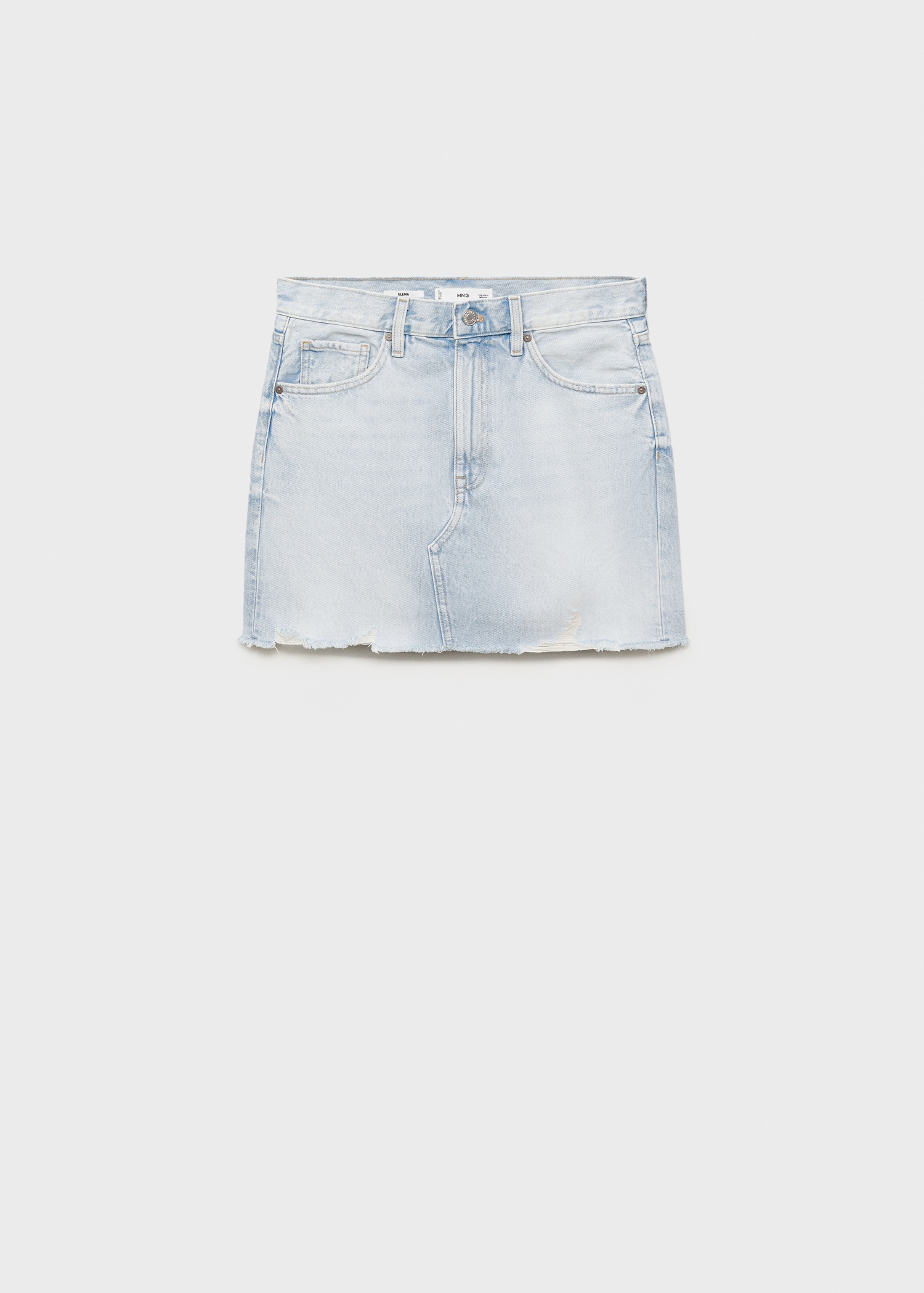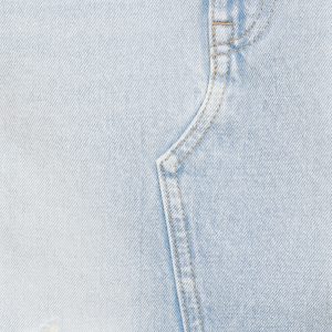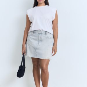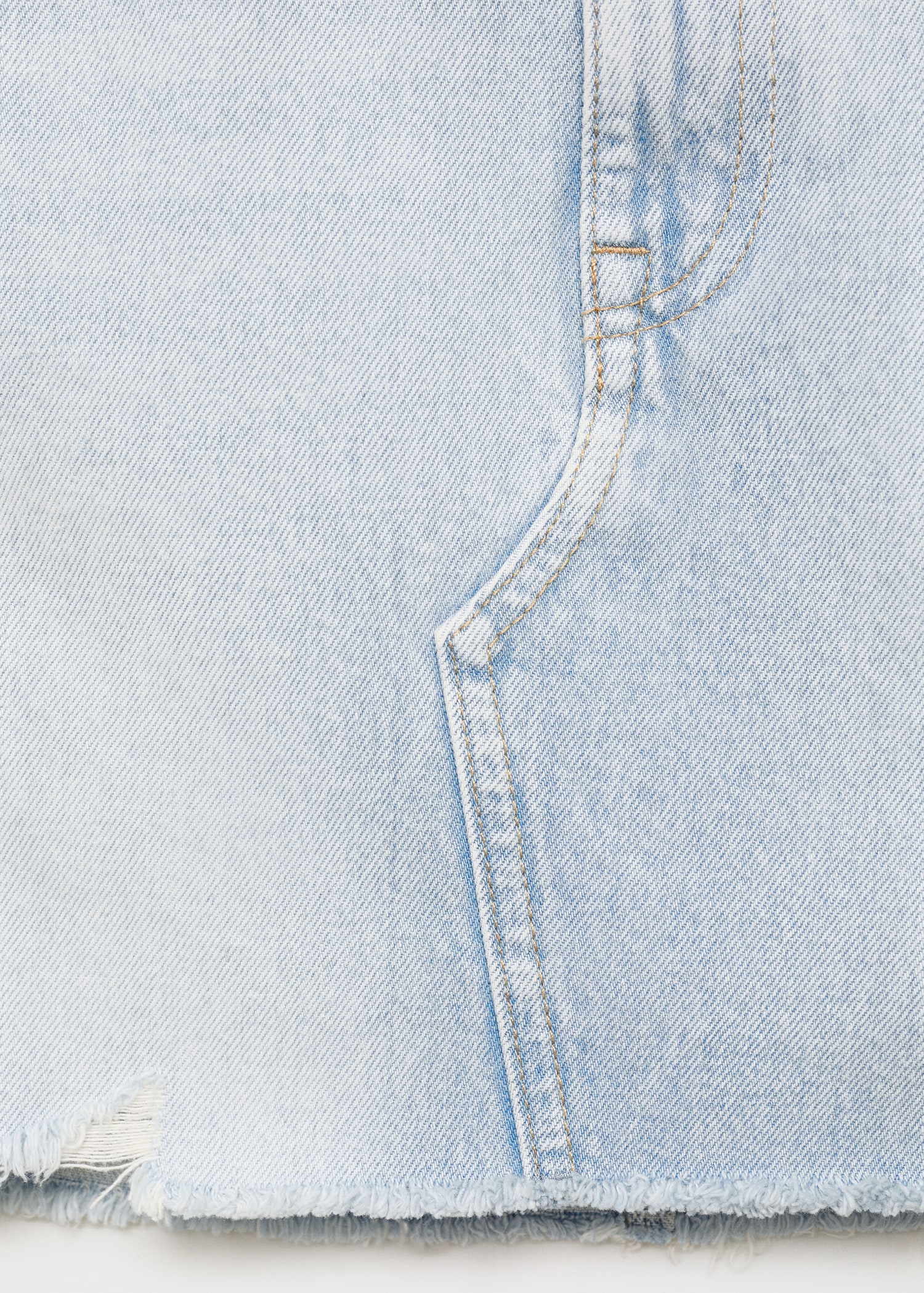 Cotton denim fabric. Short design. Straight Design. High-rise. Belt loops. Five pockets. Frayed hem. Button and zipper closure. Available Plus. Online Exclusive