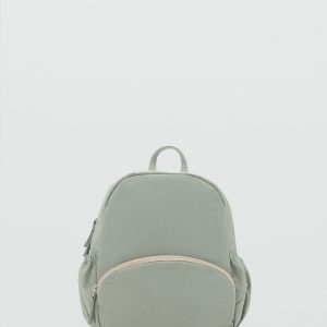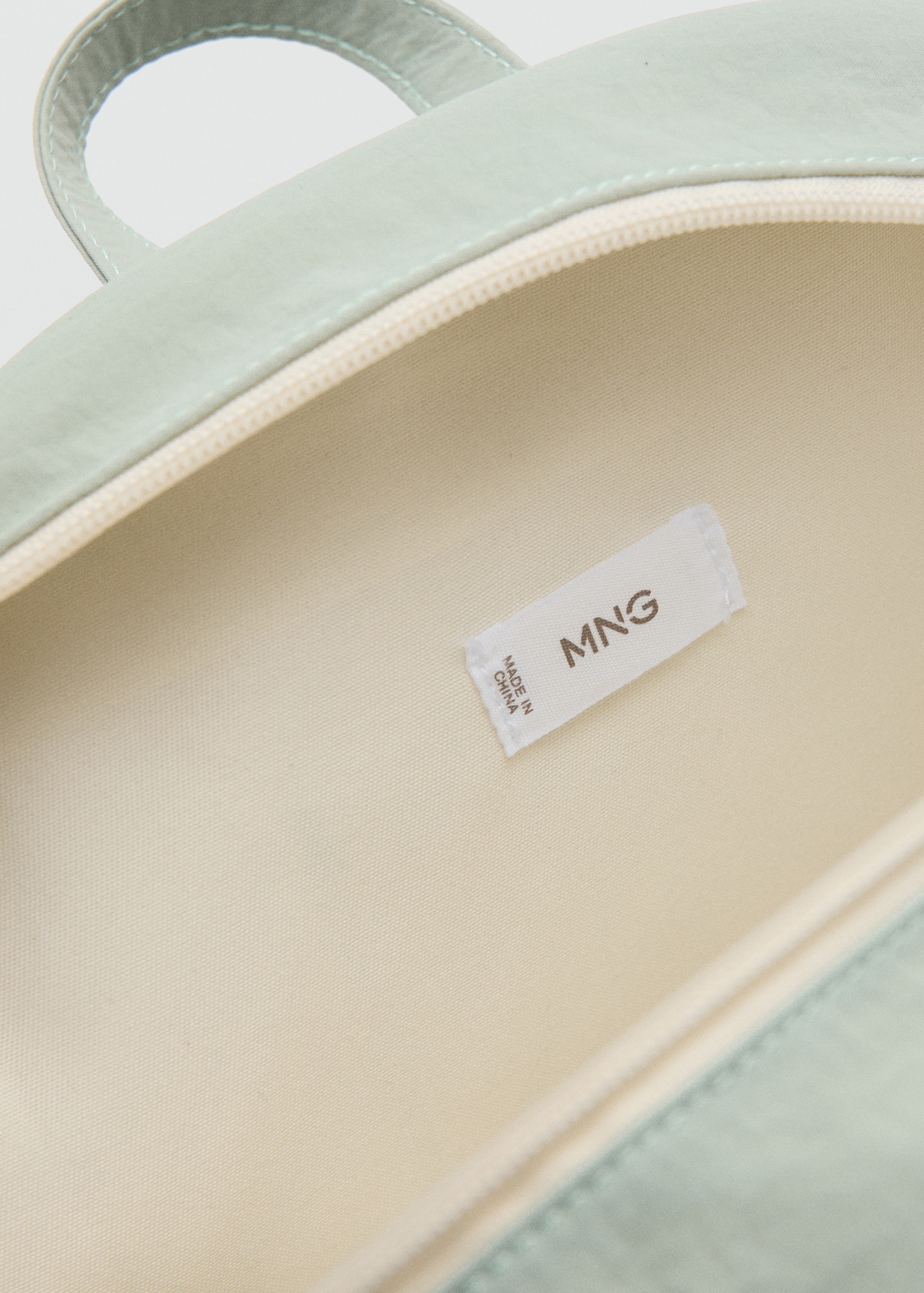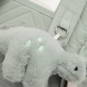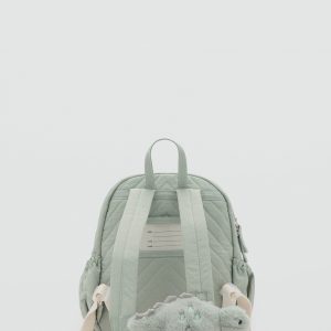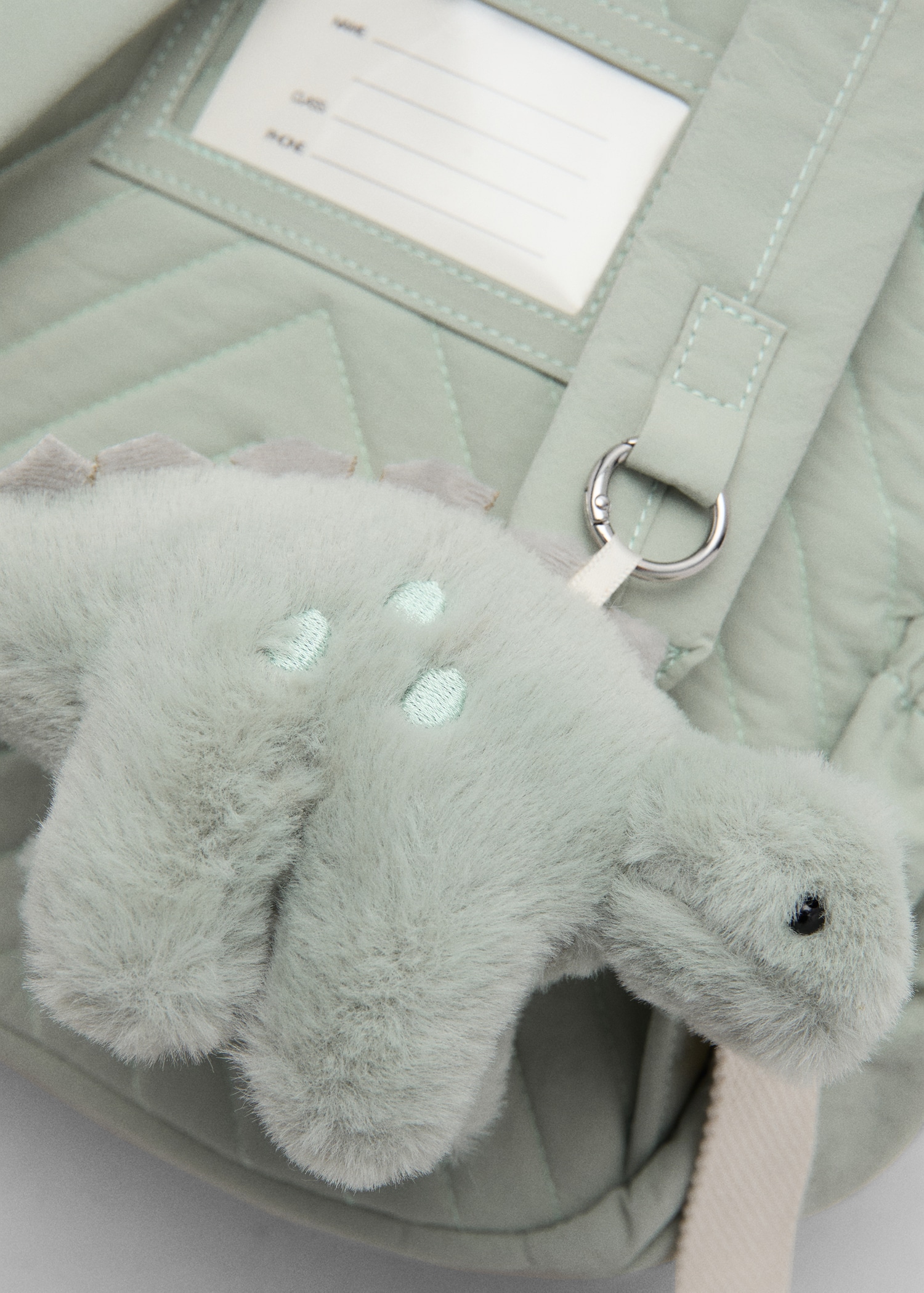 Backpack. Short strap. Double strap. Outside zipper pocket. Two side pockets. Inner lining. Dinosaur charm. Charm detail. Label for personal data. Zipper closure. 9.06×11.02×3.15 in (Length x Height x Width)