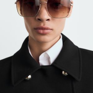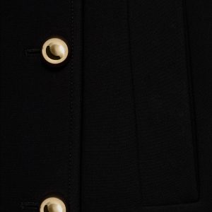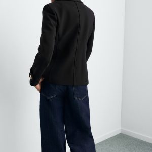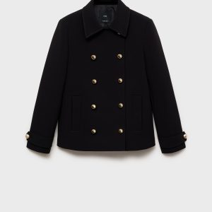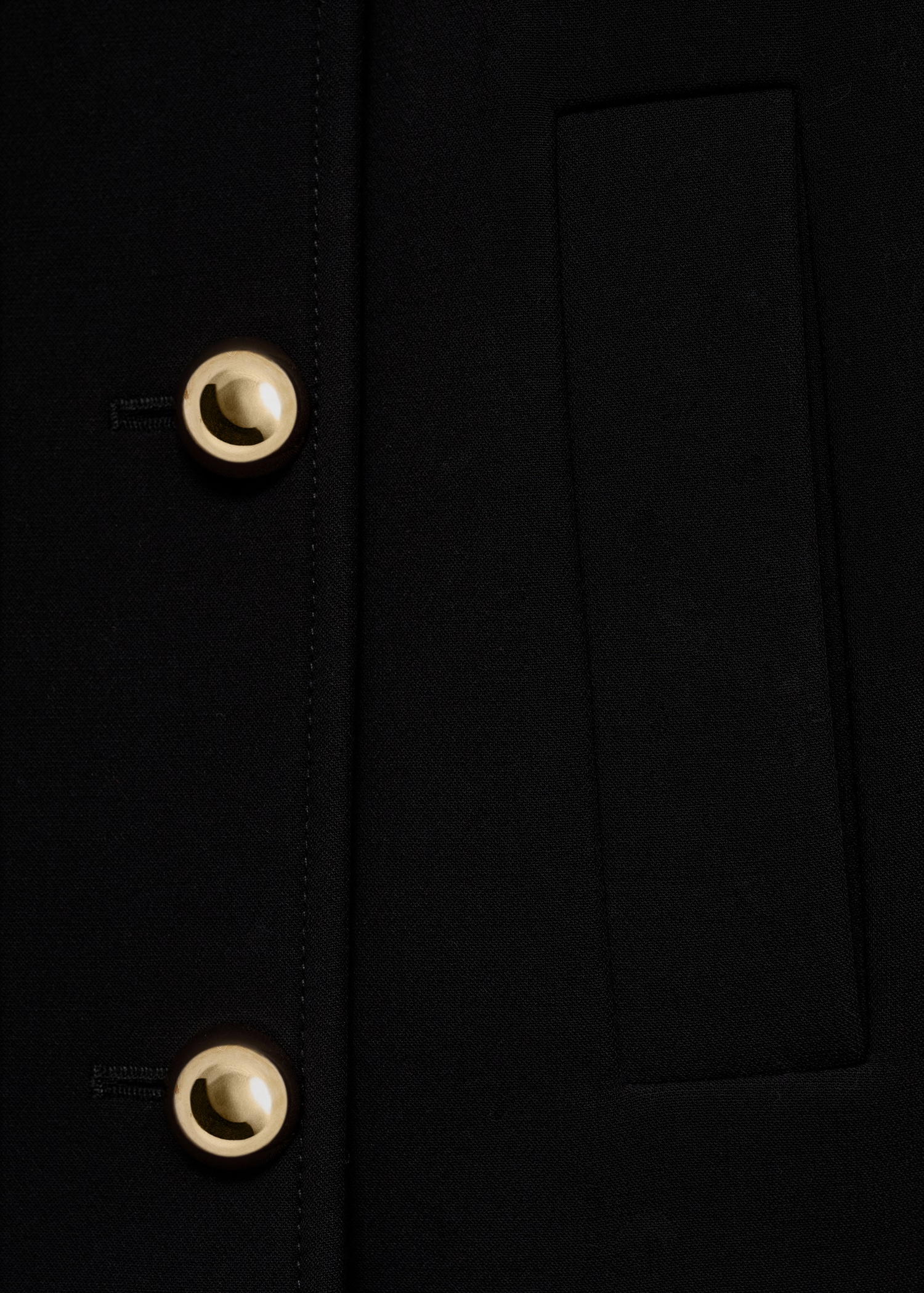 Straight Design. Structured design. Shirt collar. Long sleeves with buttoned cuffs. Two side welt pockets. Double button fastening. Inner lining
