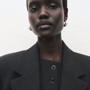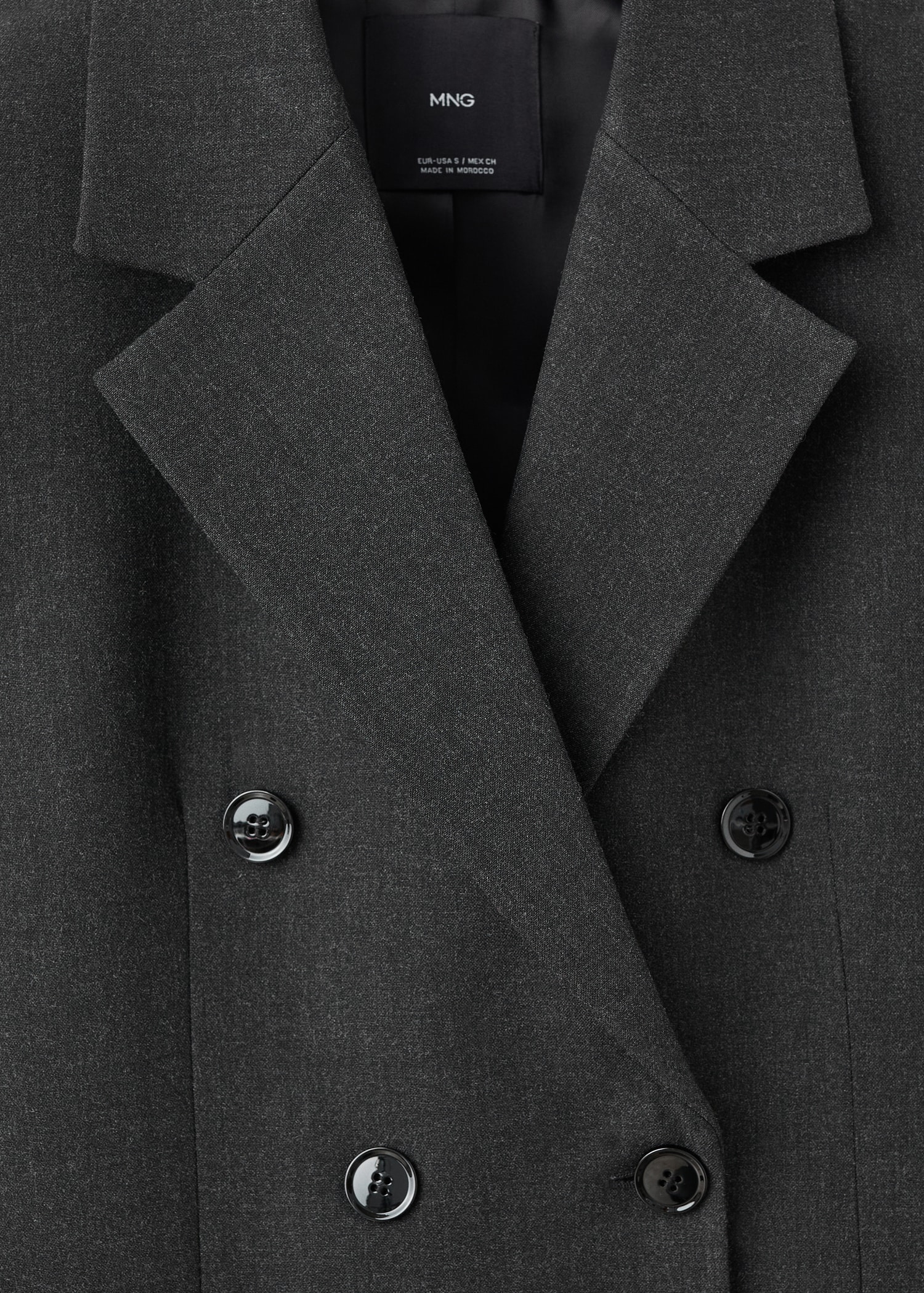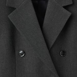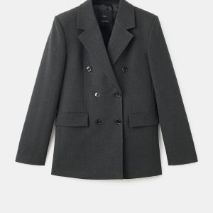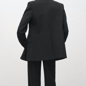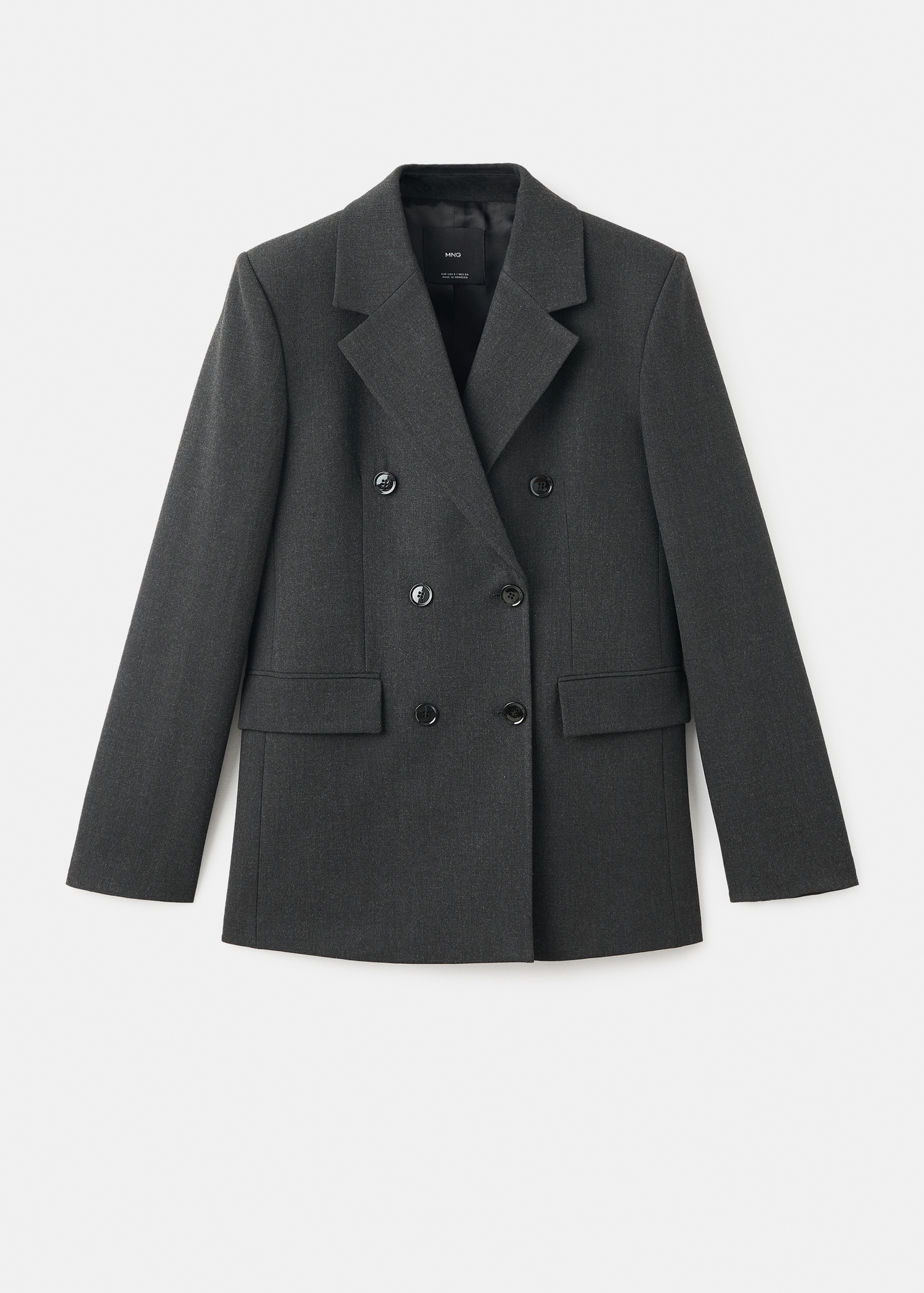 Suit style. Straight design. Lapel-collar V-neck collar. Notch lapels. Long sleeves with buttoned cuffs. Two side pockets with flaps. Double button fastening. Inner lining. Back Slit at the Hem. Total look