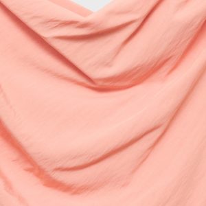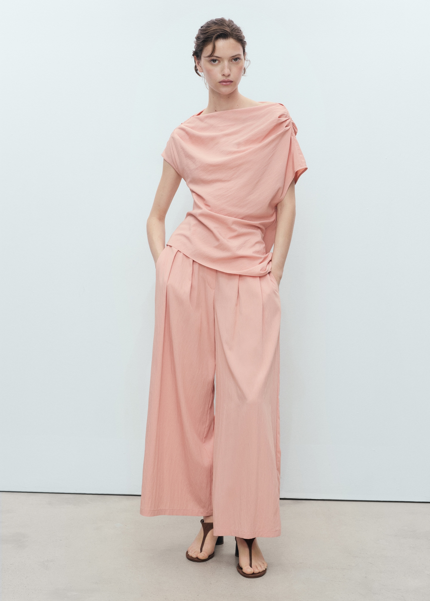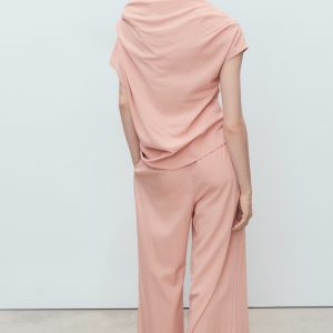 Asymmetric design. Shaved design. Boat neck. Short sleeves. No closure. Total look