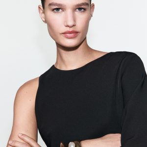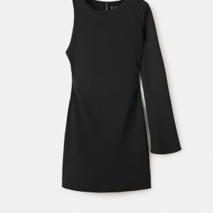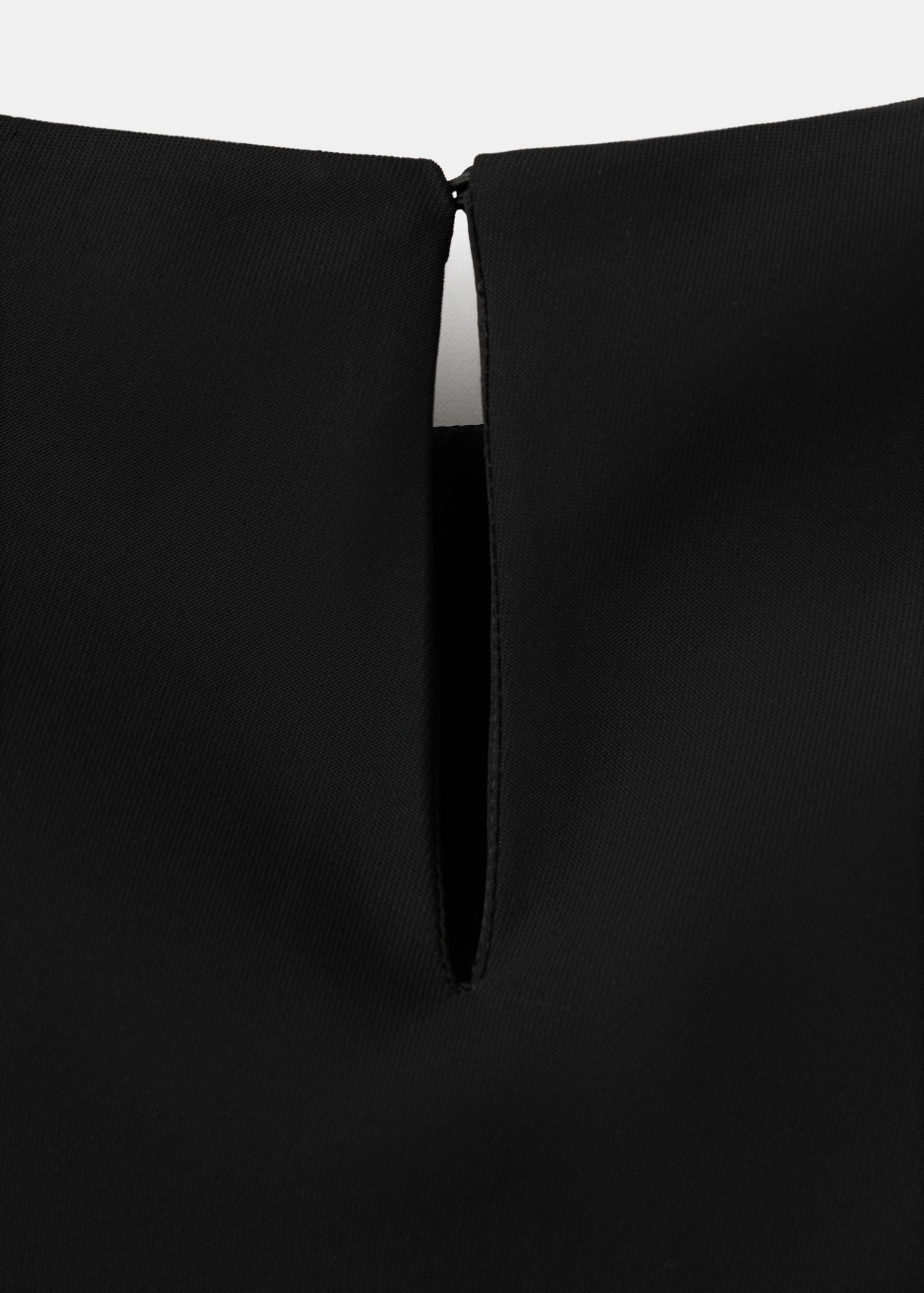 Short design. Fitted design. Crew neck. Asymmetrical sleeves. Side ruffles. Button closure at the back. Inner lining. This garment is part of our party and event collection, designed to elevate your looks for special occasions.