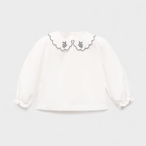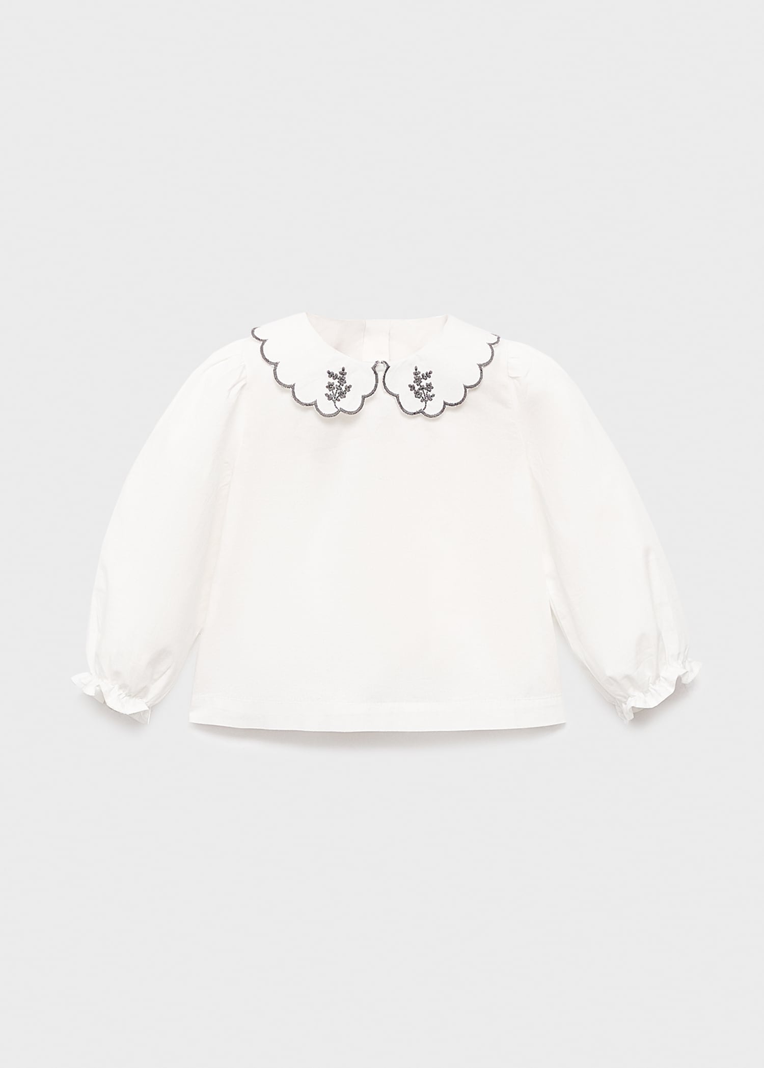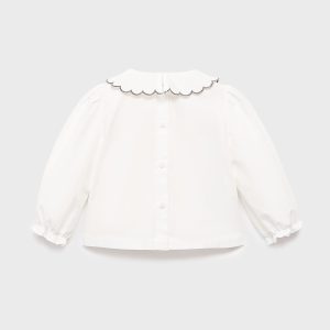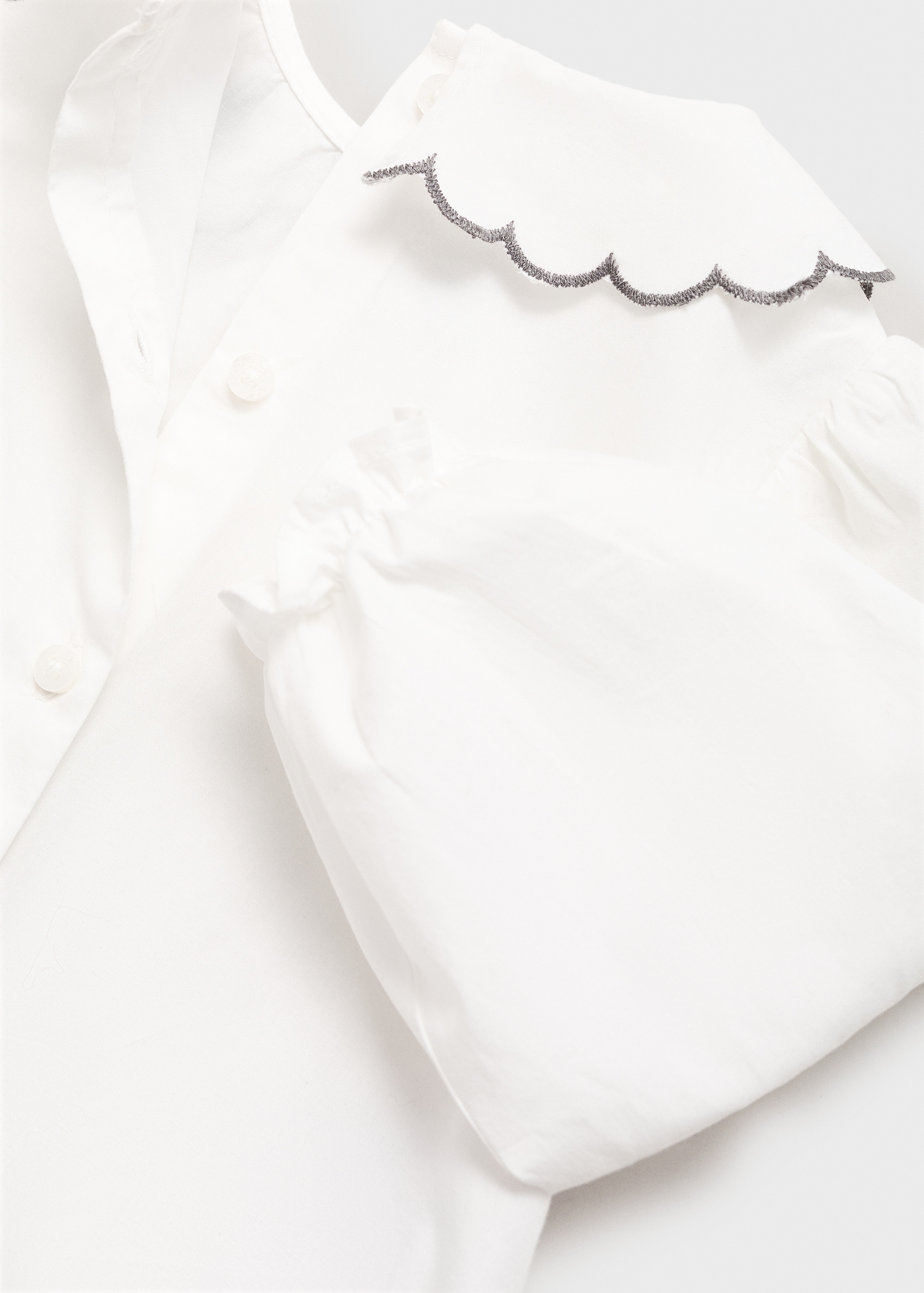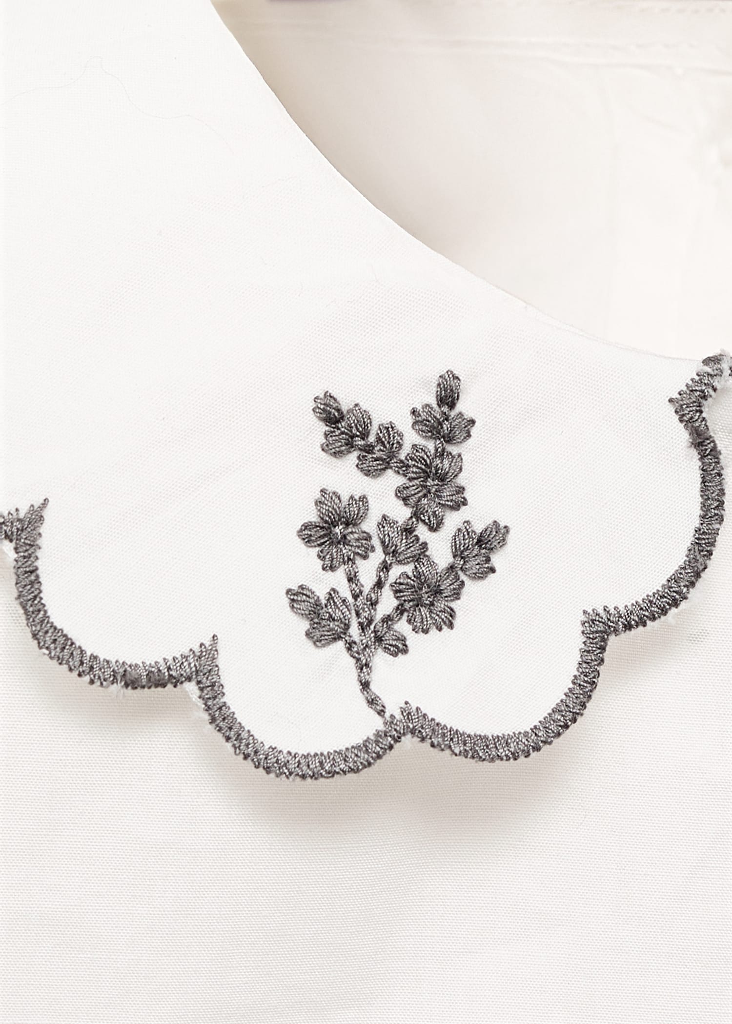 100% cotton fabric. A-line design. Babydoll collar. Button closure at the back. Long sleeves with ribbed trims