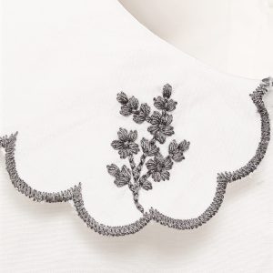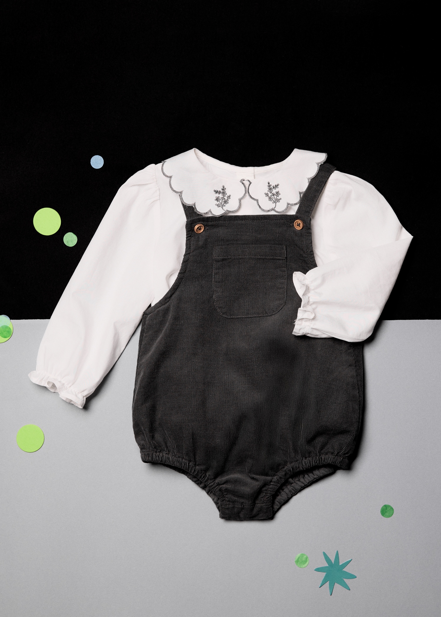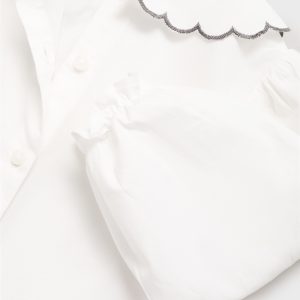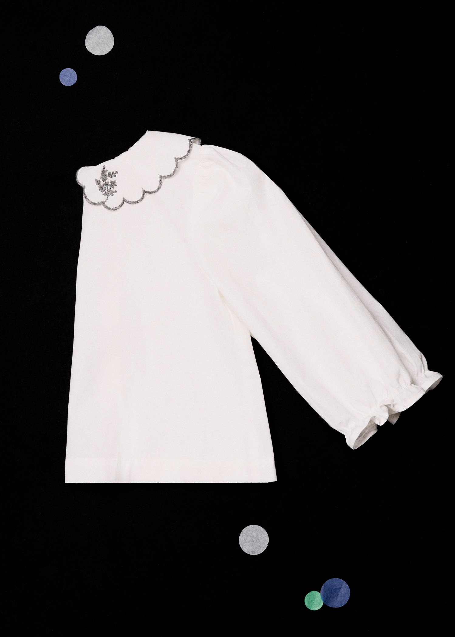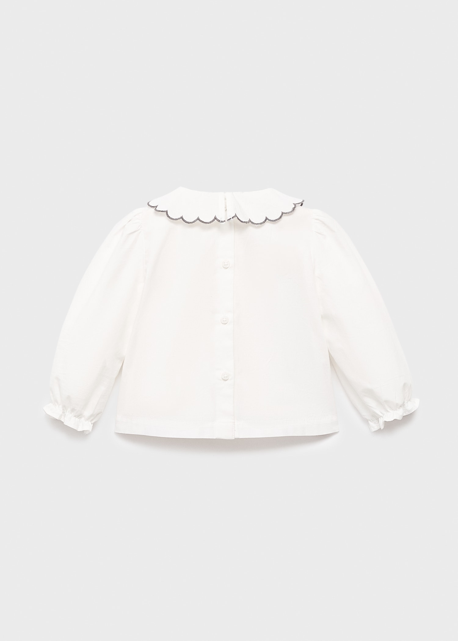 100% cotton fabric. A-line design. Babydoll collar. Button closure at the back. Long sleeves with ribbed trims