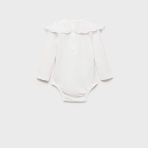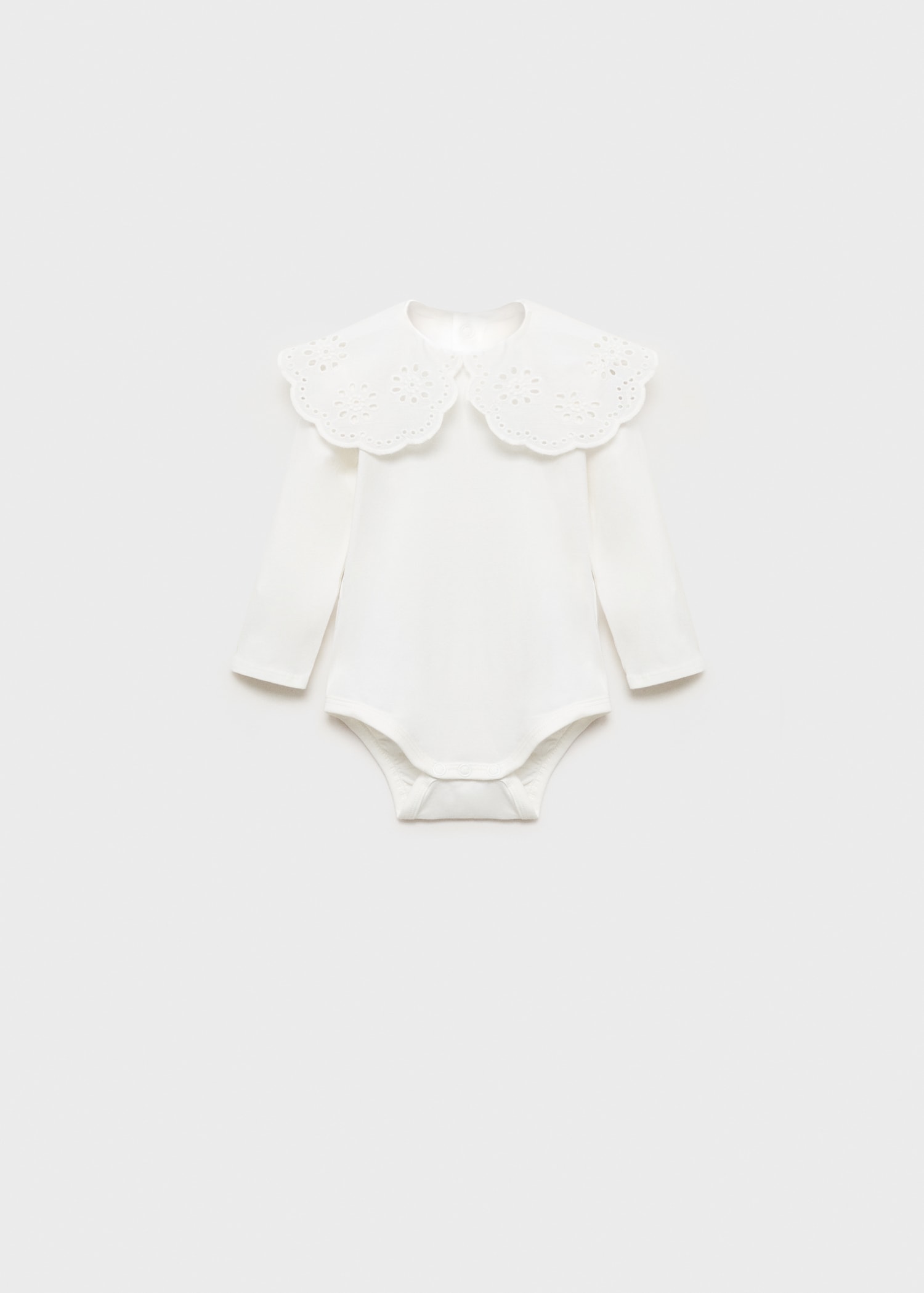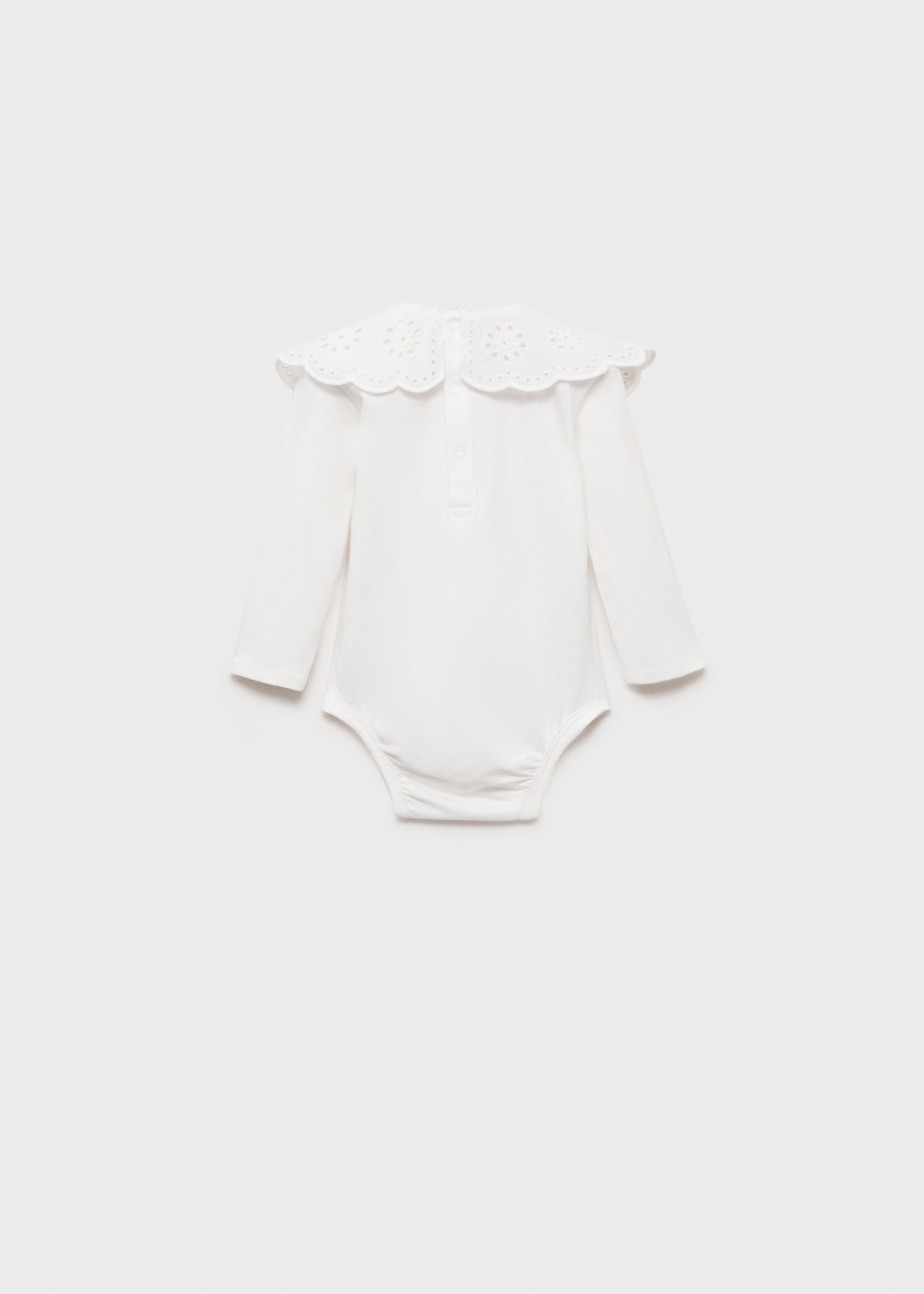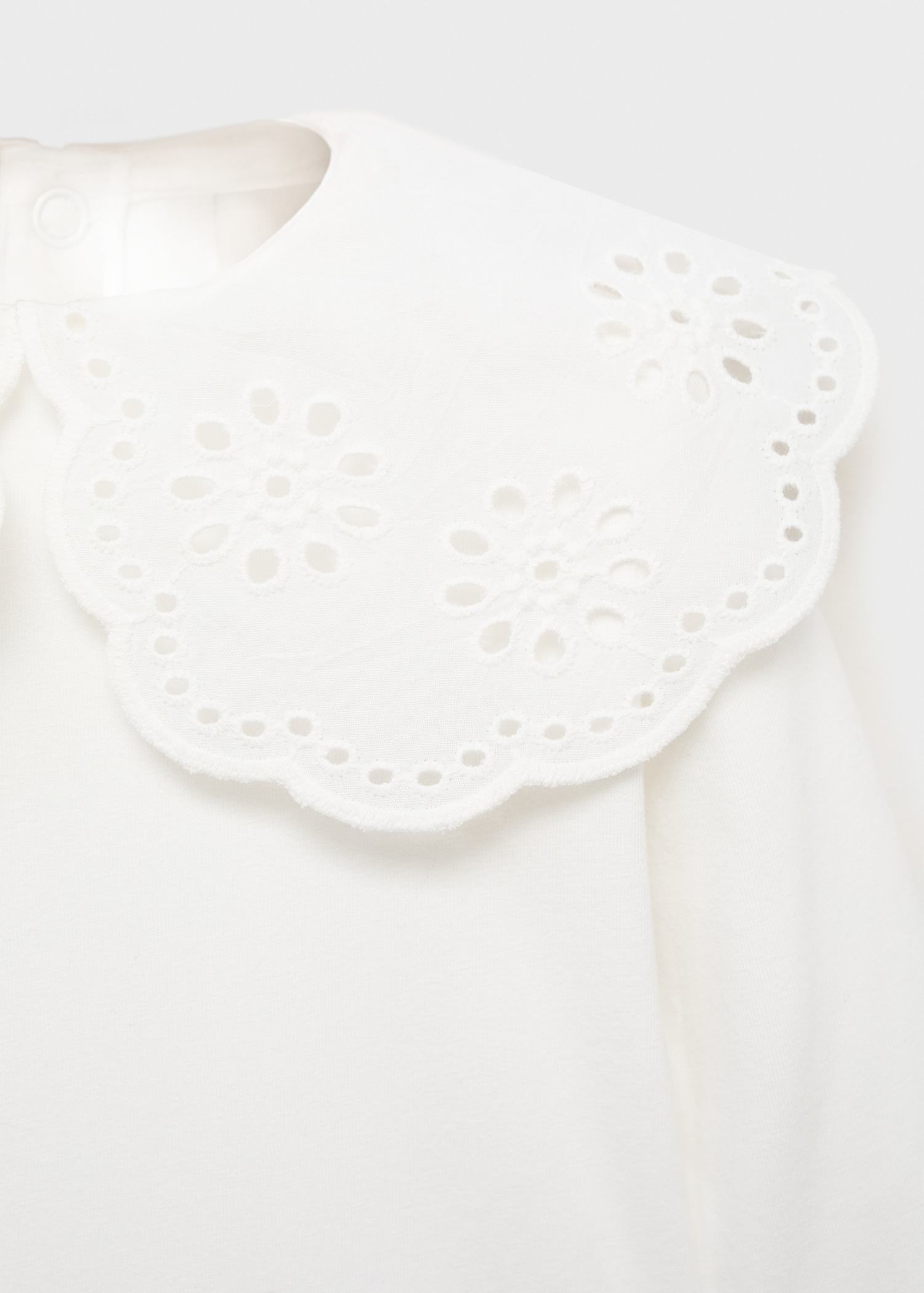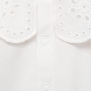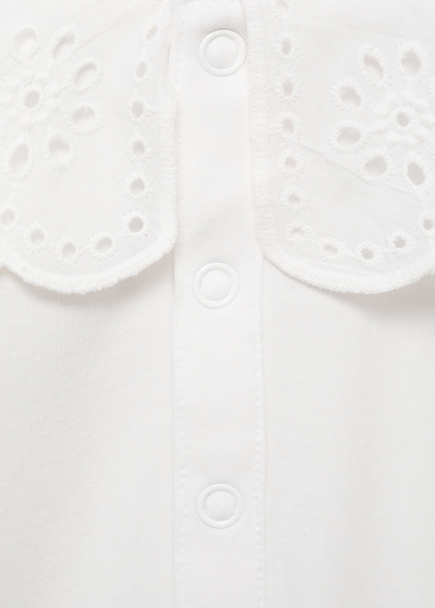 Cotton fabric. Stretch fabric. Straight Design. Babydoll collar. Embroidered detail. Long Sleeve. Snap button closure at the back. Metal snap closure at the bottom