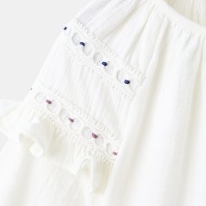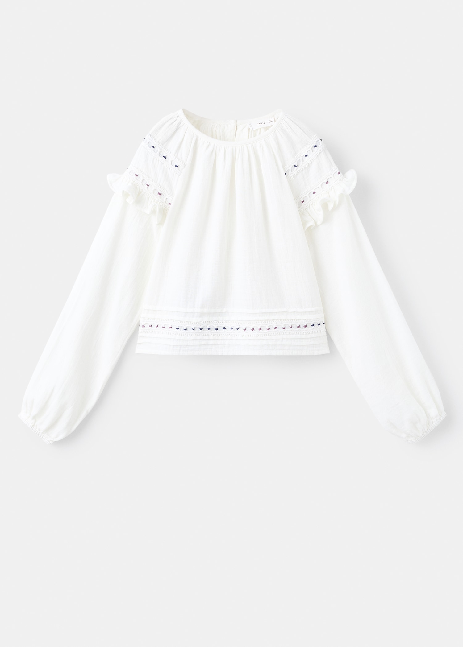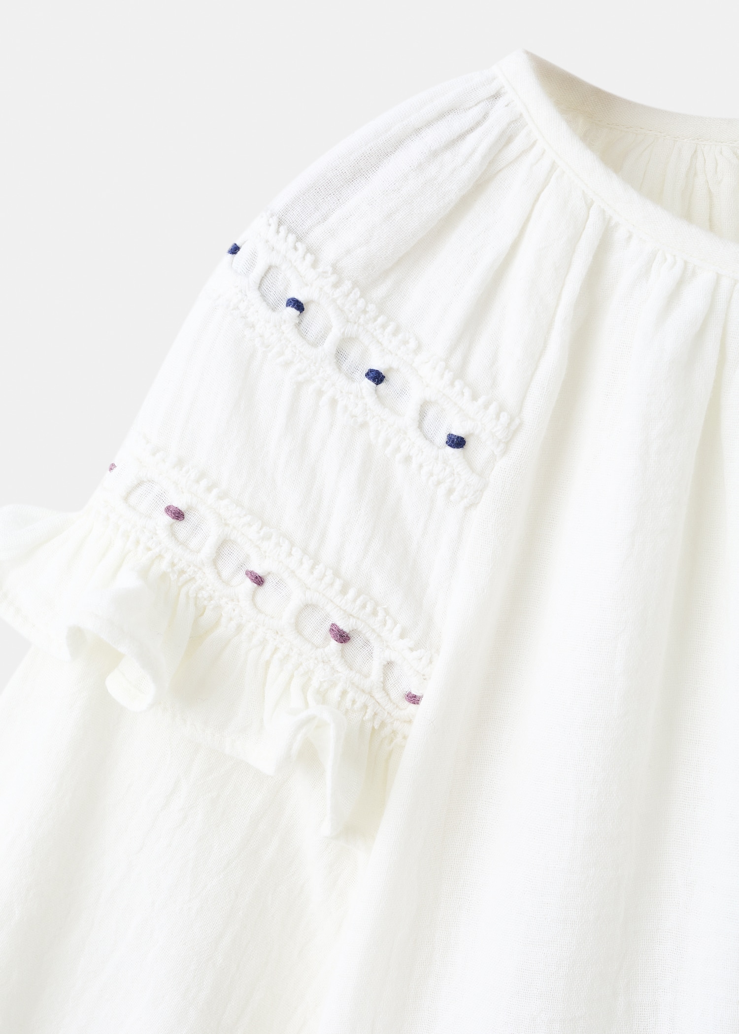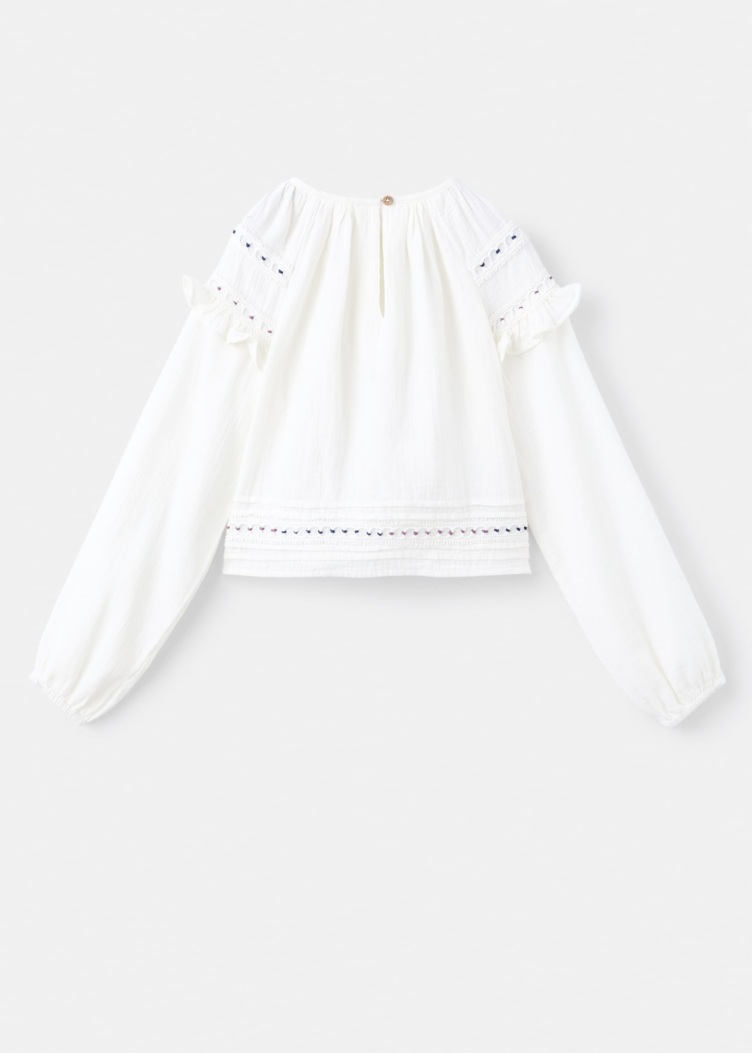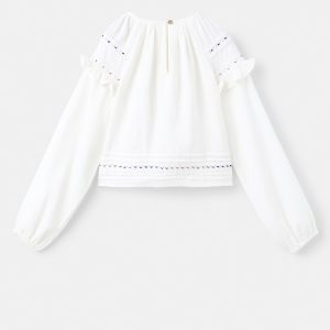 100% cotton fabric. Straight Design. Crew neck. Long sleeves with elastic cuffs. Embroidered details. Ruched detail at the neck. Ruffled detail on the sleeve. Button closing on the neck