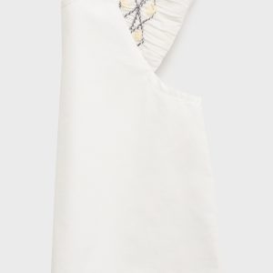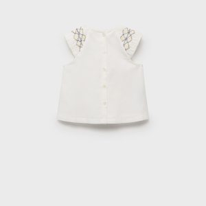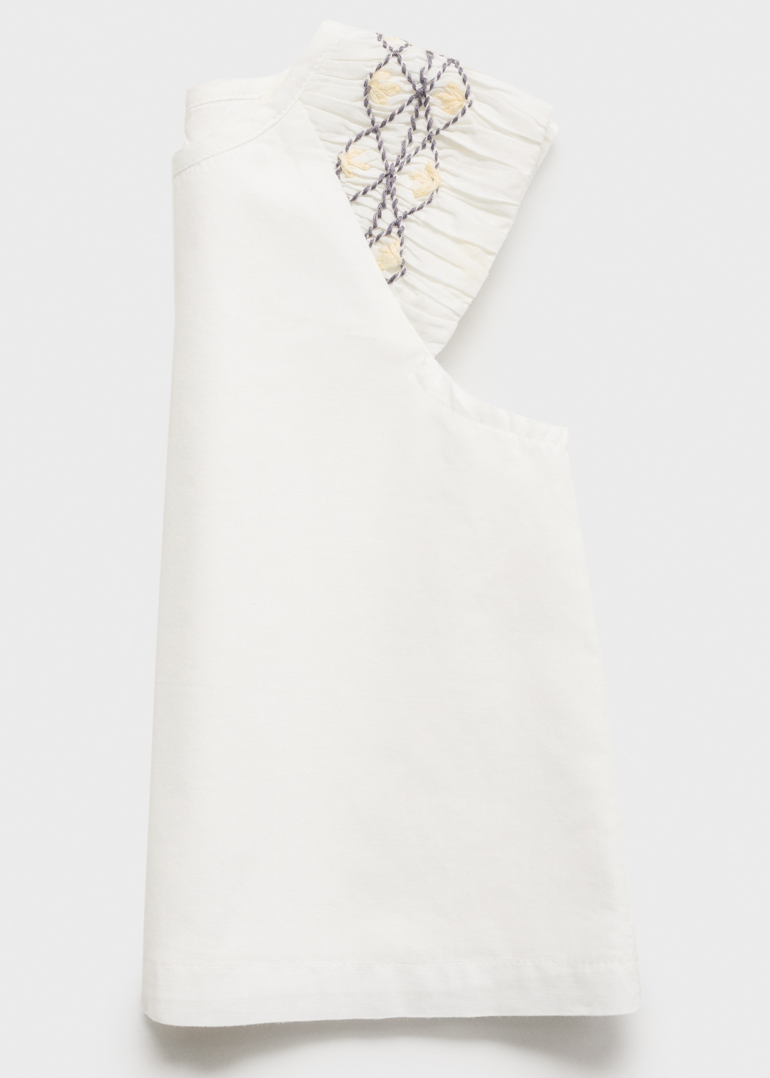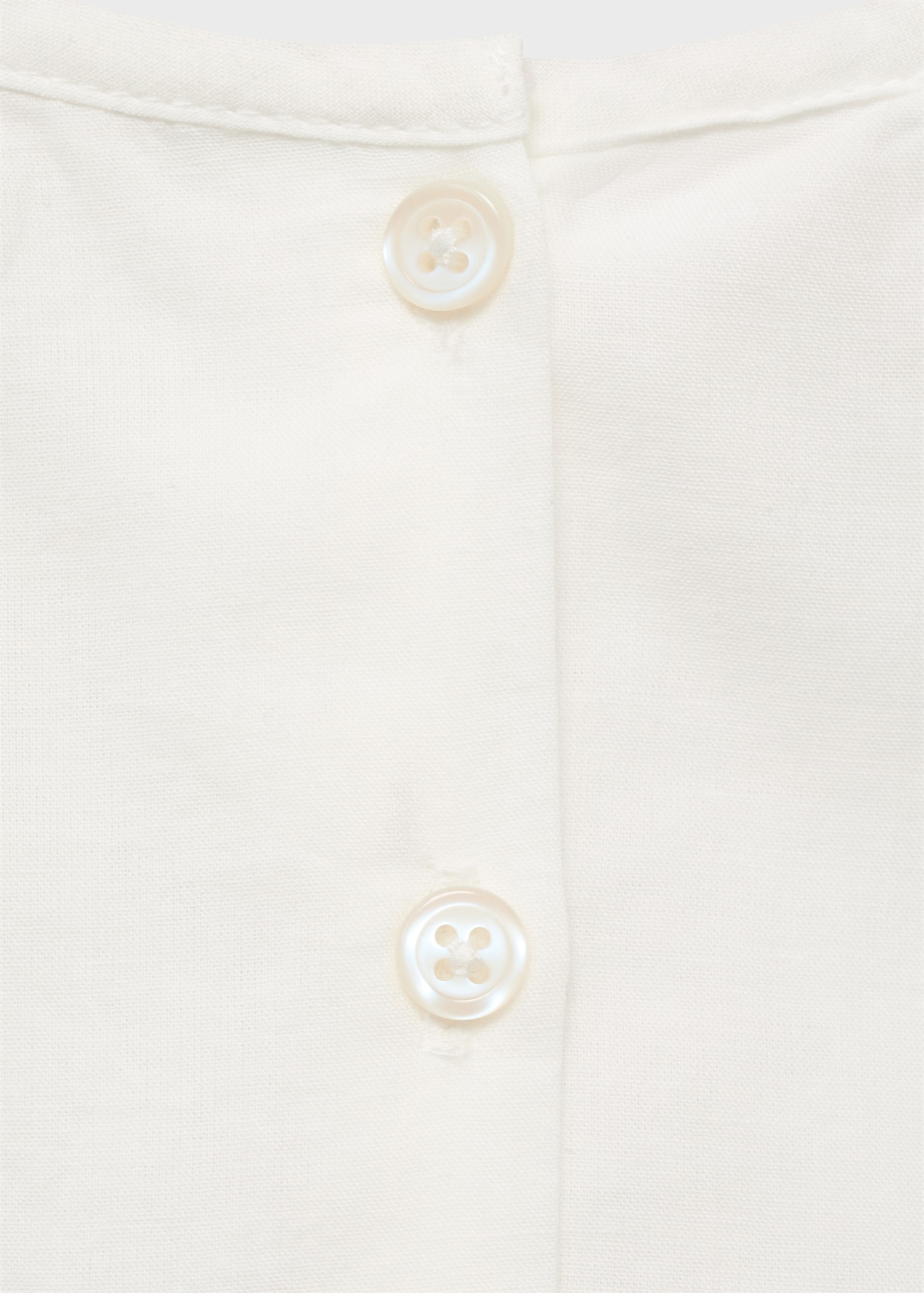 100% cotton fabric. A-line design. Braces with ruffled design and embroidery detail. Crew neck. Button closure at the back. Set