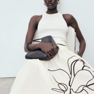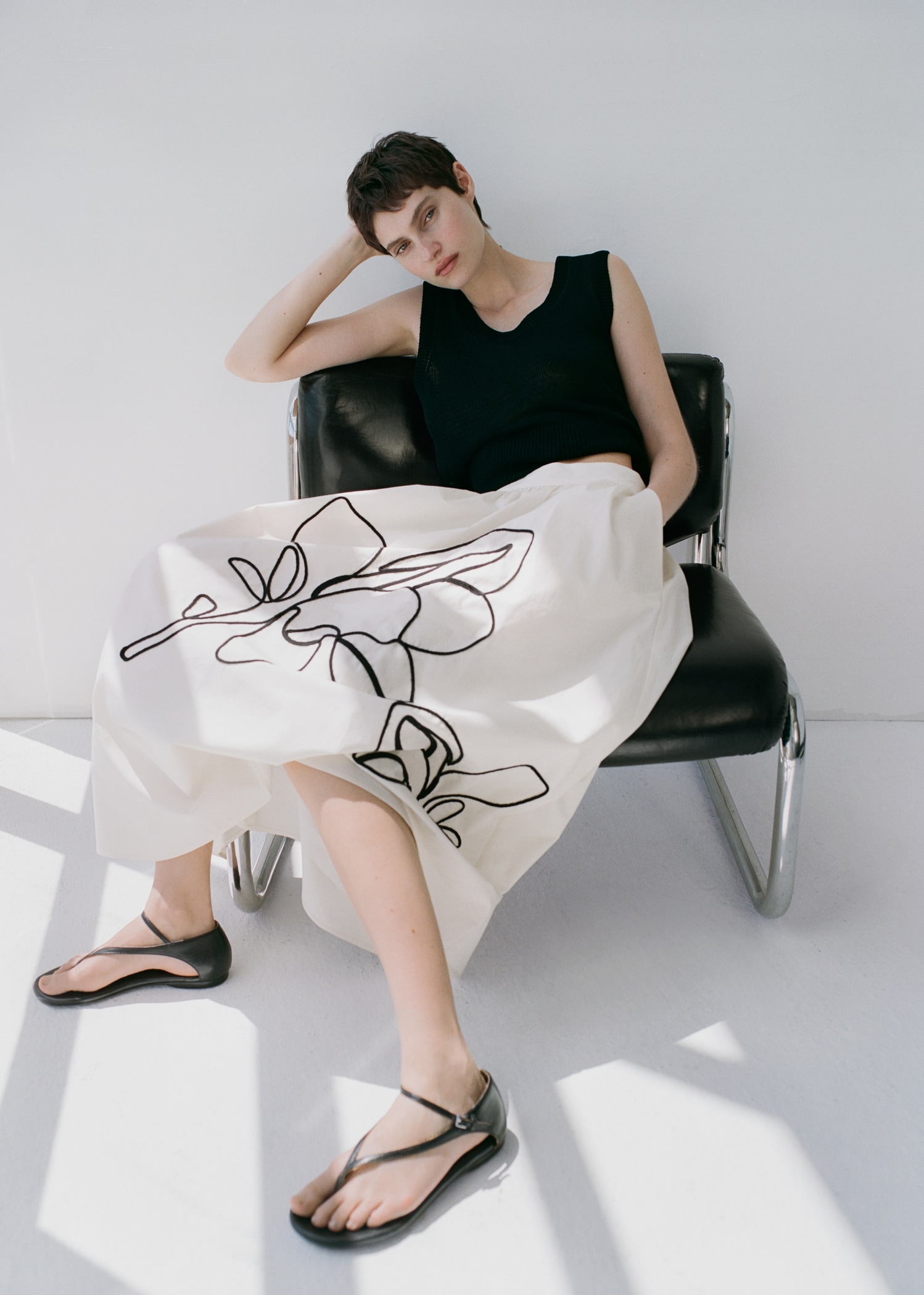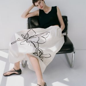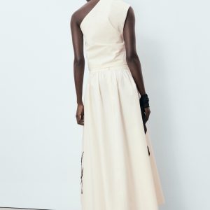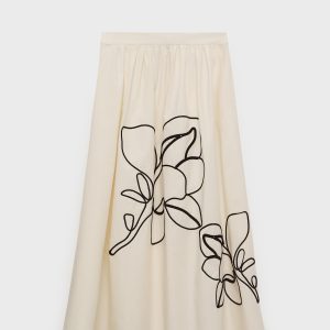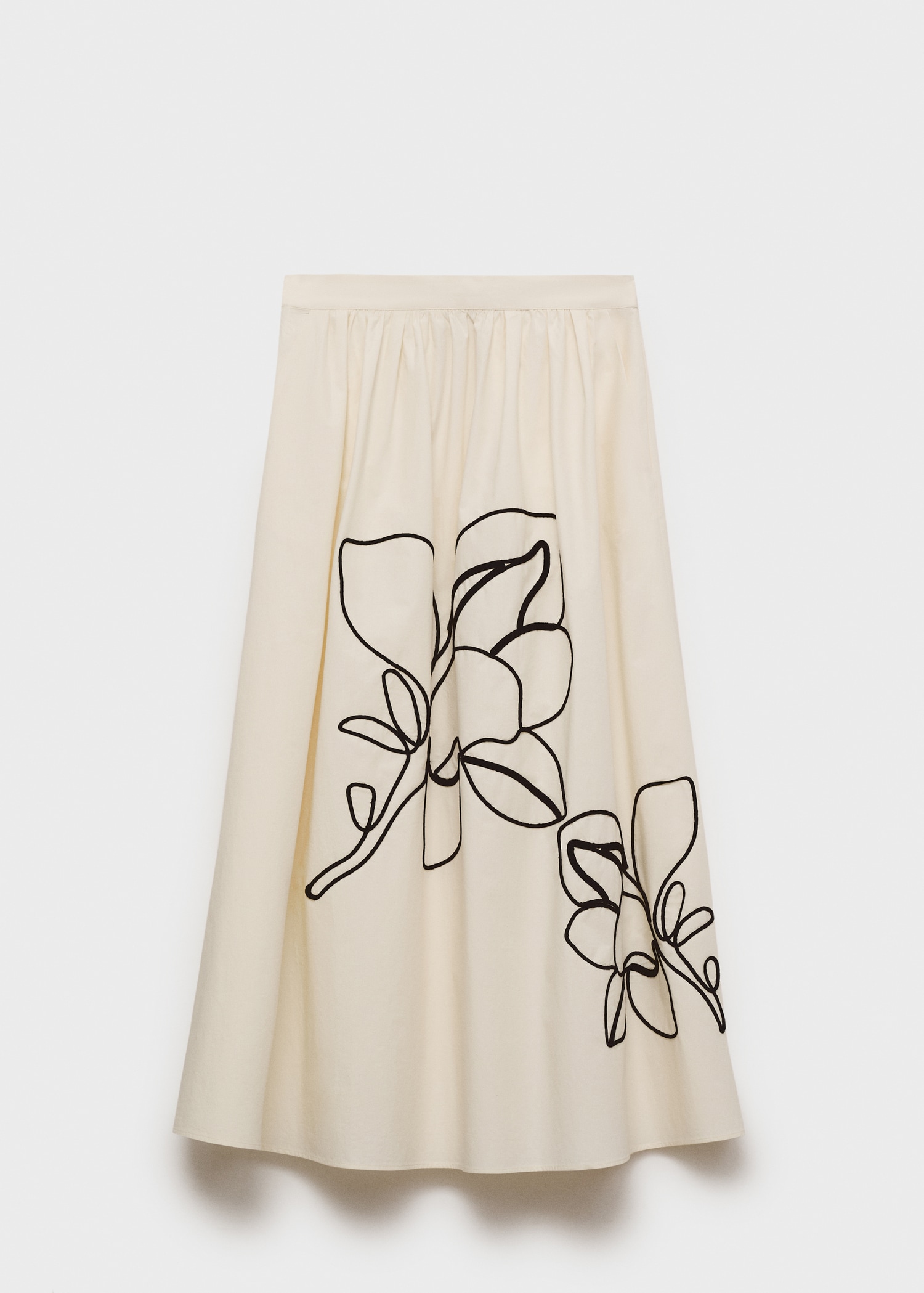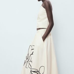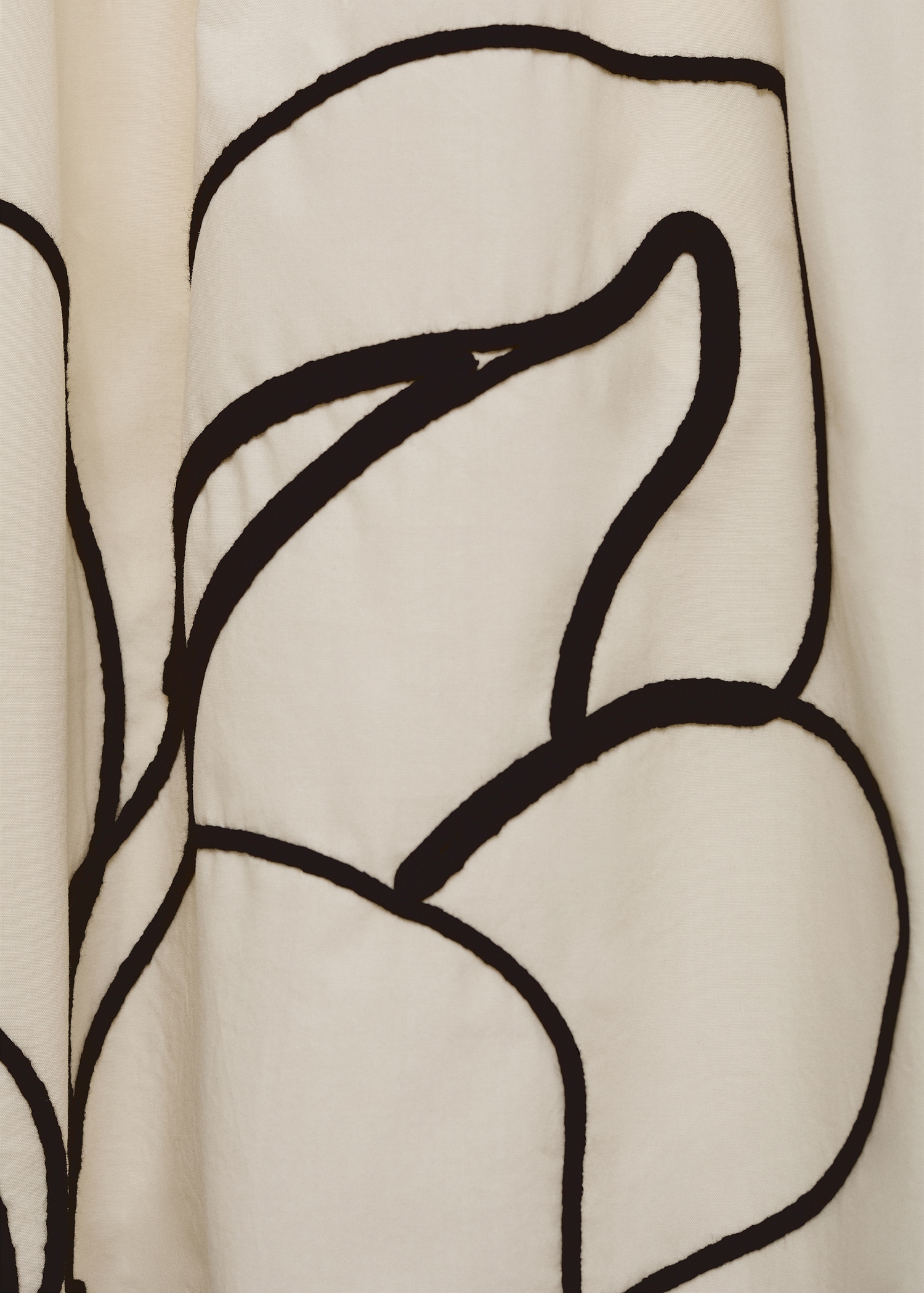 100% cotton fabric. Long design. A-line design. Embroidered detail. Two side pockets. Back zipper closure. 100% cotton lining. Total look