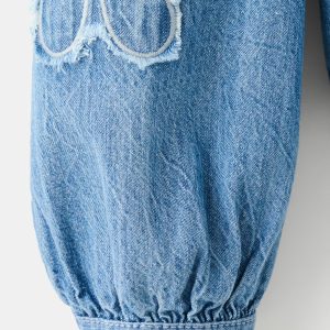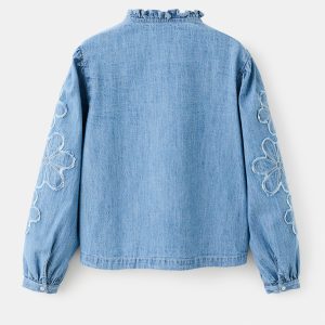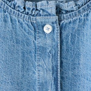 Denim fabric. Crew neck. Puffed sleeves. Embroidered details. Button closure