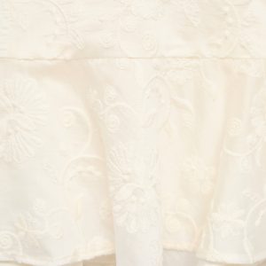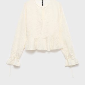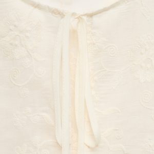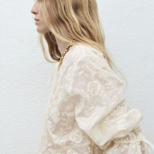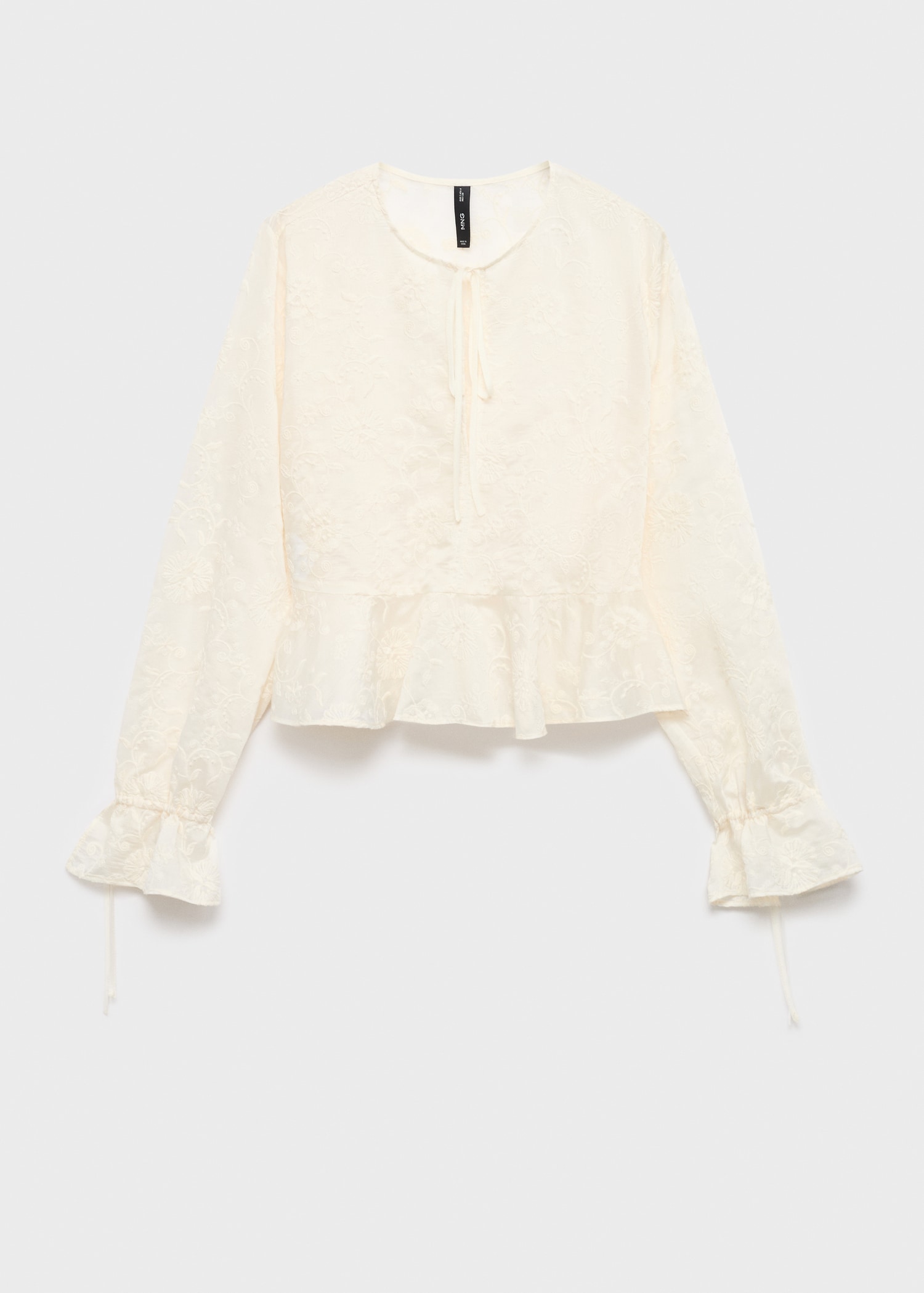 Crafted from embroidered lyocell fabric, this garment features a crop design with a round neckline and a bow detail. The long sleeves have adjustable cuffs and the hem includes a ruffle
