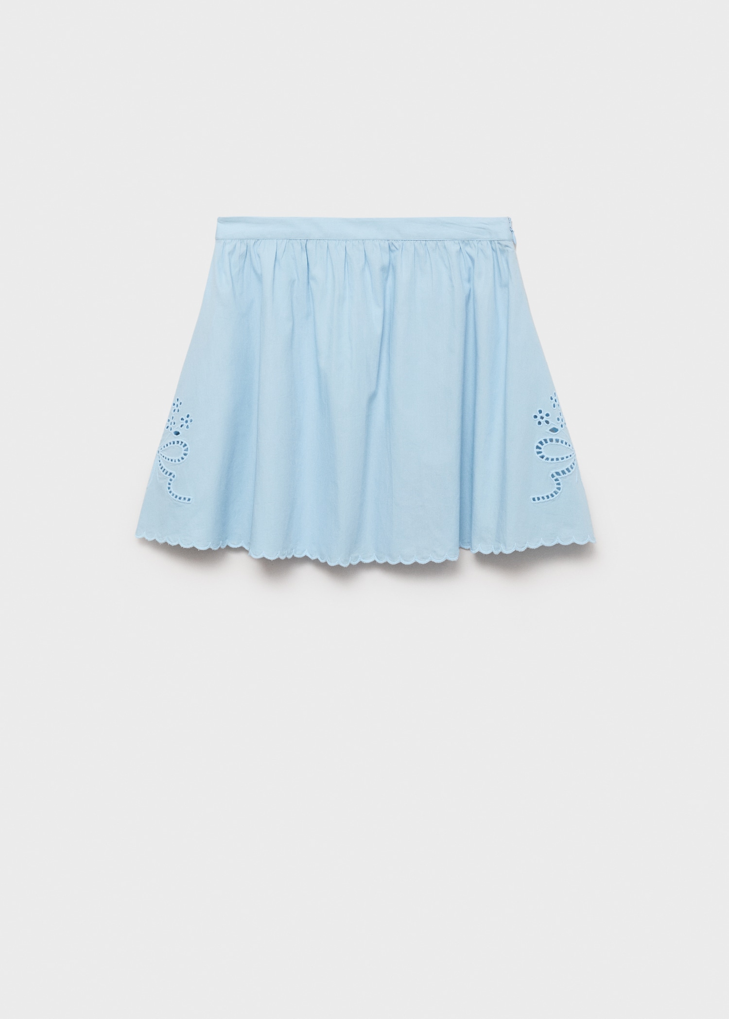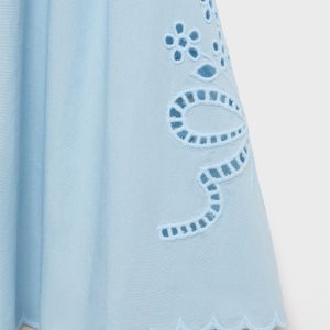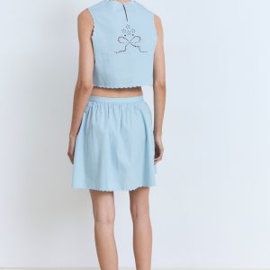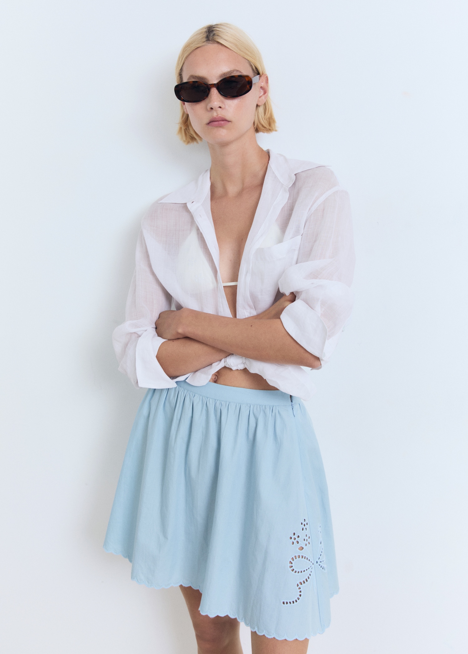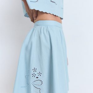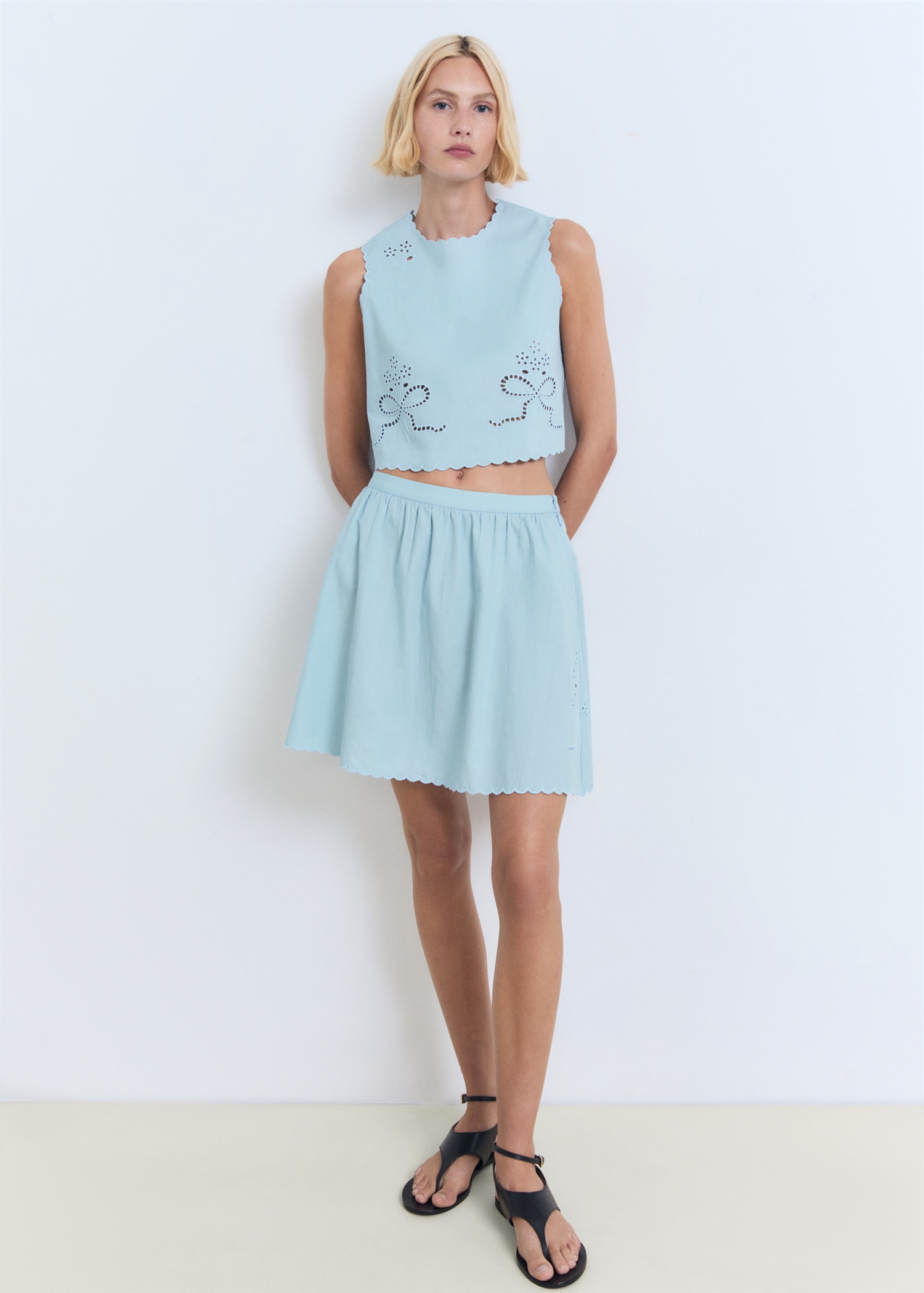 Crafted from 100% cotton, this skirt features a short, A-line design with embroidered details. The scalloped hem gives it a special air, while the side zipper fastening ensures a perfect fit. The skirt also comes with a matching top, allowing you to create a feminine 'total look'