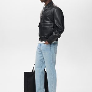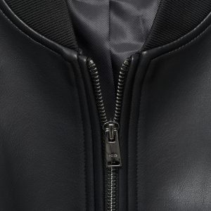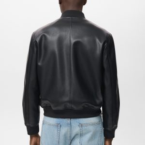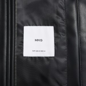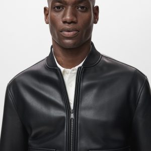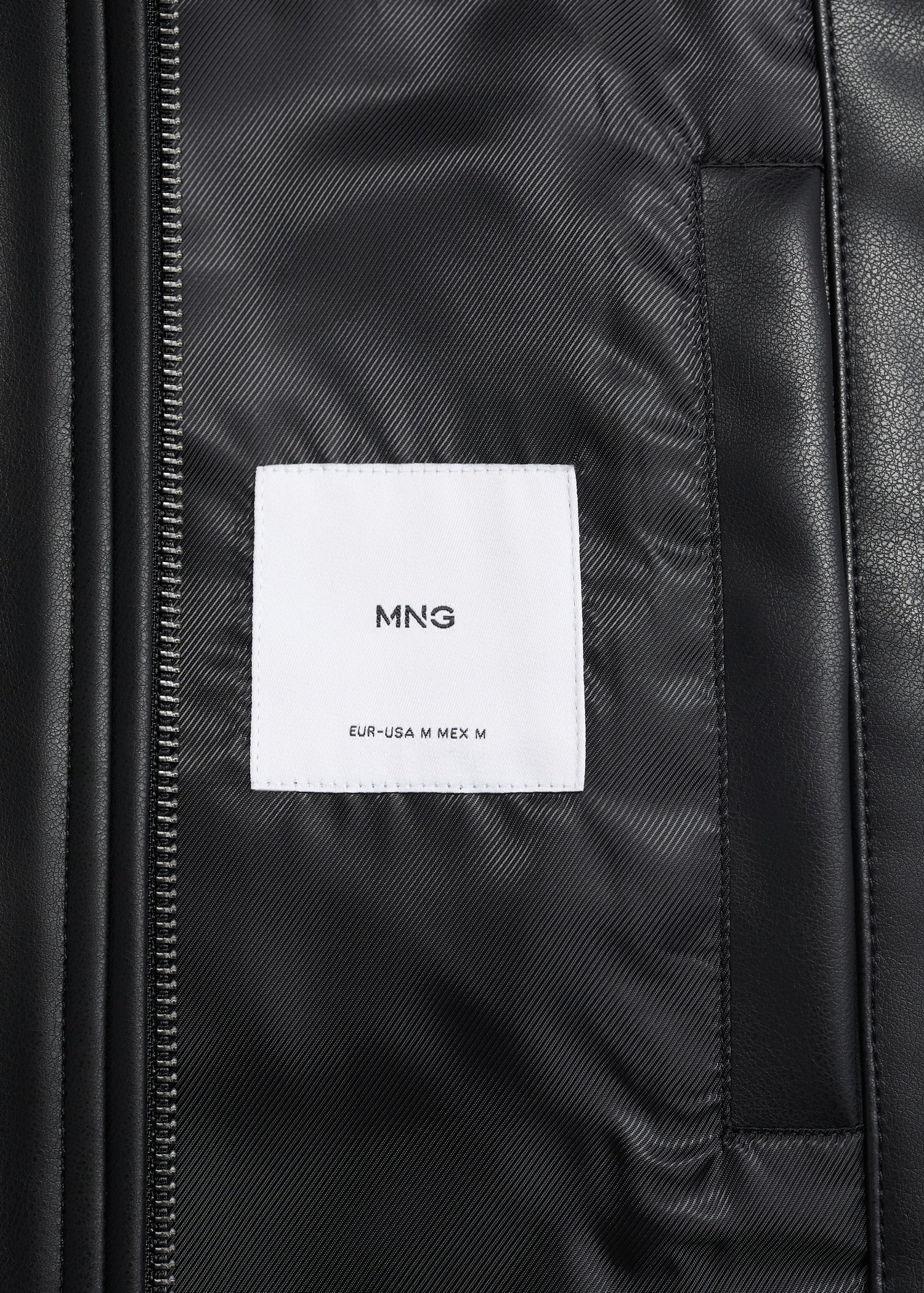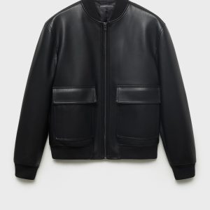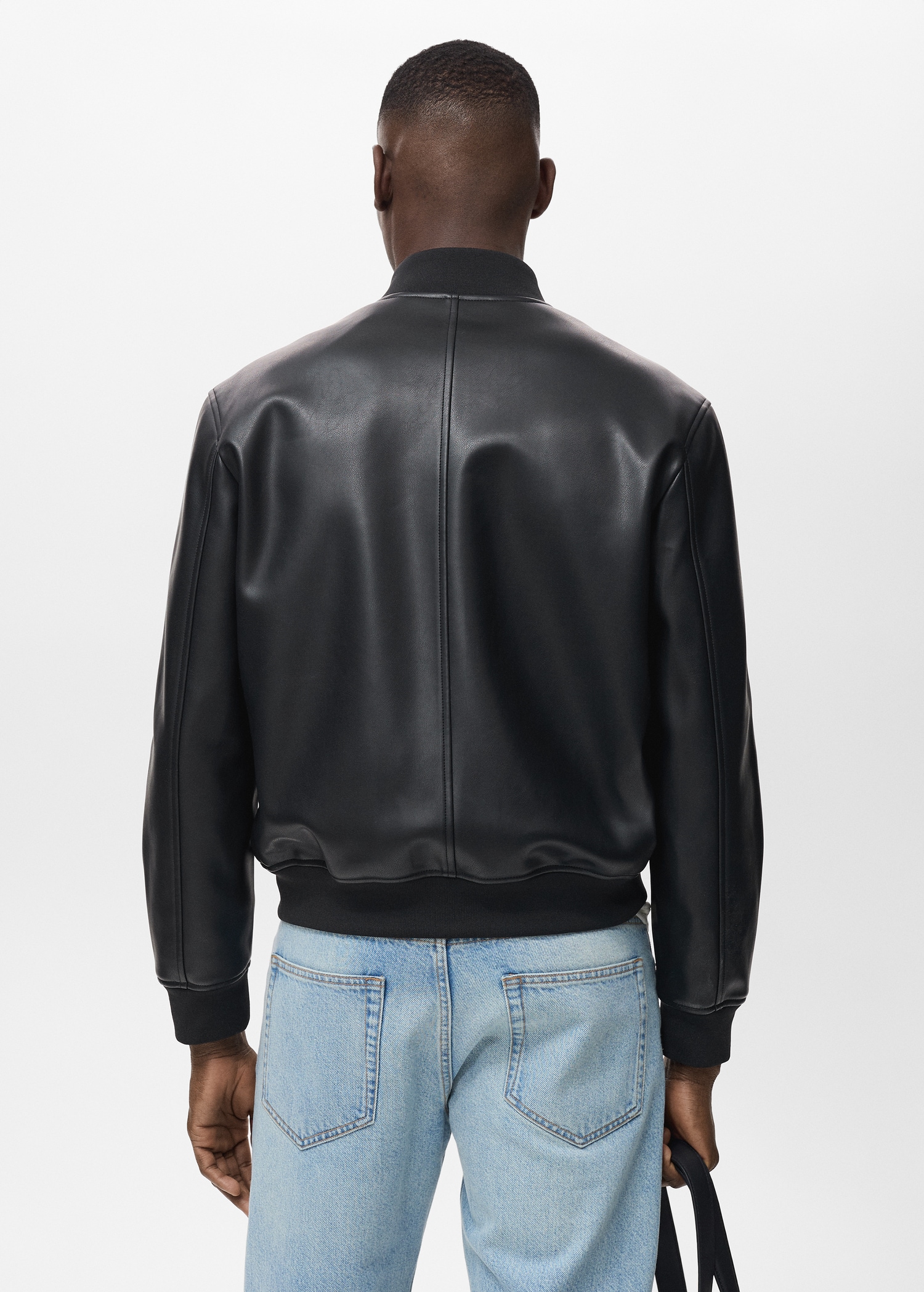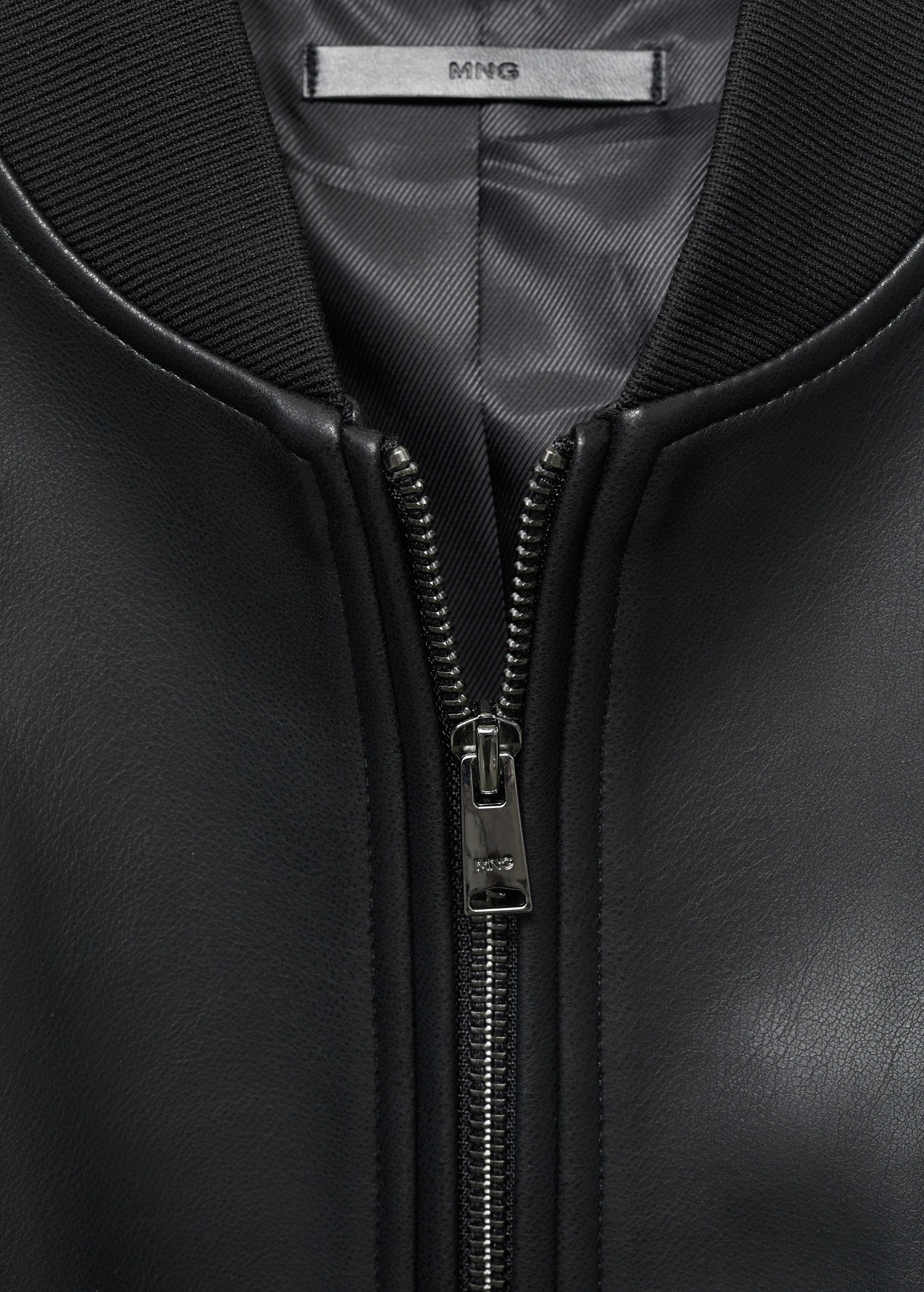 Bomber design. Straight Silhouette. Leather effect. Ribbed neck, cuffs and hem. Inner lining. Two flap pockets on the front. Interior pocket. Front zipper closure