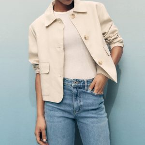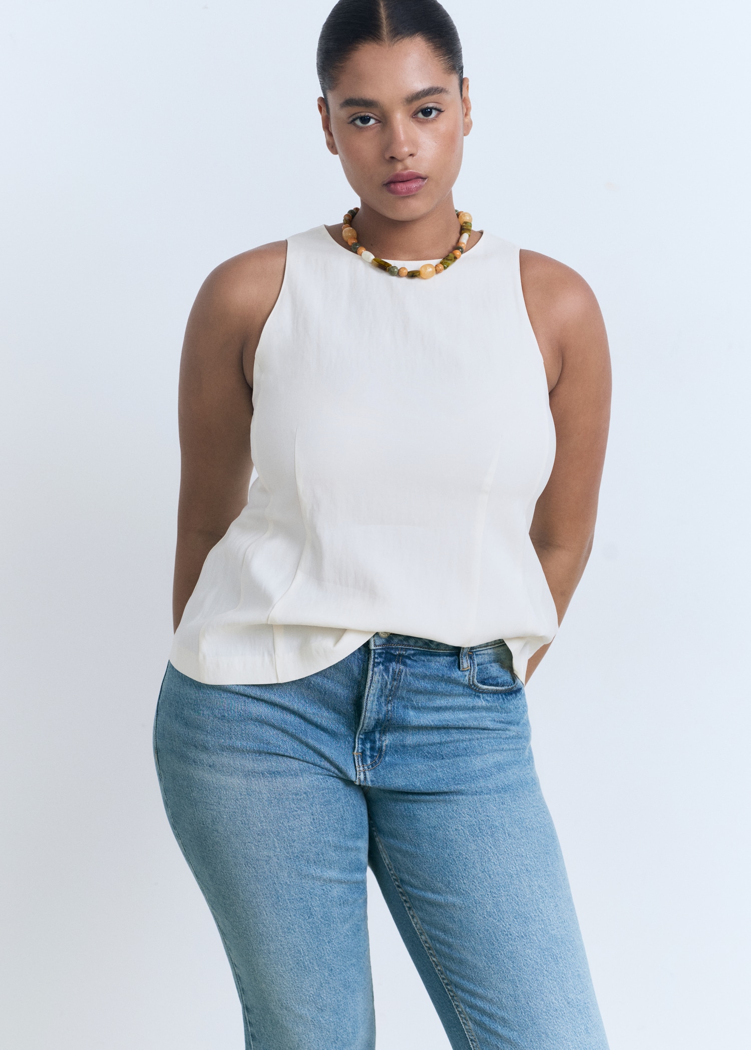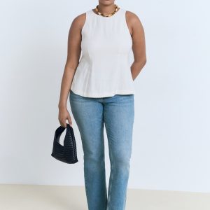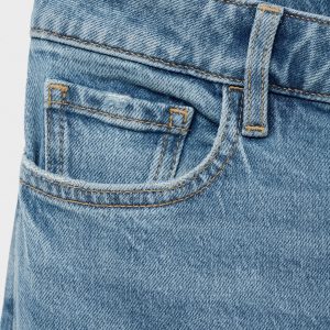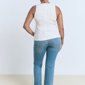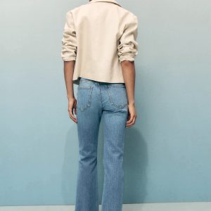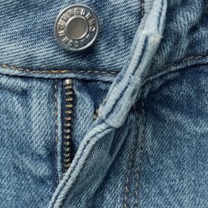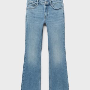 Cotton denim fabric. Long design. Flare design. Mid-rise. Belt loops. Five pockets. Frayed hem. Front zipper and button closure. Inseam 32.68 in. Available Plus