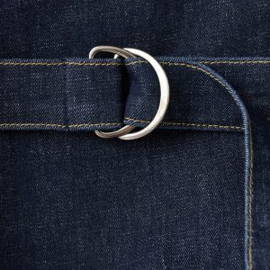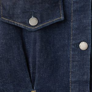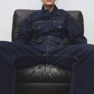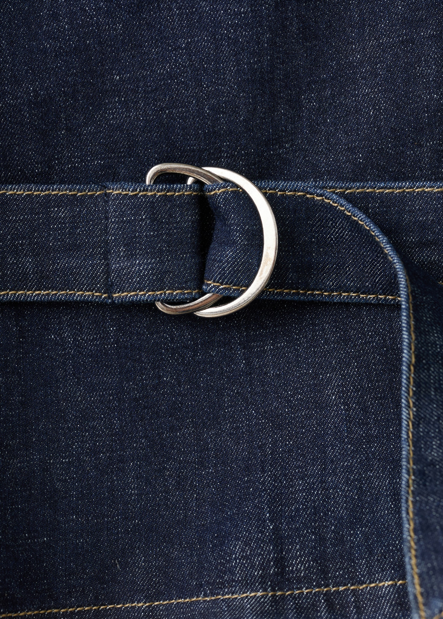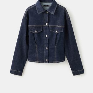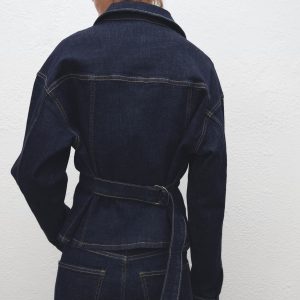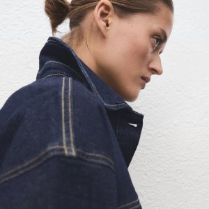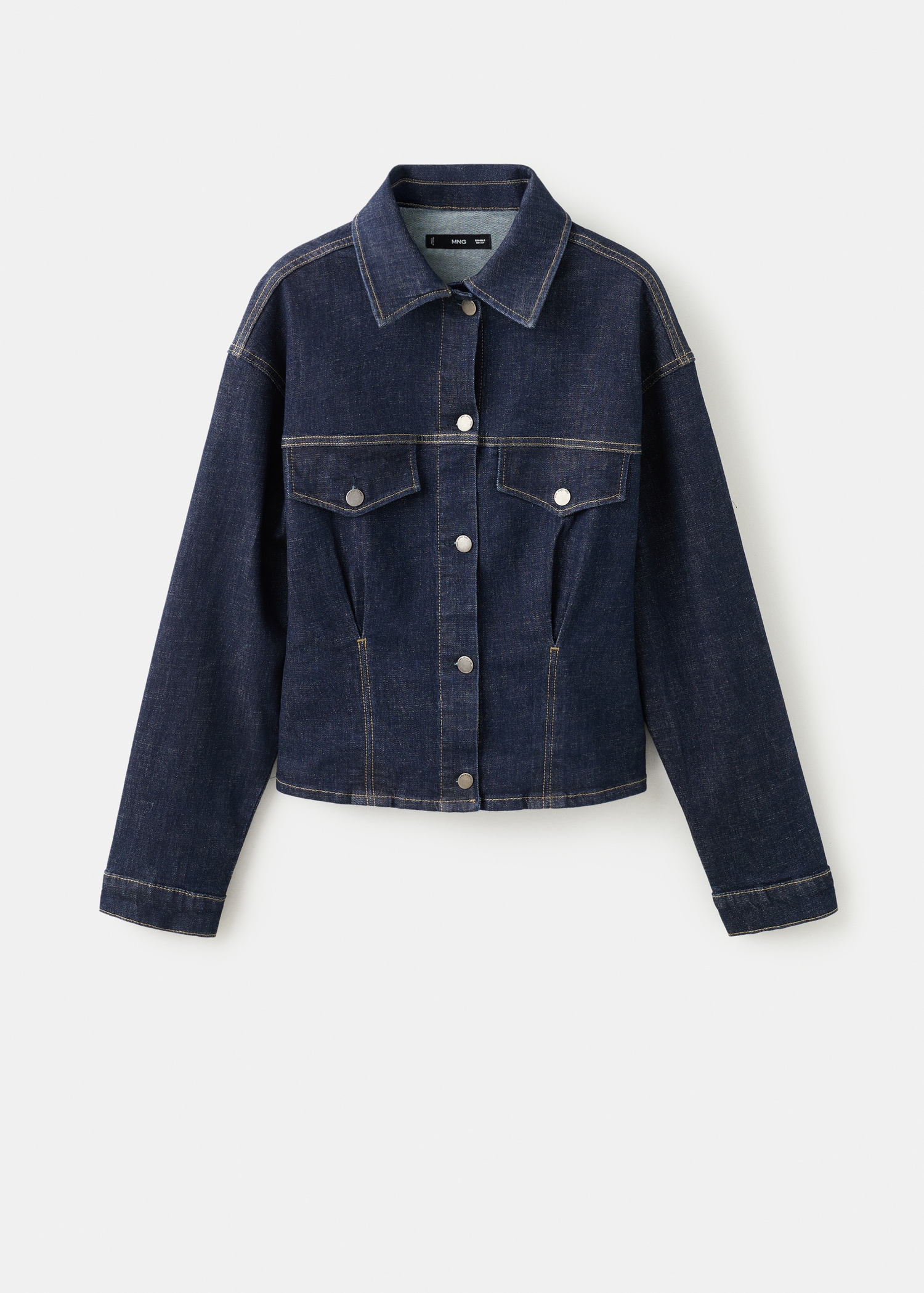 Cotton denim fabric. Comfort fabric with elasticity. Fitted design. Shirt collar. Long sleeves with buttoned cuffs. Two flap and buttoned patch pockets on the chest. Front pleat detail. Adjustable strap at the back. Front button closure. Total look