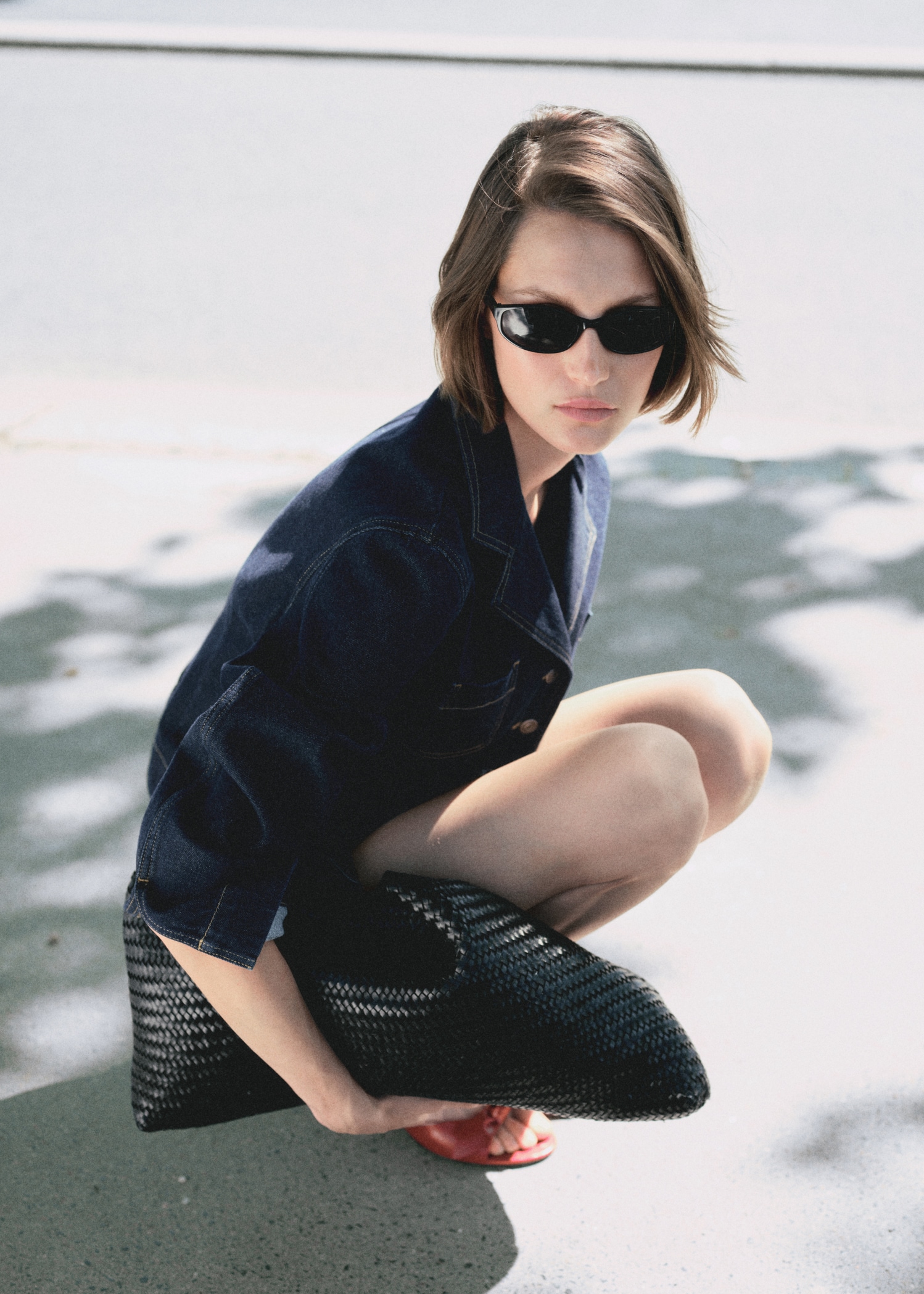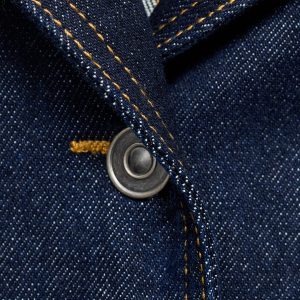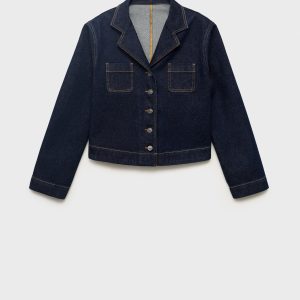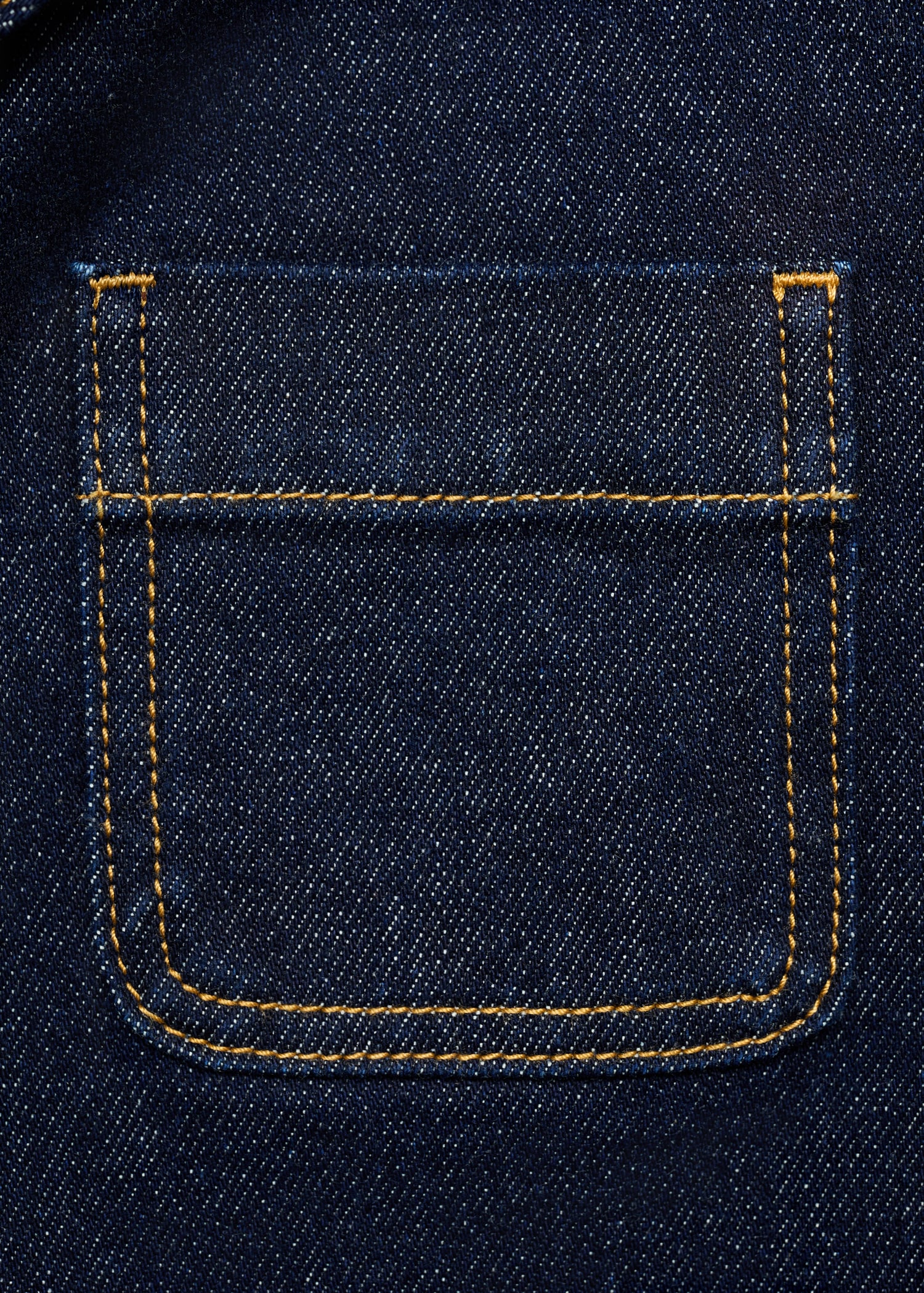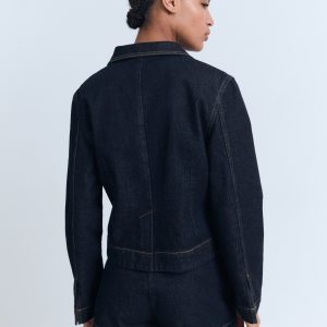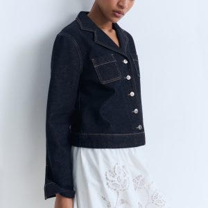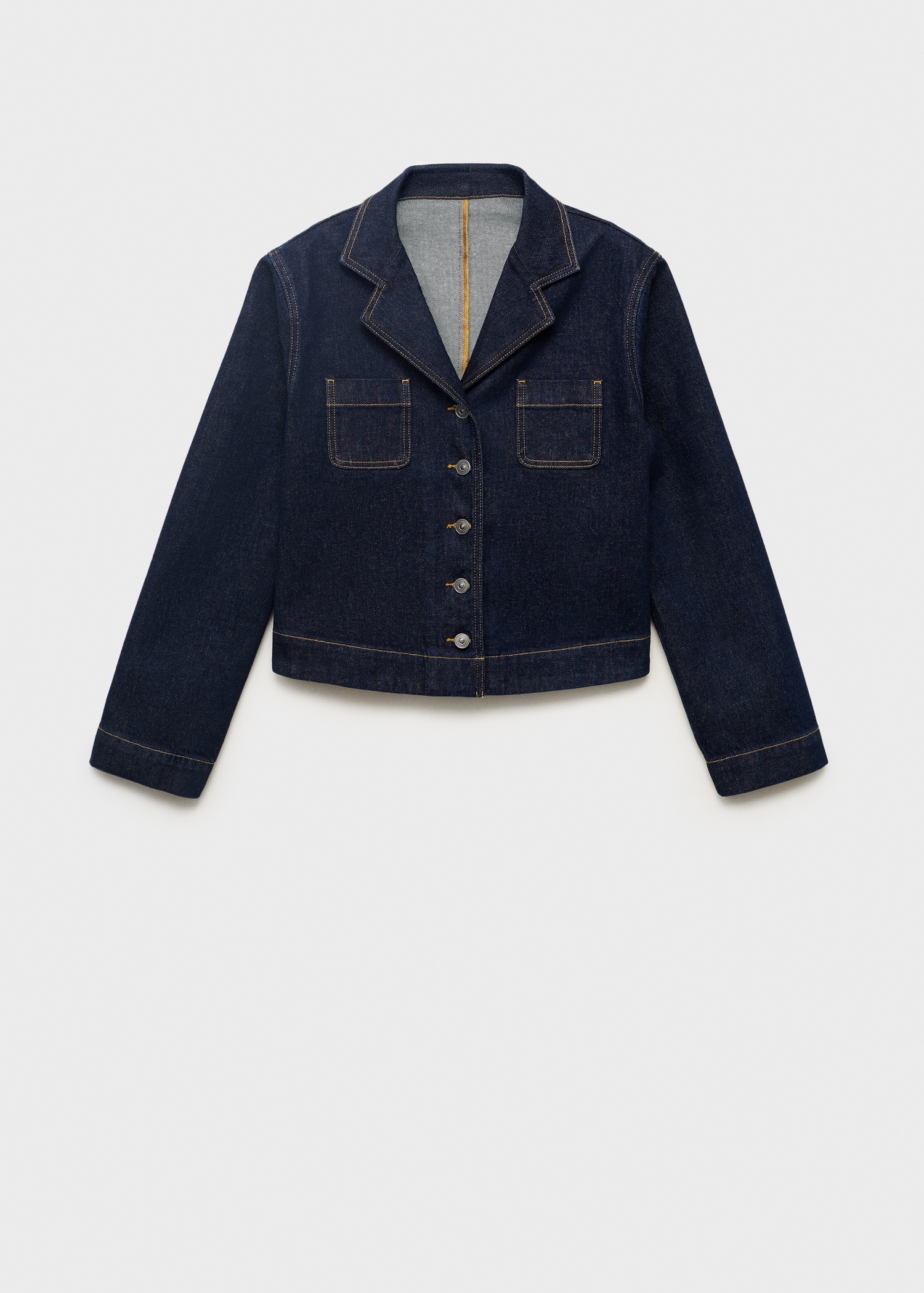 Cotton denim fabric. Fitted design. Short design. Lapel-collar V-neck collar. Notch lapels. Long sleeves with buttoned cuffs. Two patch pockets at chest. Button closure at the front. Total look. Comfort fabric with elasticity
