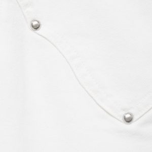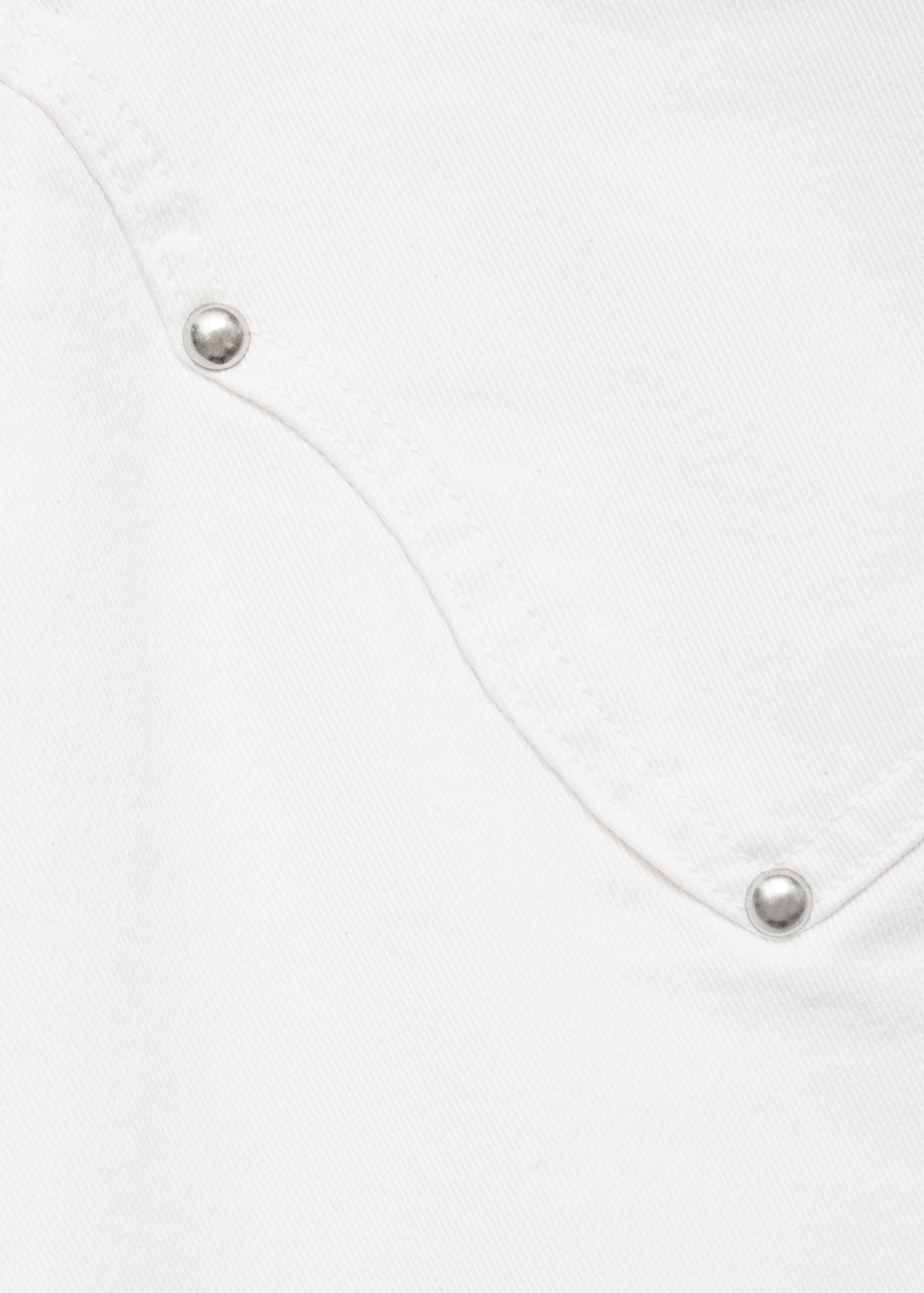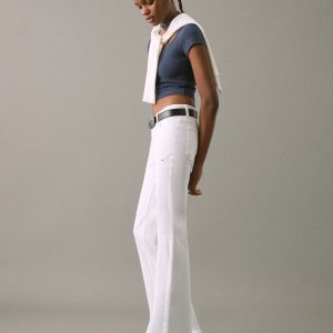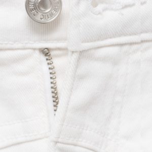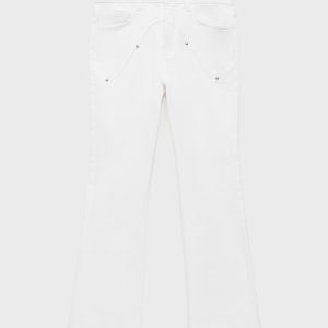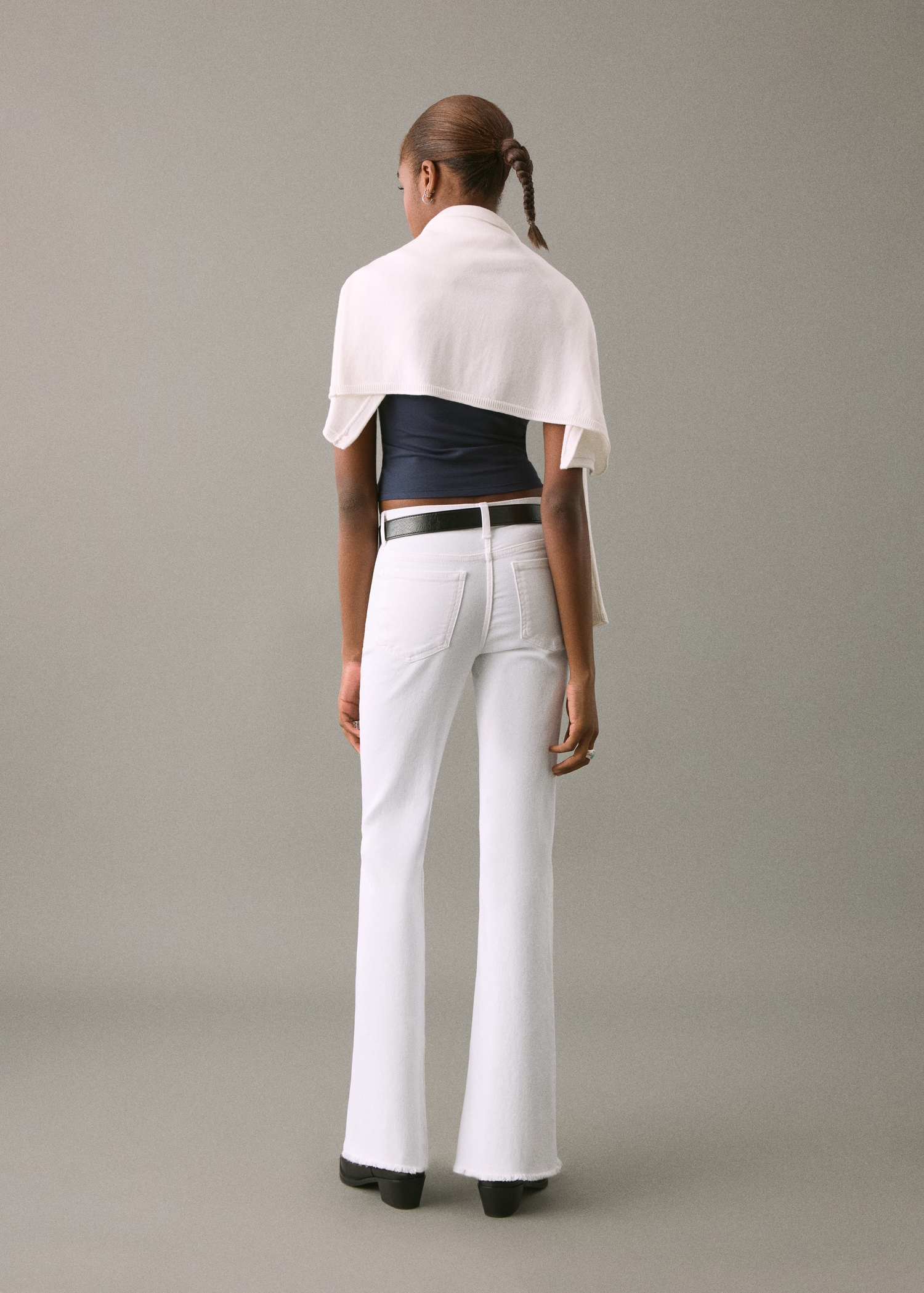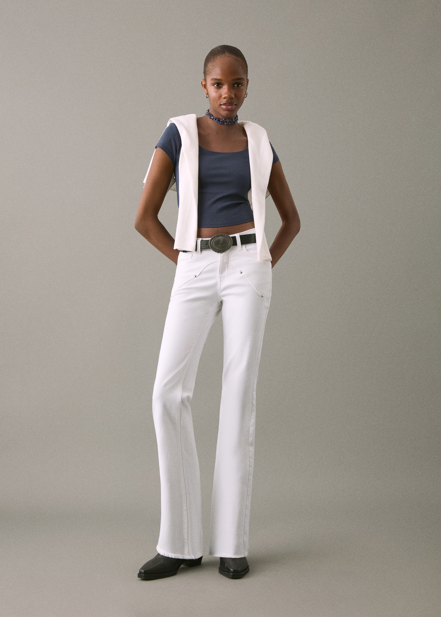Cotton fabric. Stretch fabric. Flare design. Belt loops. Button and zipper closure. Two side pockets. Coin pocket. Studded detail. Frayed hem