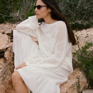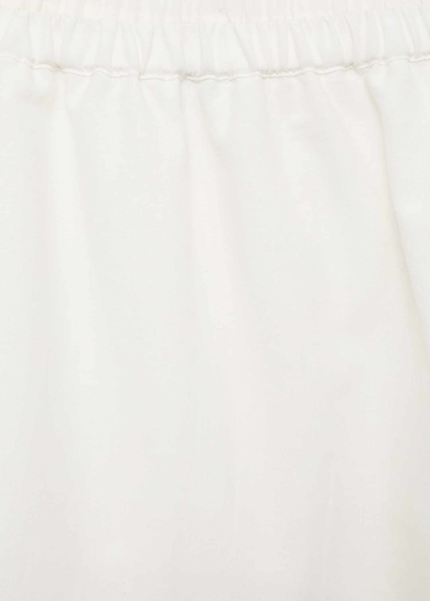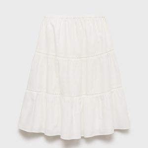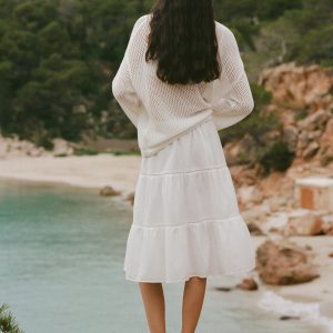 100% cotton fabric. Midi design. Full skirt. Mid-rise. Elastic waistband. Openwork details. No closure