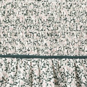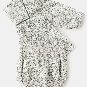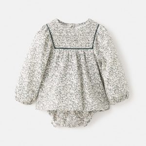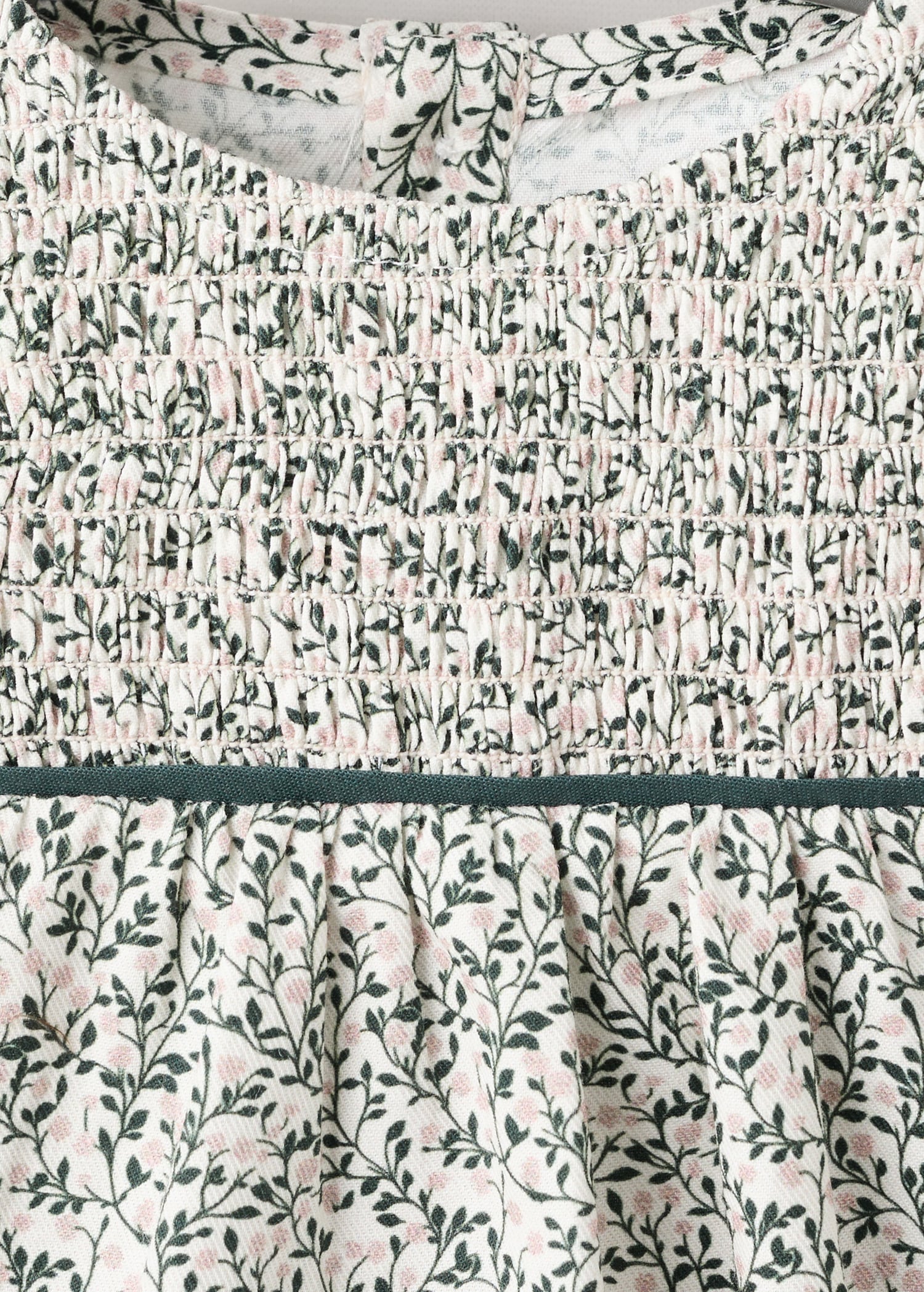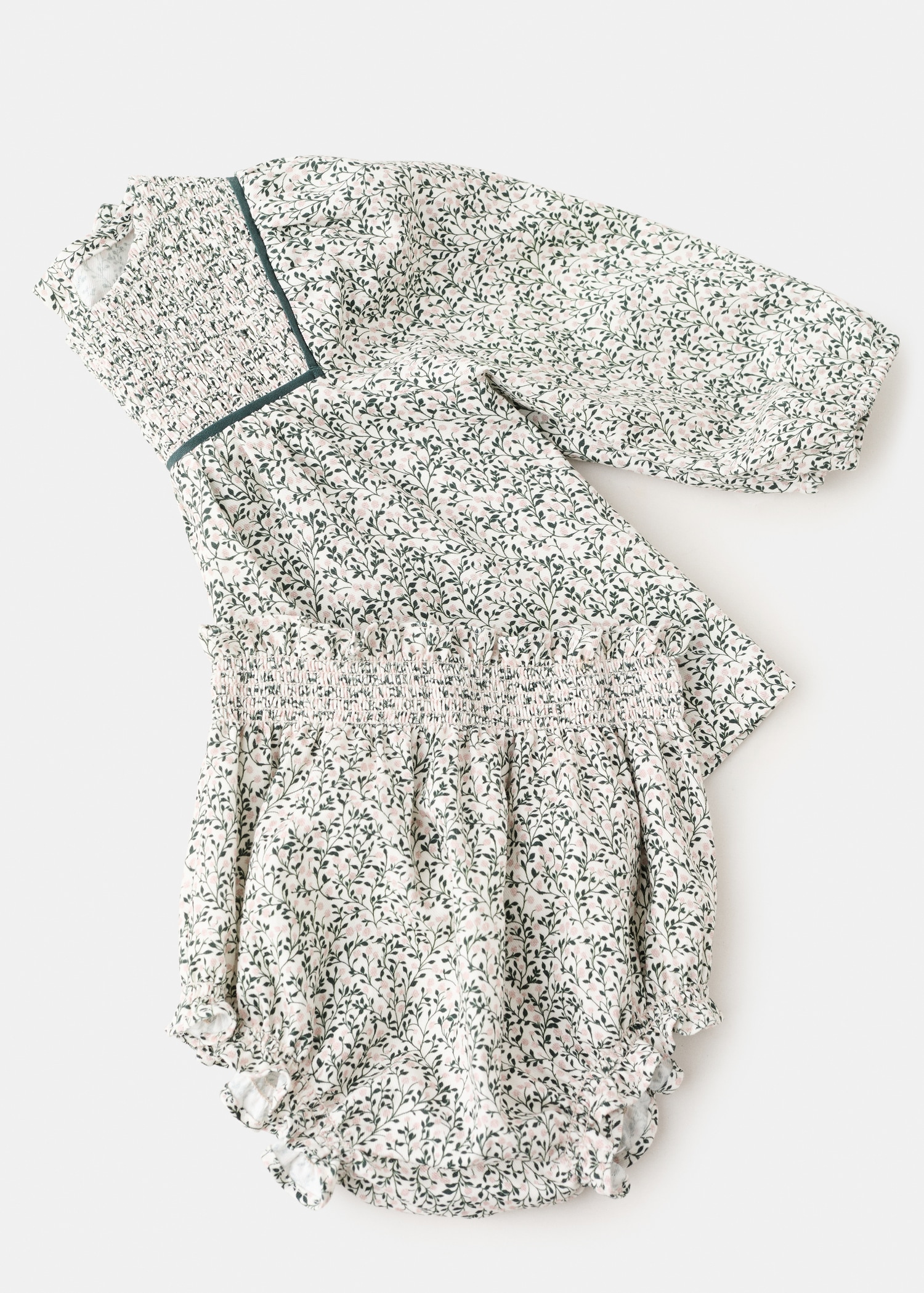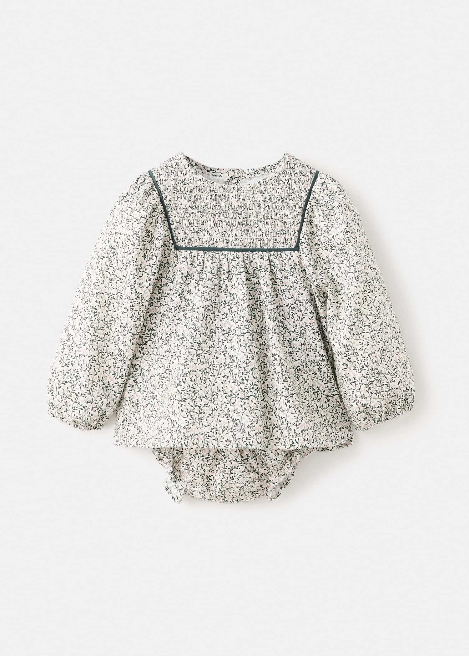 100% cotton fabric. Floral design. A-line design. Crew neck. Long Sleeve. Gathered detail. Printed cotton diaper cover