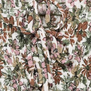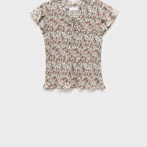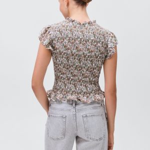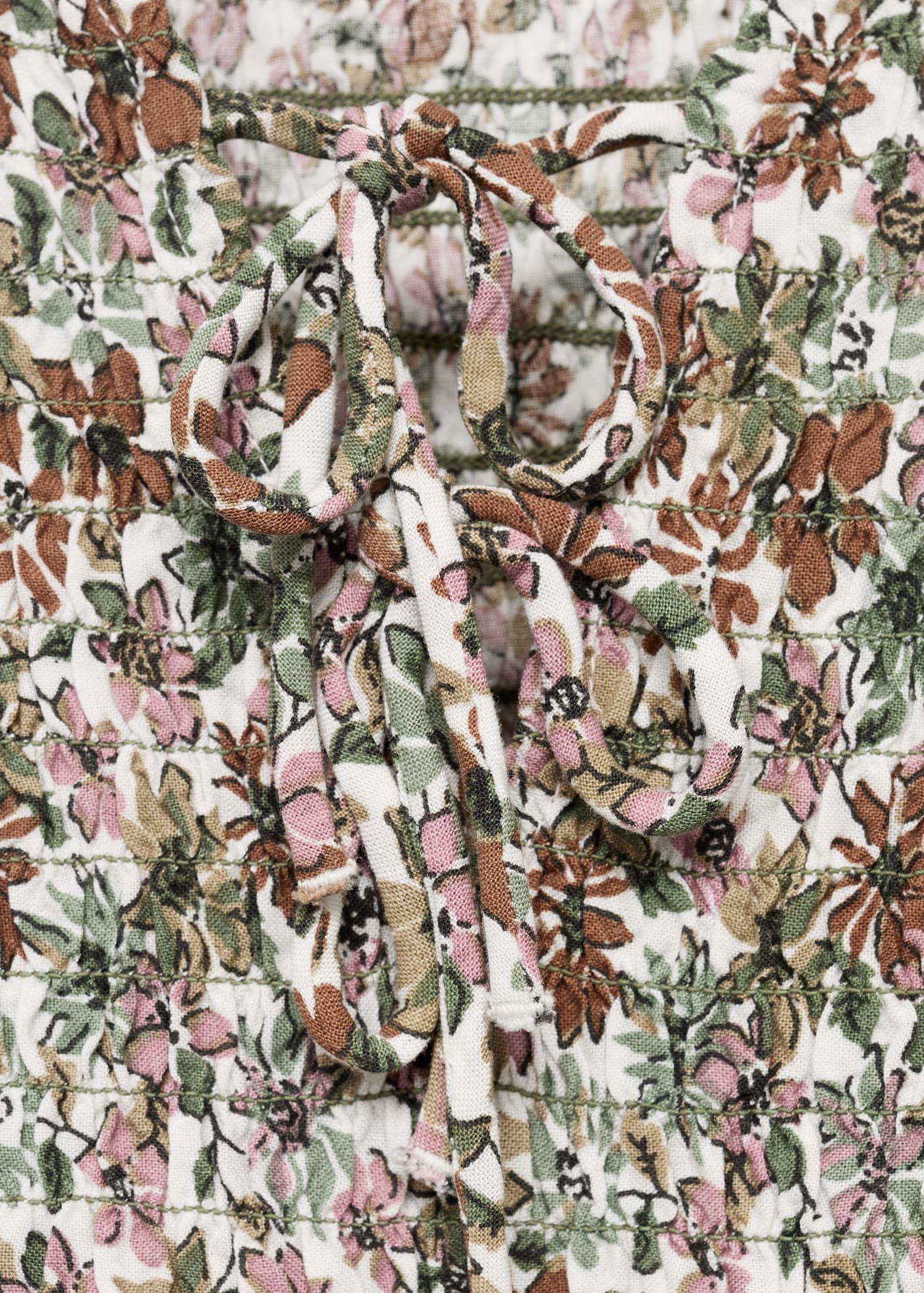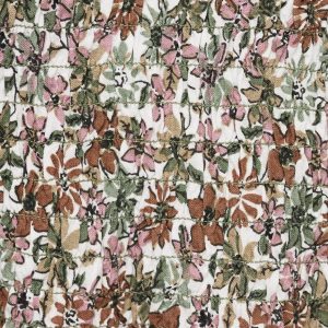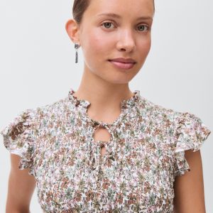 Viscose fabric. Straight Design. Floral print design. Ruched bodice. Honeycomb pattern. Adjustable V-neck with drawstring. Ruffles on the sleeves. Frill on the bottom