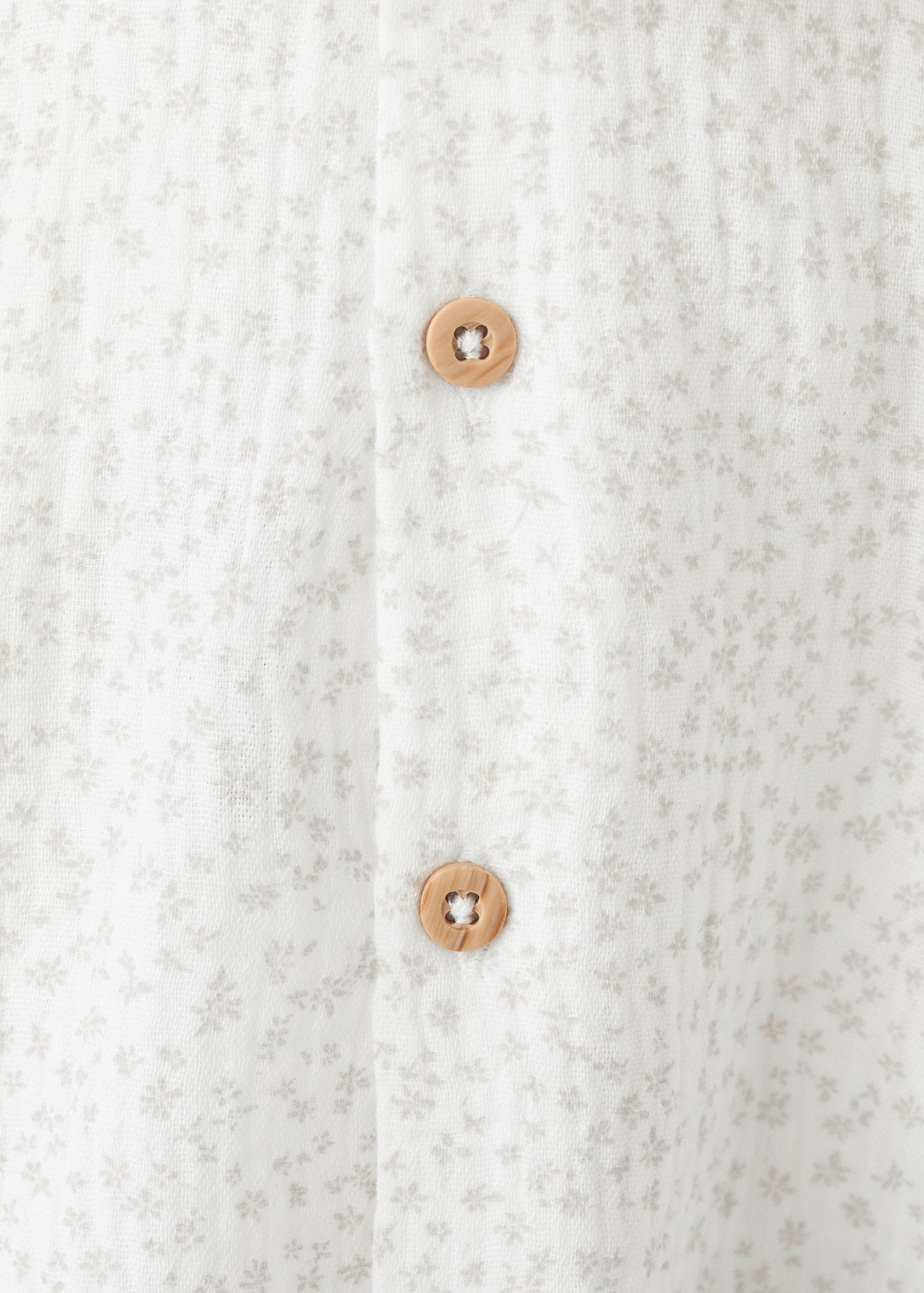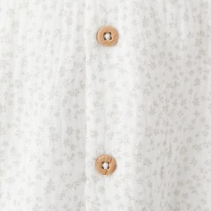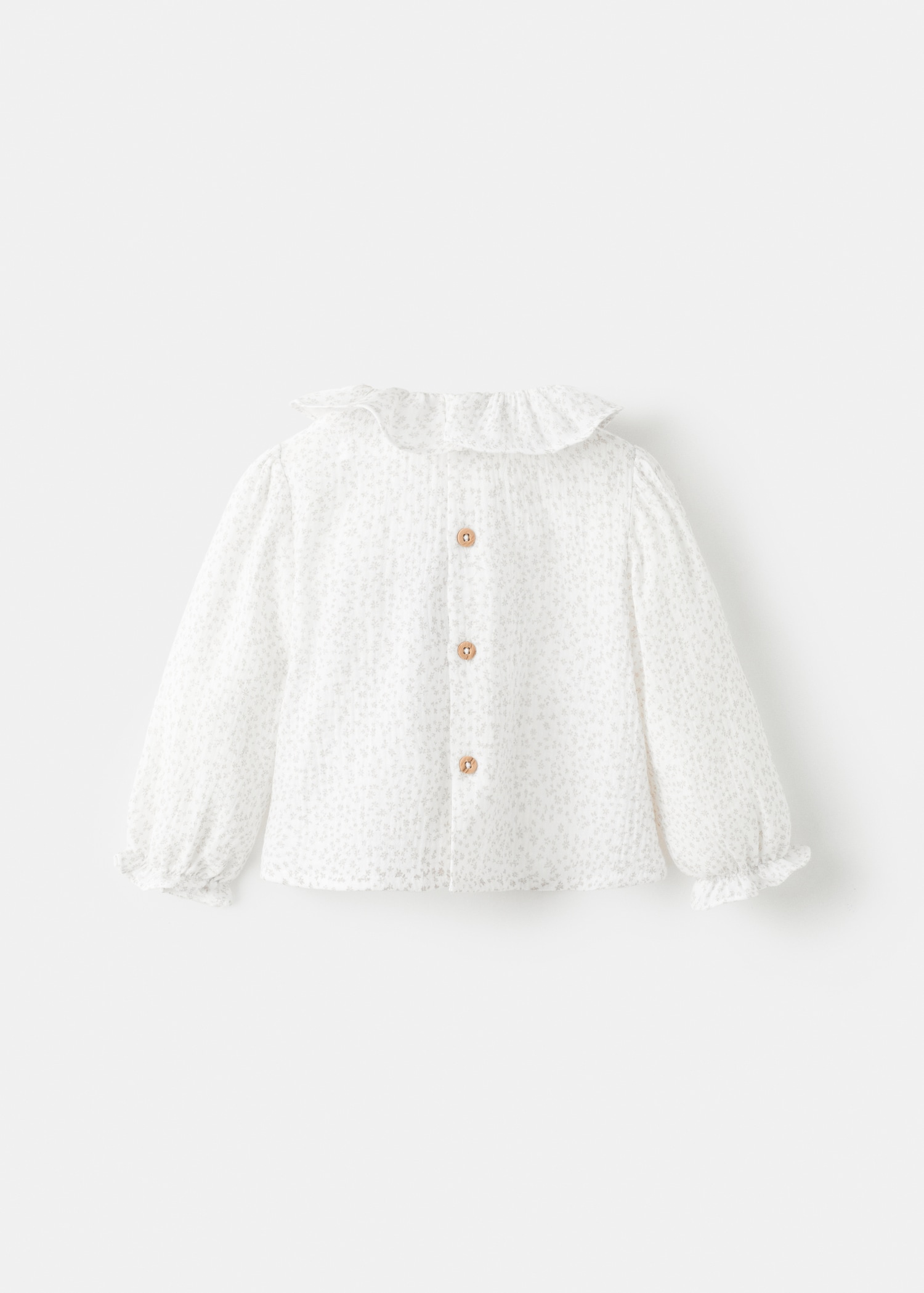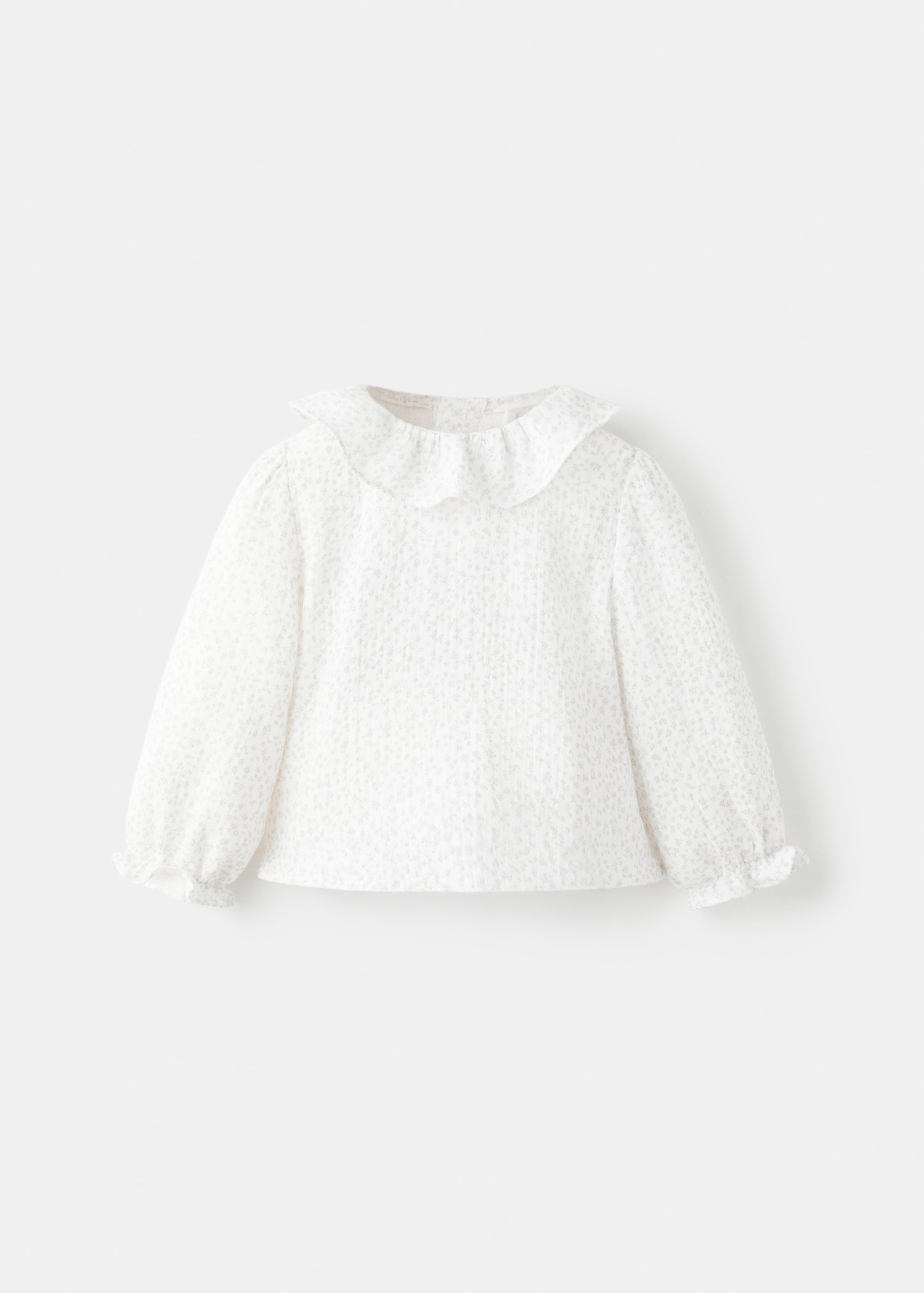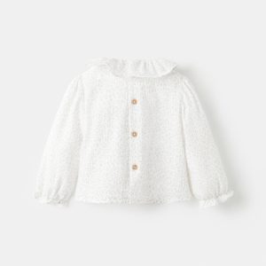 100% cotton fabric. Bambula fabric. Floral design. Peter Pan collar. Button closure at the back. Long sleeves with ribbed trims