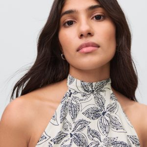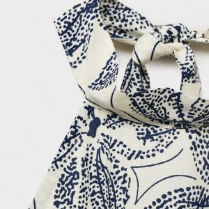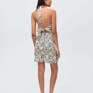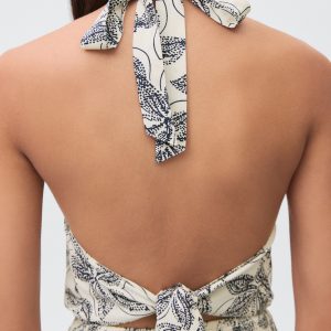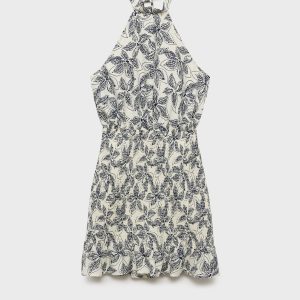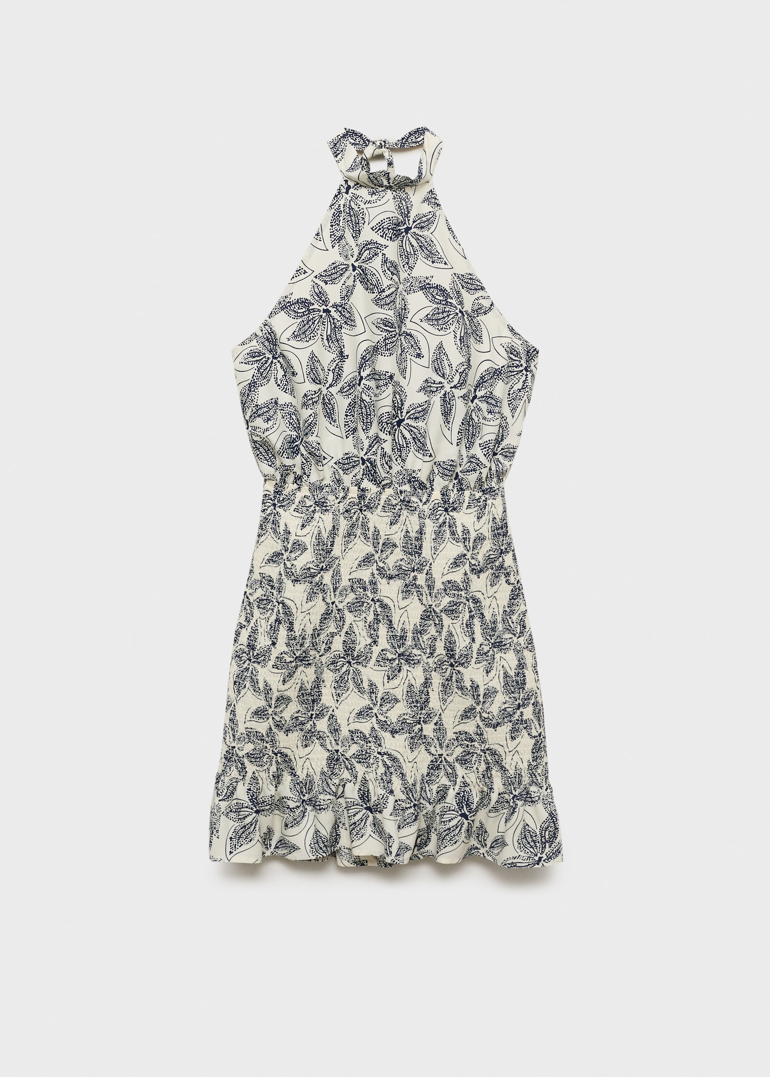 Fluid viscose fabric. Straight Design. Floral print. Halter neck. Bow fastening on the neck. Open back. The body of the dress features a honeycomb panel. Frill on the bottom