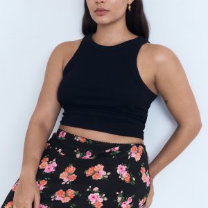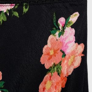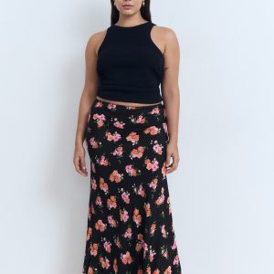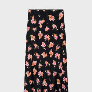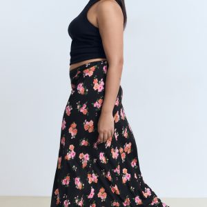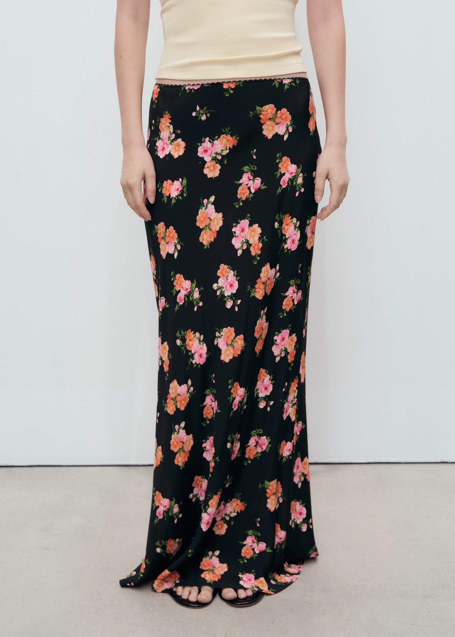 Long design. A-line design. Floral print. Elastic waist. Lace finish. No closure. Available Plus