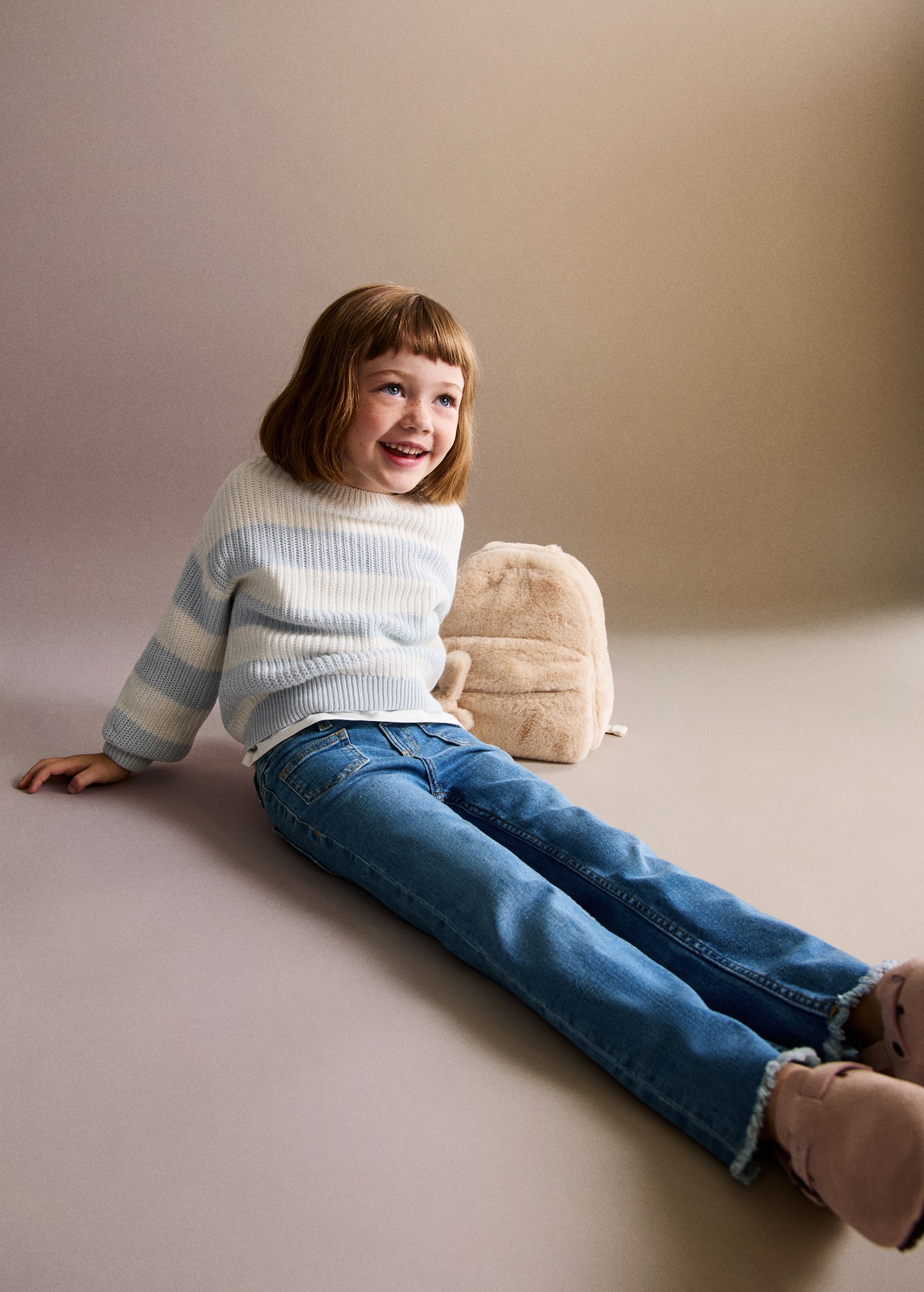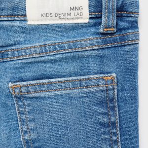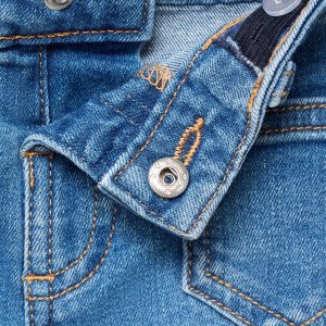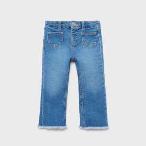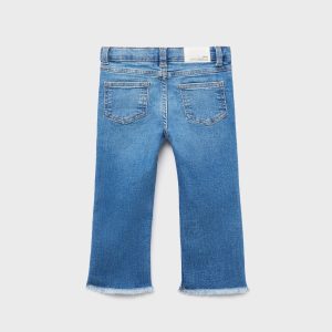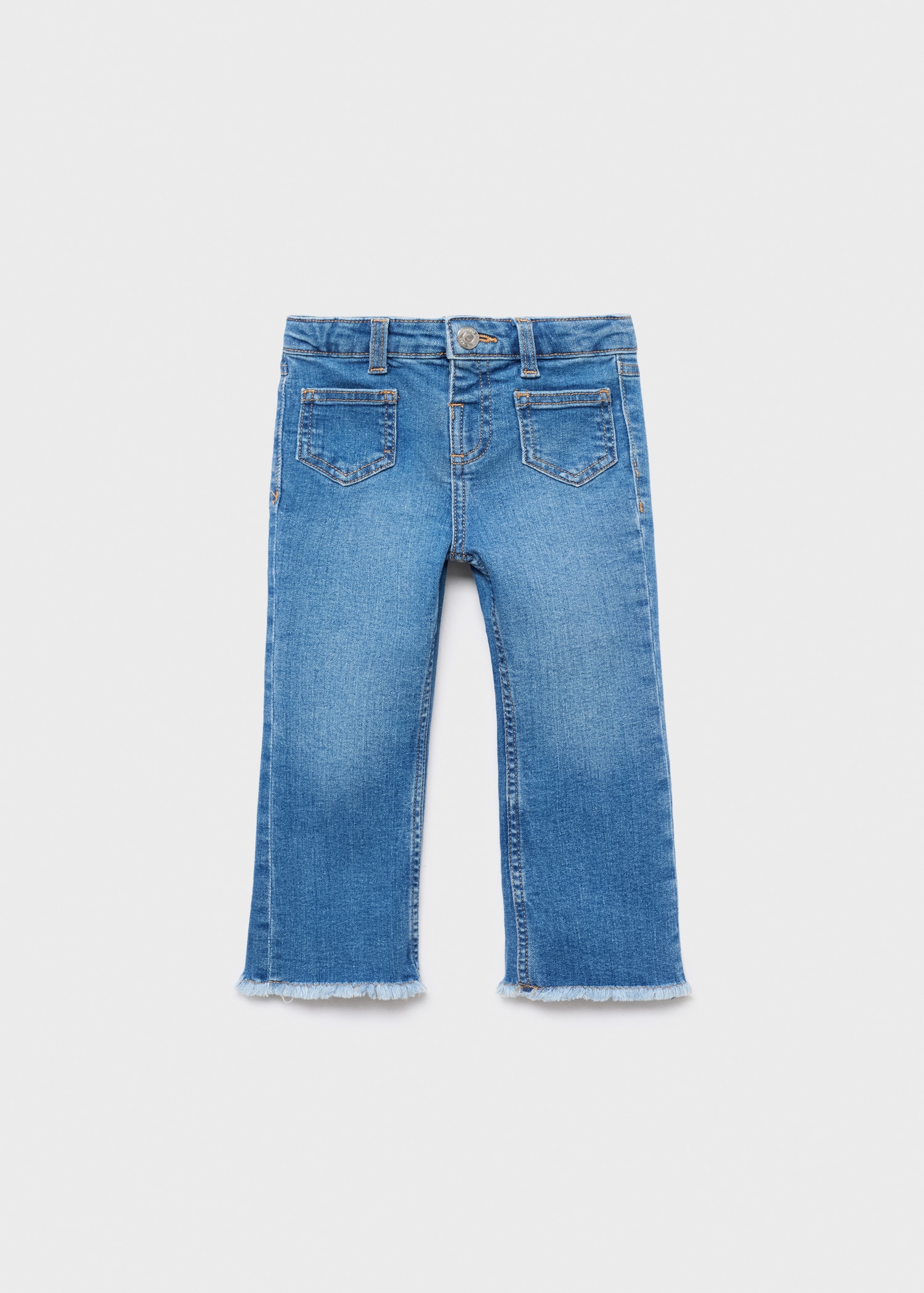 Cotton fabric. Stretch fabric. Long design. Flare design. Belt loops. Button closure. Two front patch pockets. Two patch pockets at the back. Frayed hem. Back to school