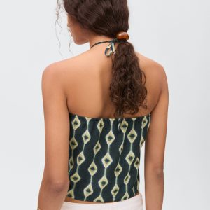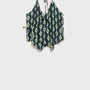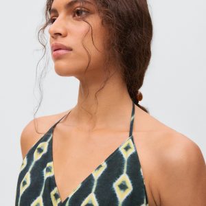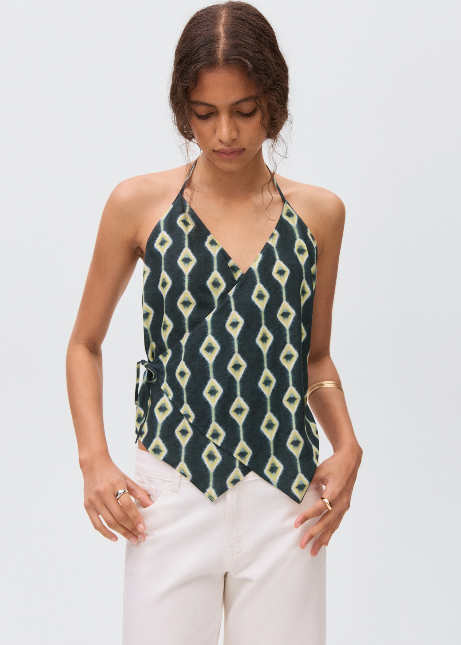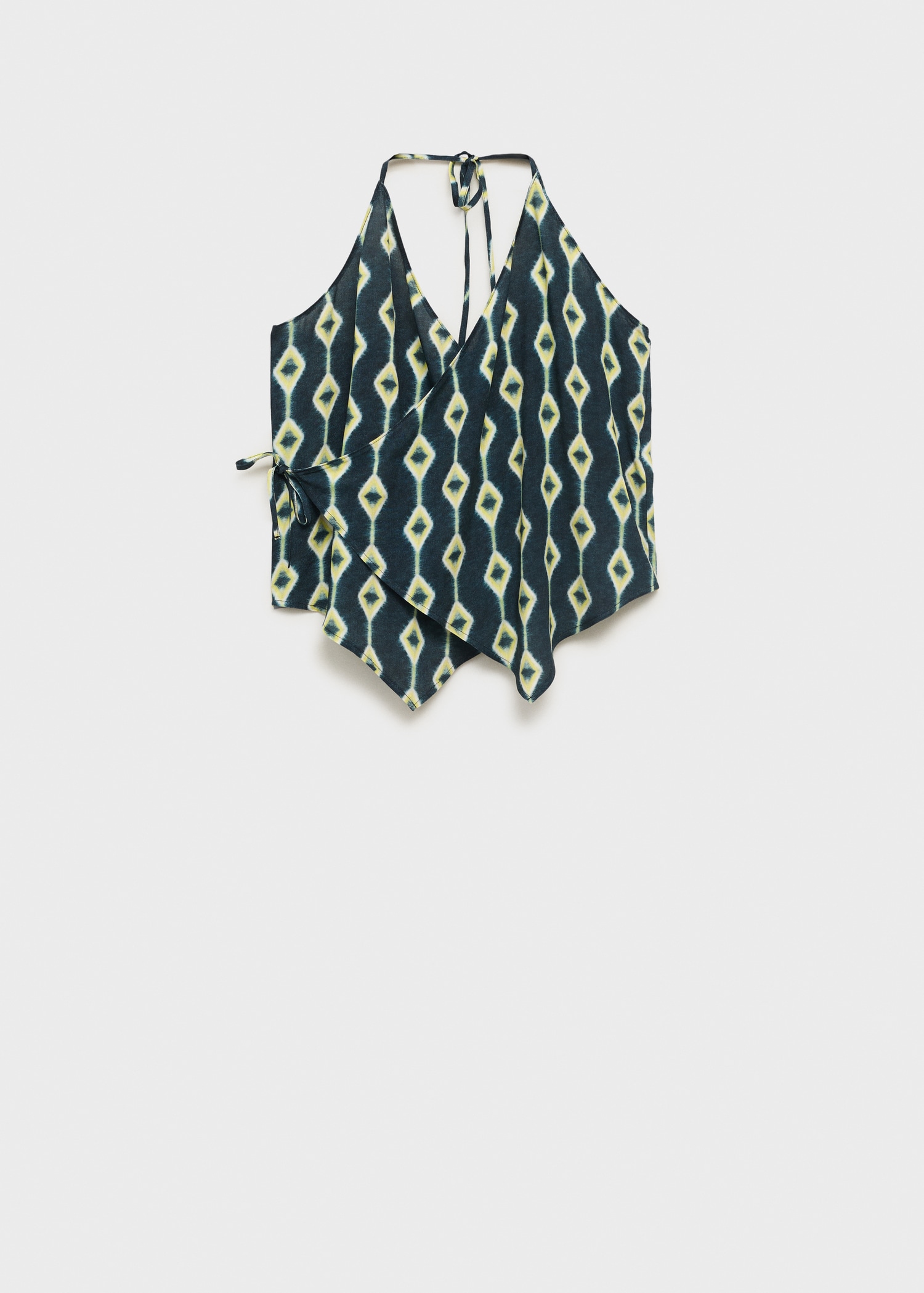 Fluid fabric. Asymmetric design. Printed design. Halter neck. Wrap design. Neck closure. Tie closure. Open back. Total look. Promotional product