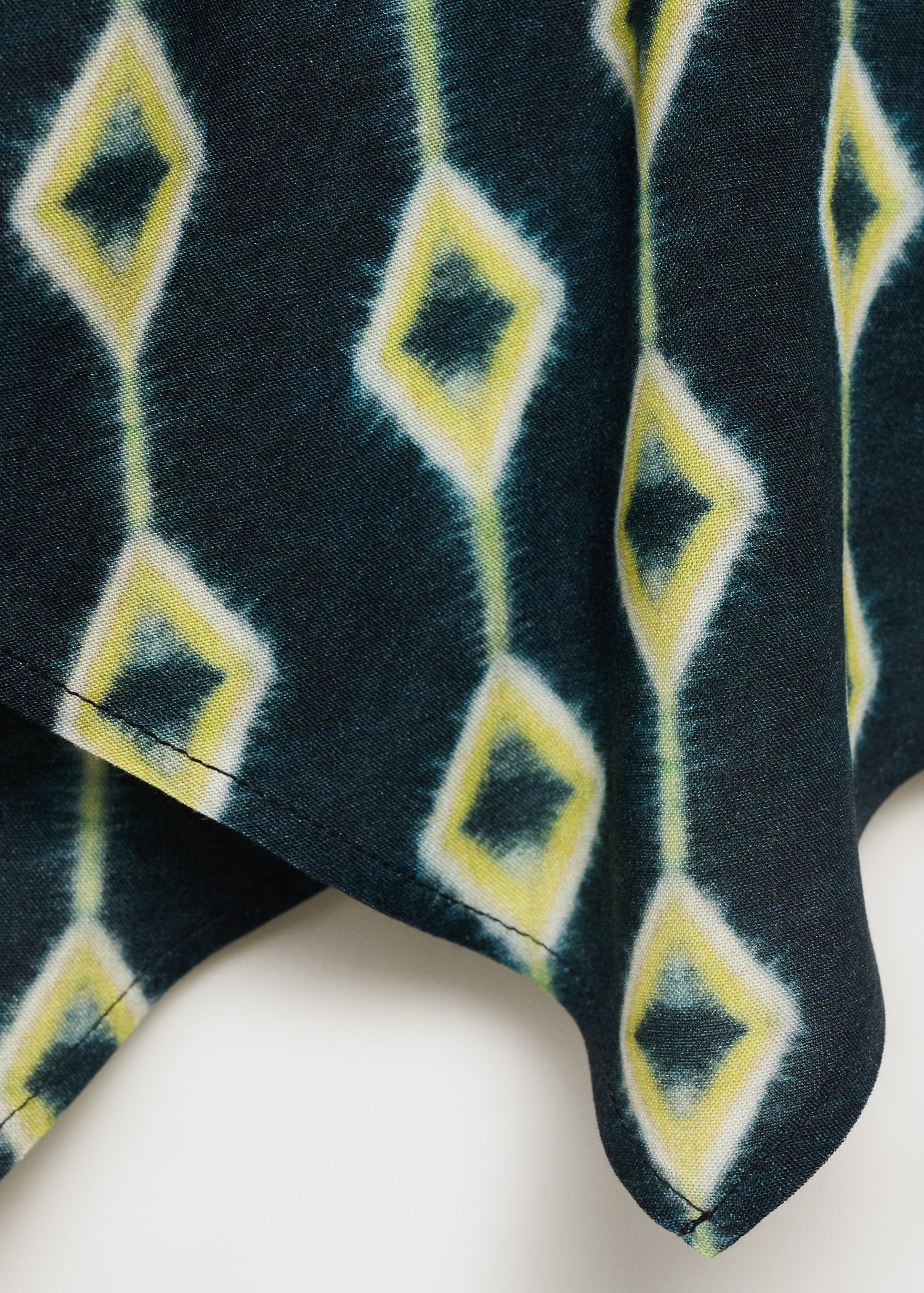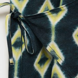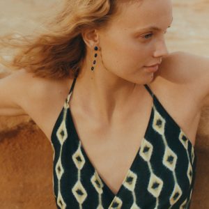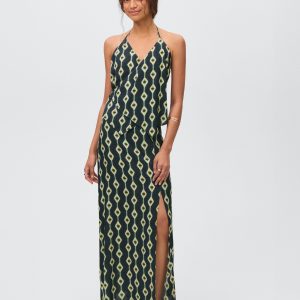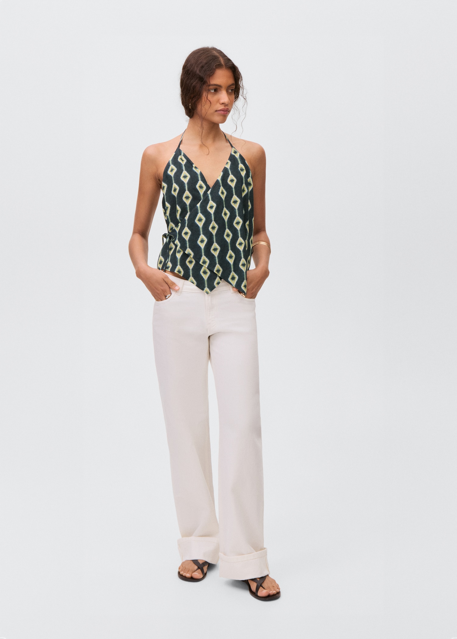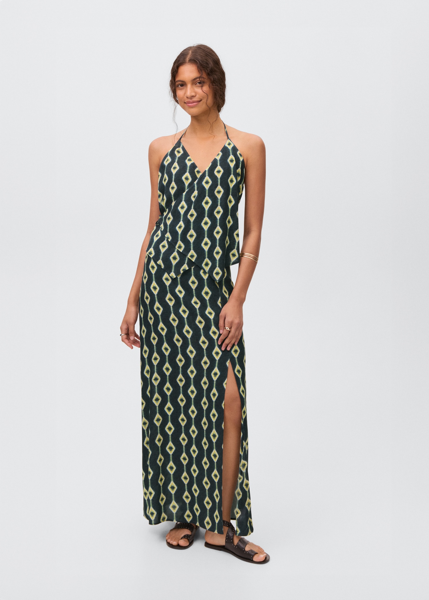 Fluid fabric. Asymmetric design. Printed design. Halter neck. Wrap design. Neck closure. Tie closure. Open back. Total look. Promotional product