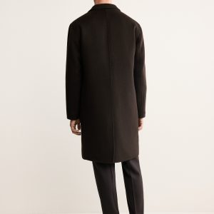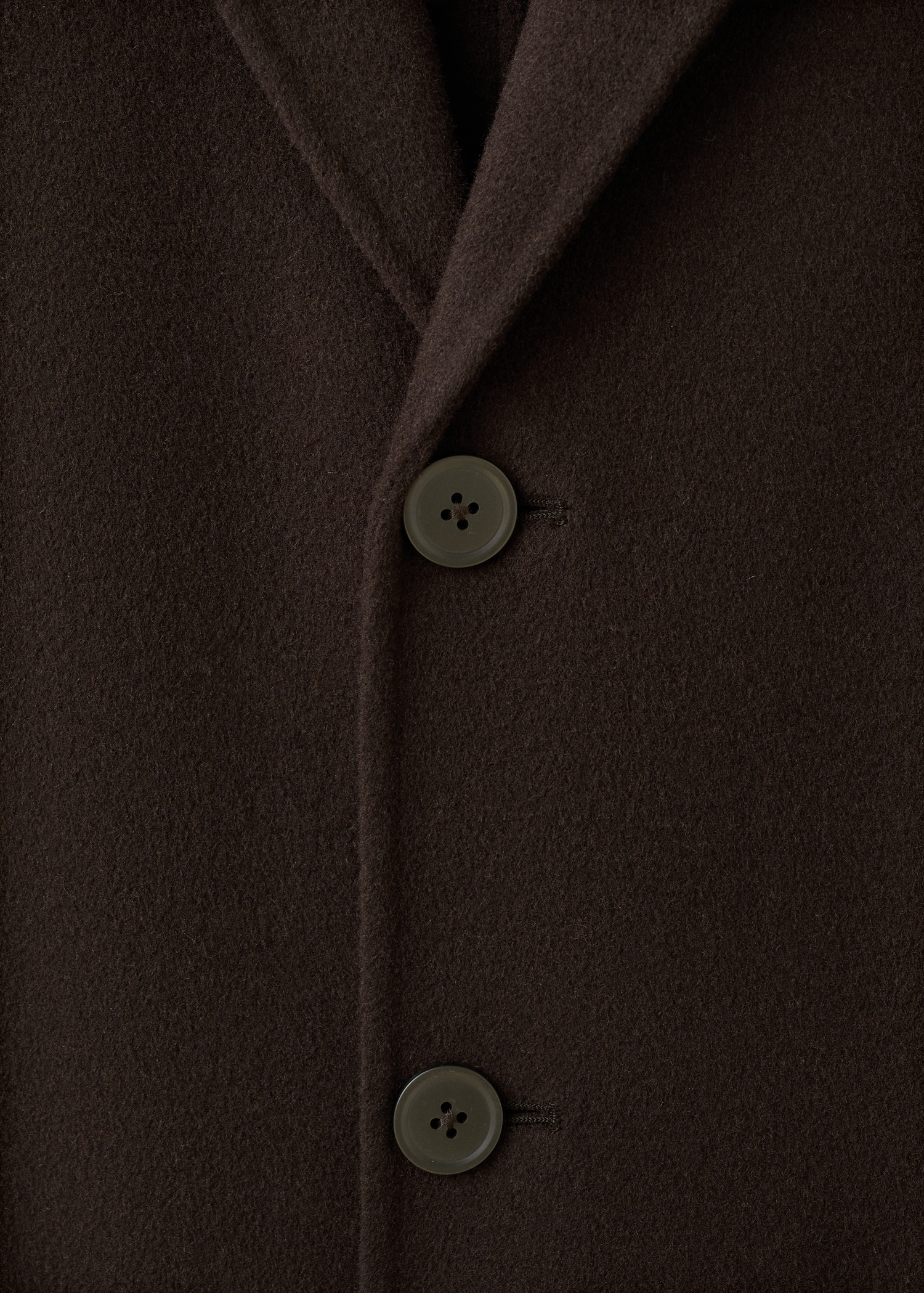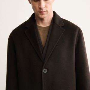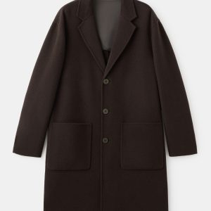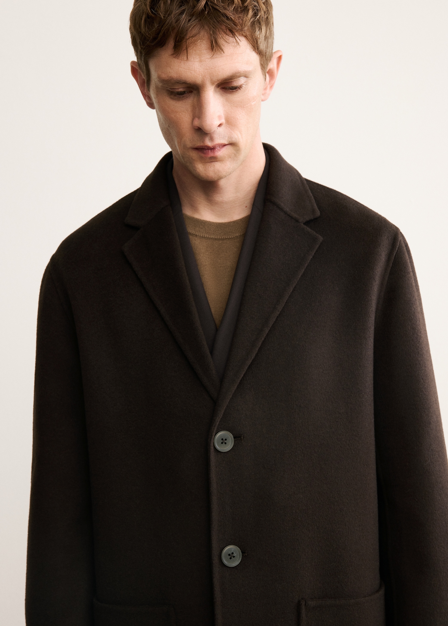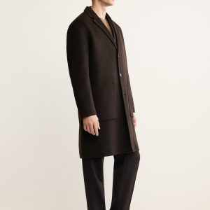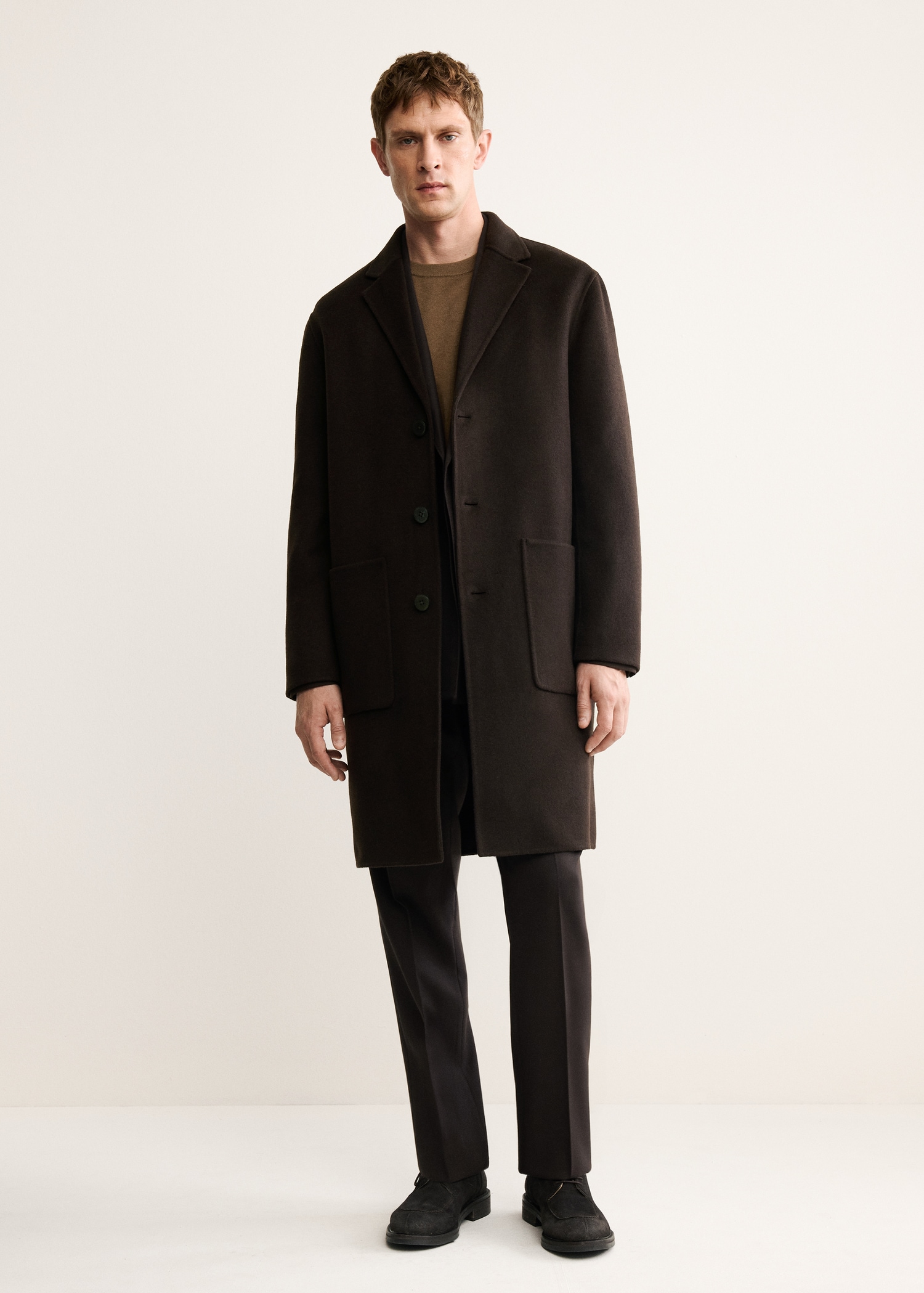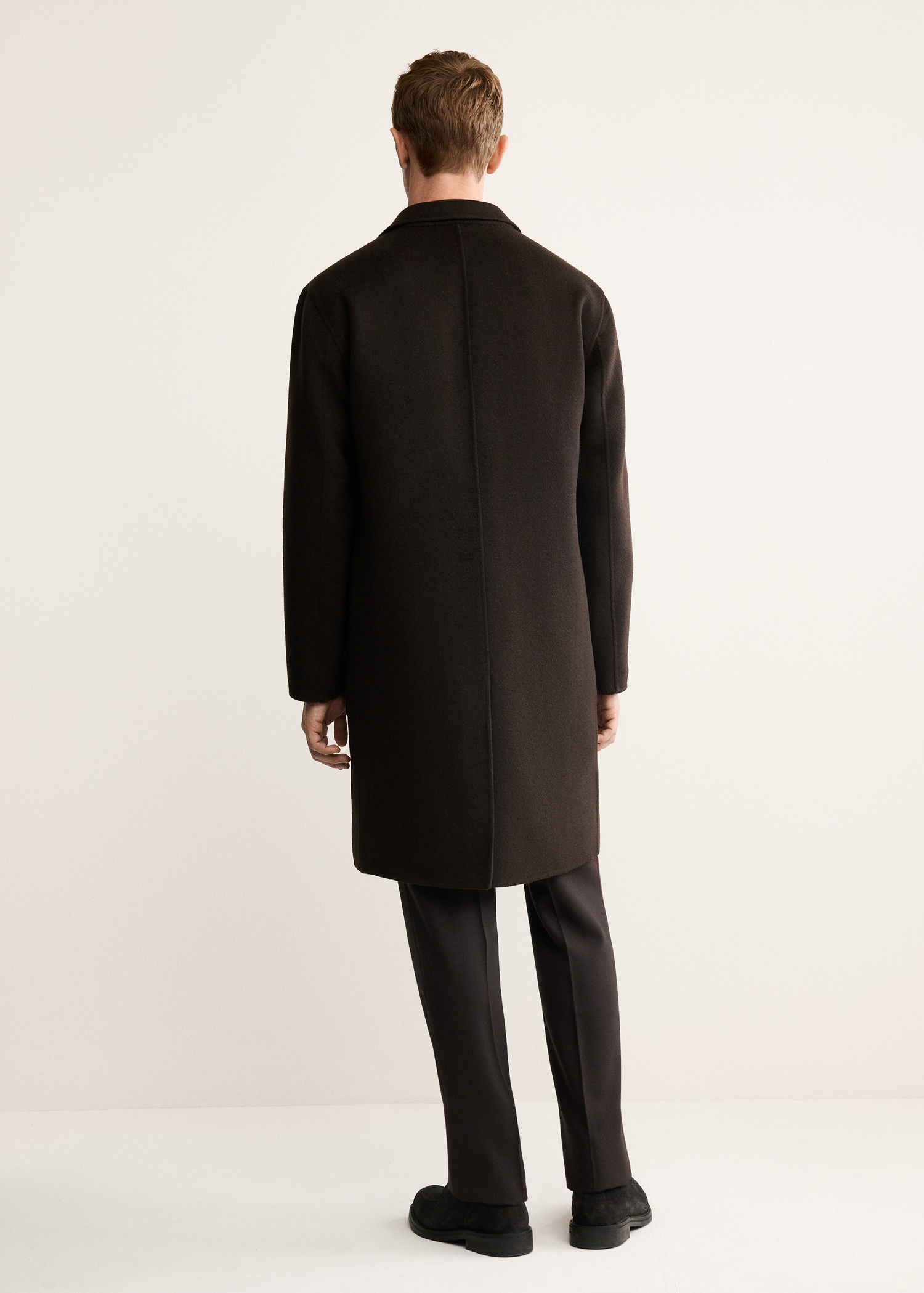 Handmade wool coat. Straight silhouette. Notched lapel collar. Long Sleeve. Two side patch pockets. Mid Length. Back Slit at the Hem. Front button closure. Partial inner lining. SELECTION: A collection of classic garments featuring minimalist lines and a meticulously crafted design. Made from high-quality fabrics to create a timeless and stylish wardrobe