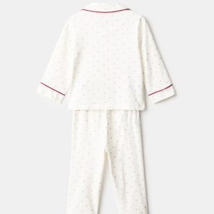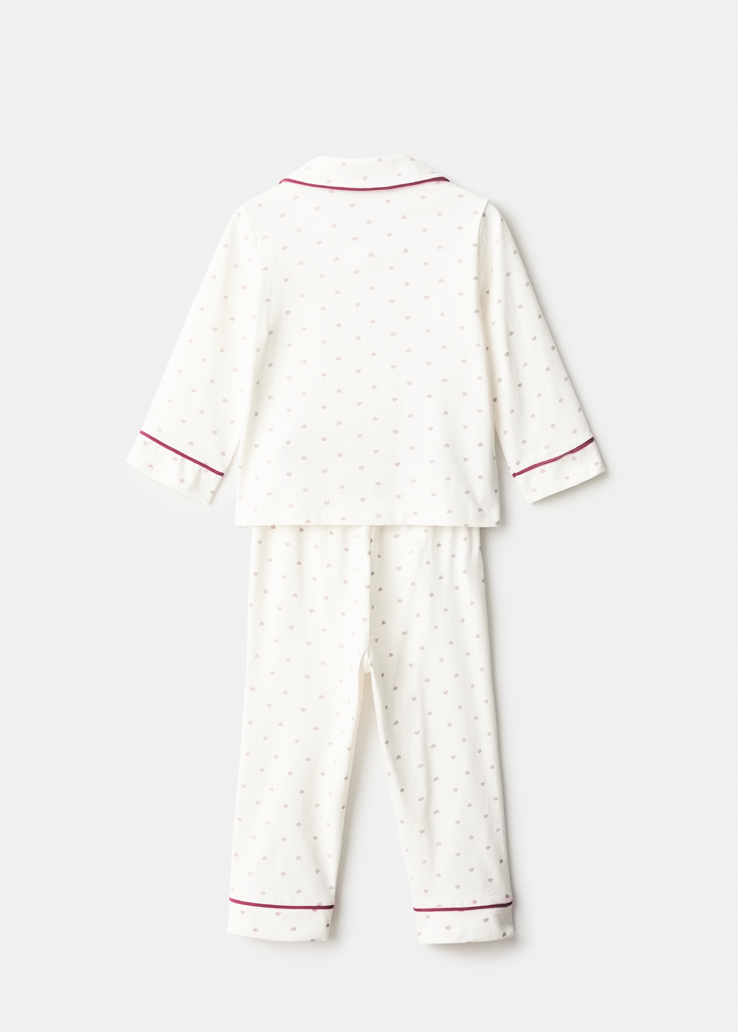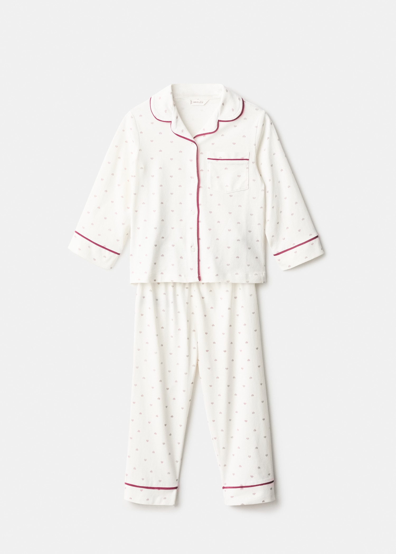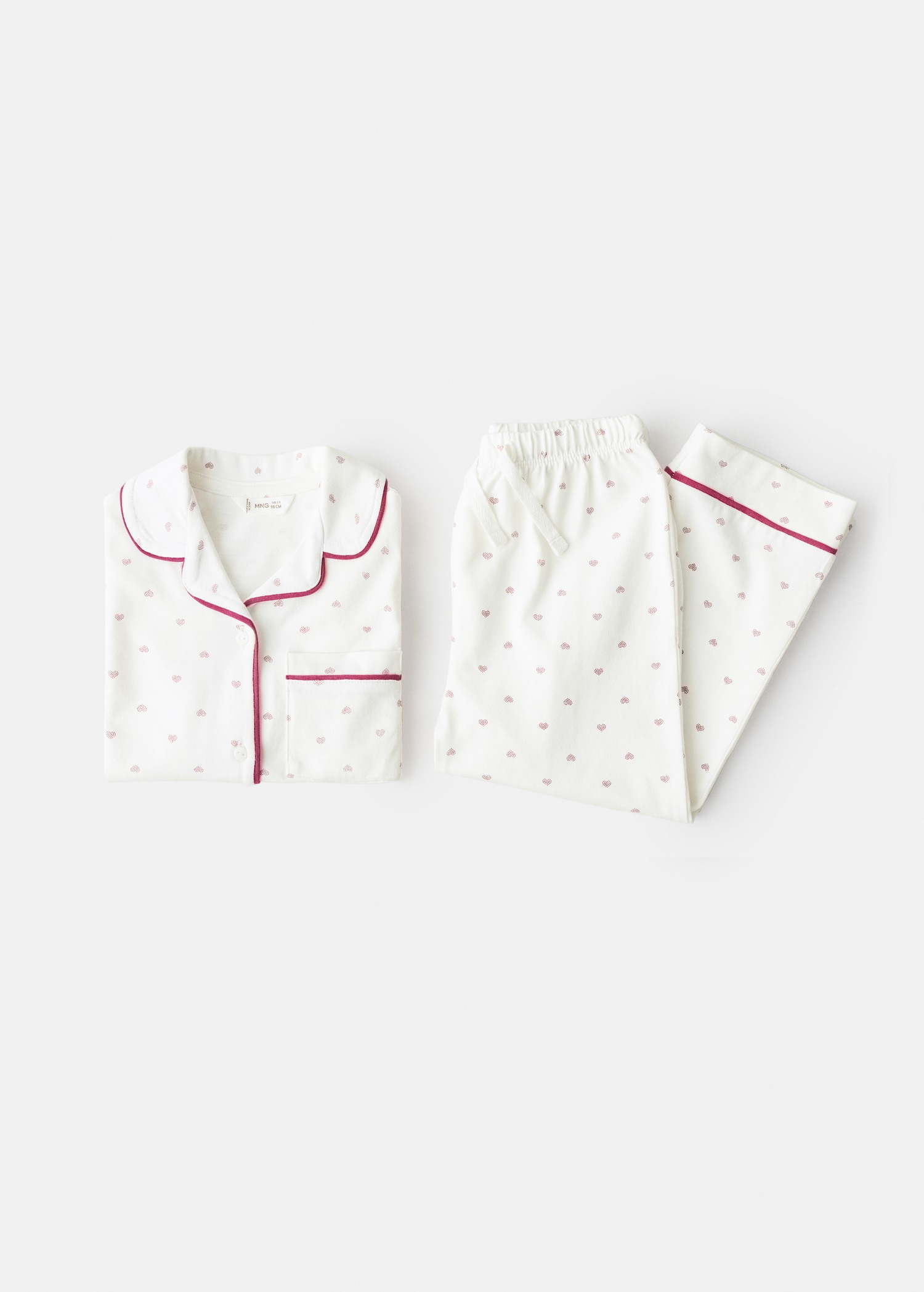 Long pajama pack. 100% cotton fabric. Hearts design. Shirt collar. Patch pocket. Contrasting finishes. Front button closure. Elastic waist with drawstring