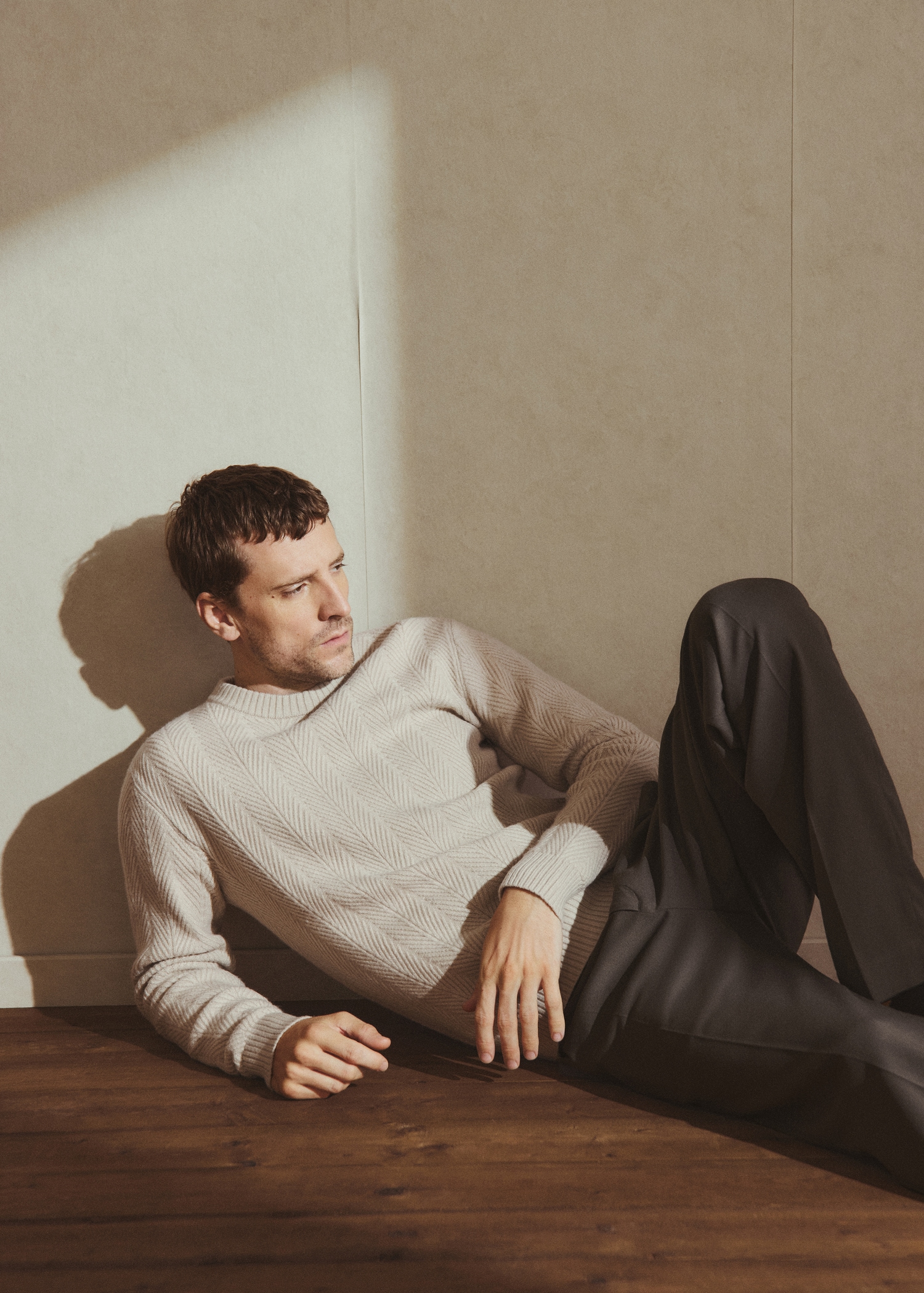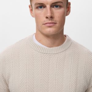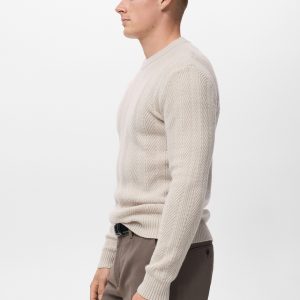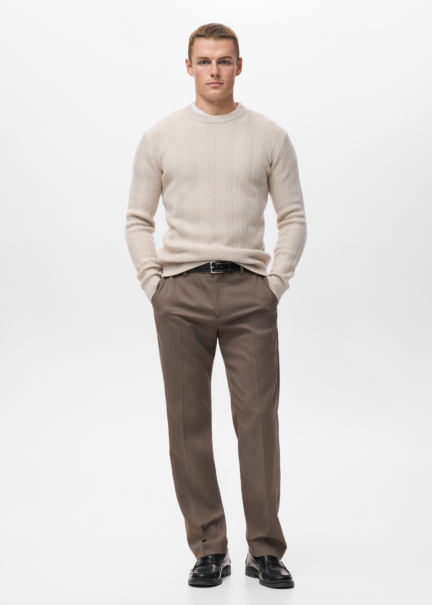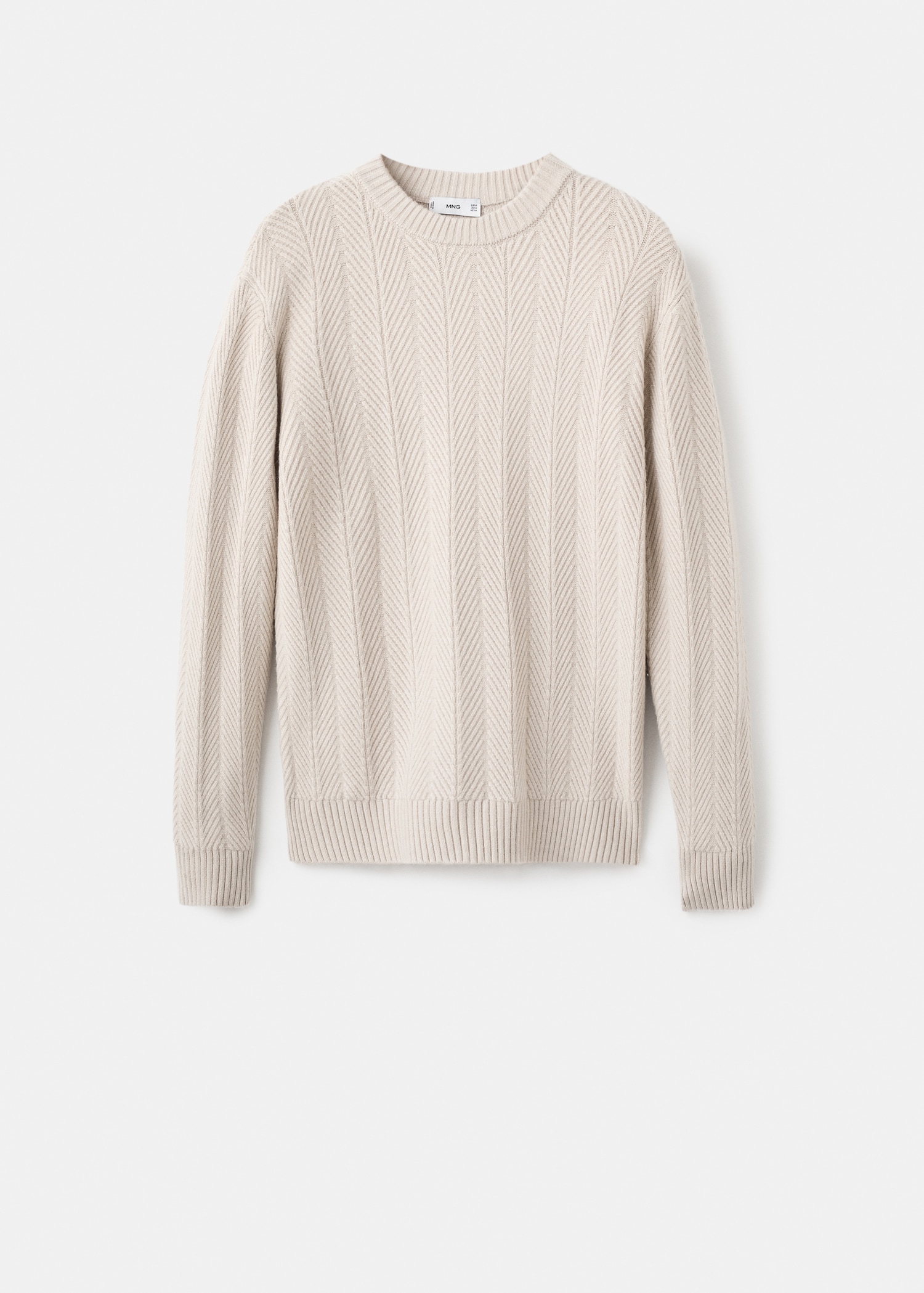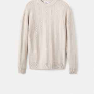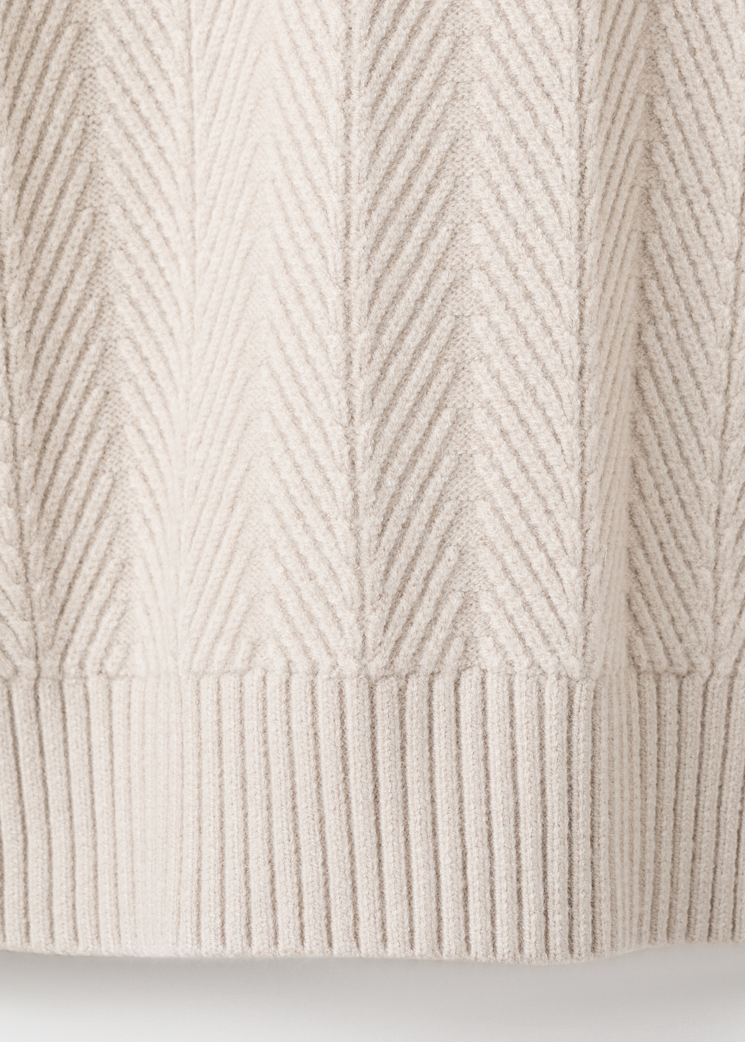 Straight silhouette. Fine herringbone knitted fabric. Crew neck. Ribbed neck, cuffs and hem. Long sleeves with elastic cuffs. Straight hem