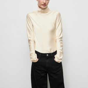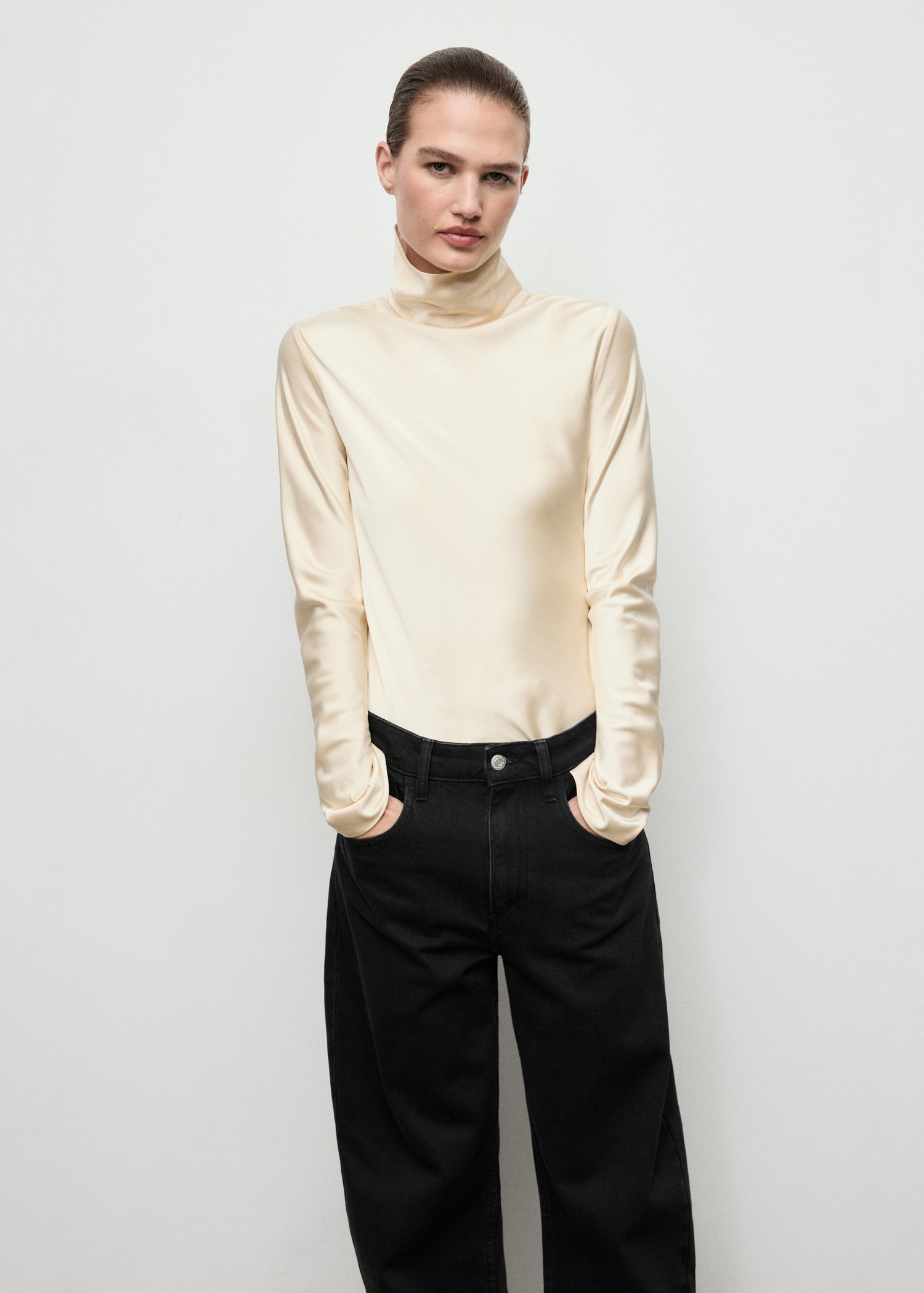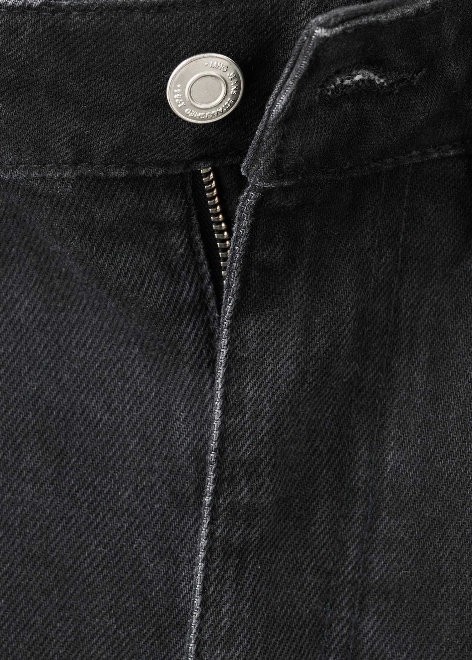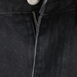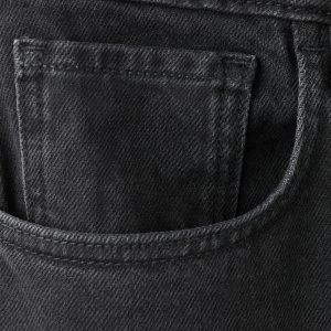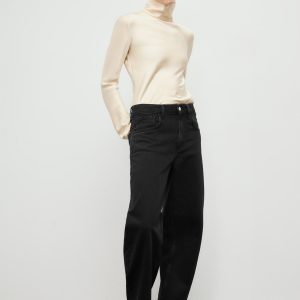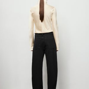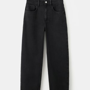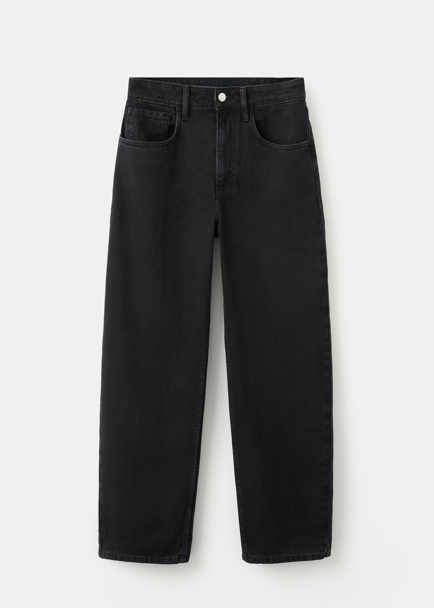 Cotton denim fabric. Long design. Balloon design. Barrel style. High-rise. Belt loops. Five pockets. Button and zipper closure. Inside length 29.5 in