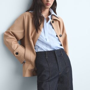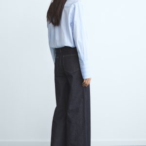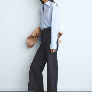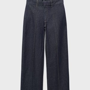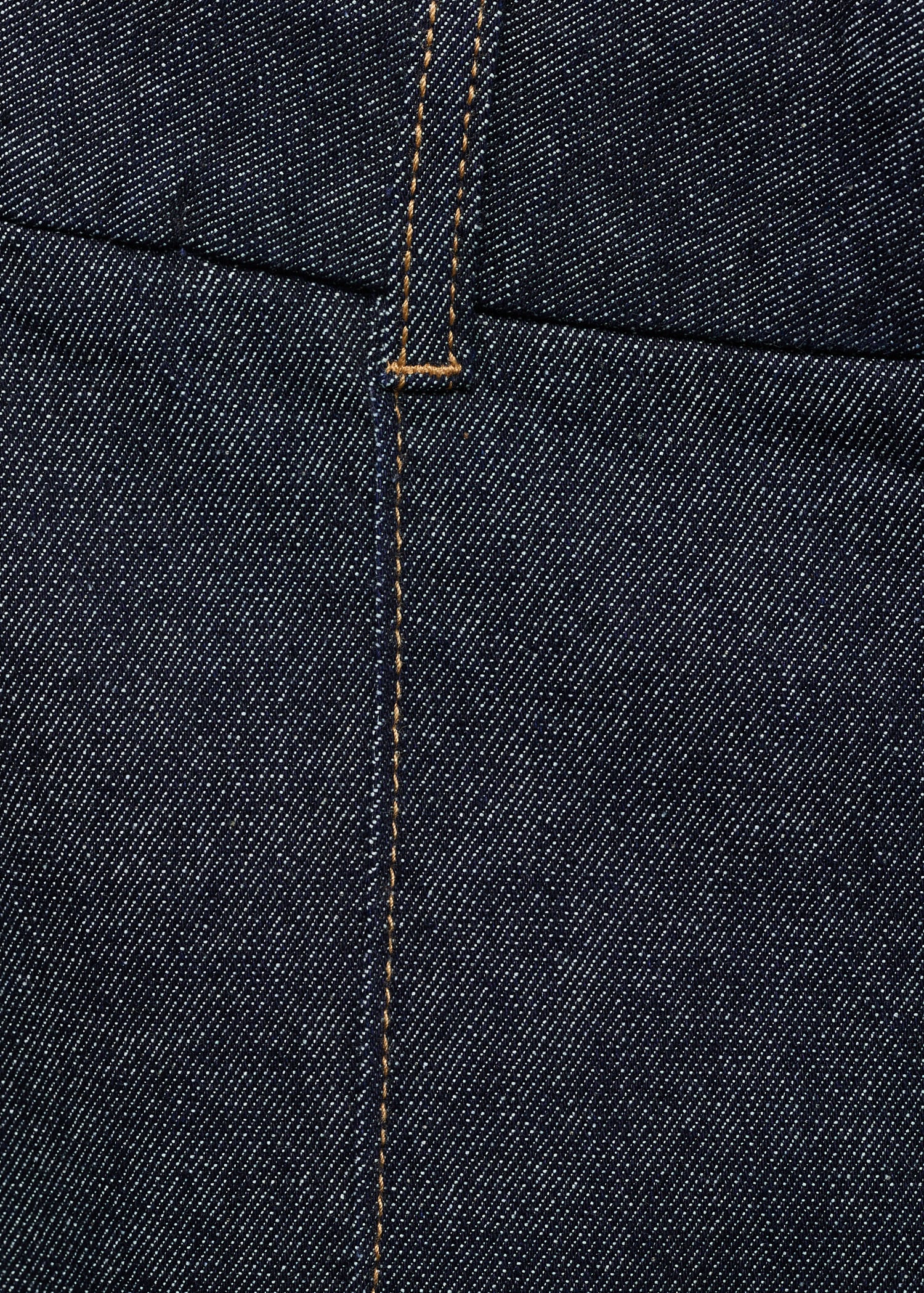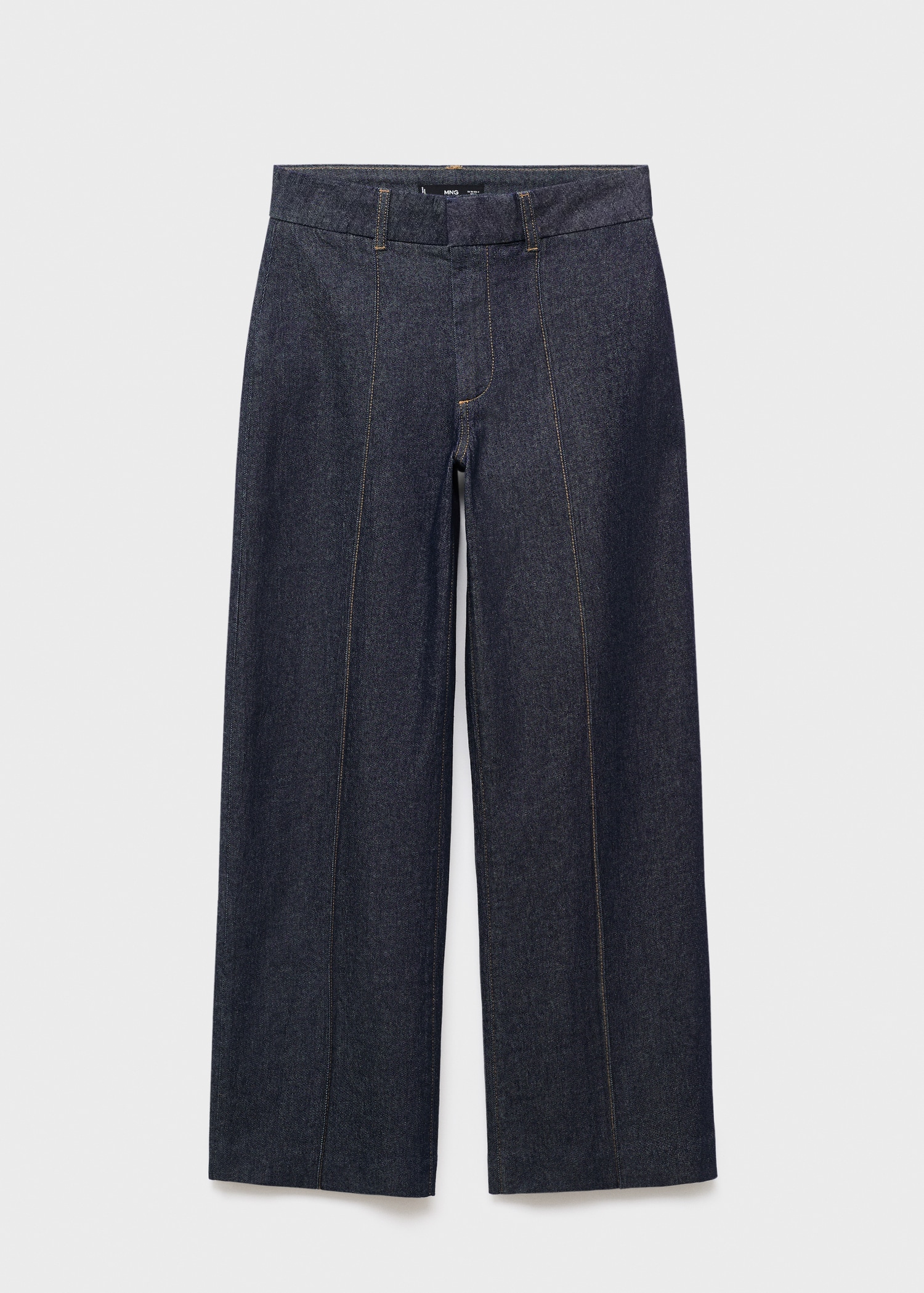 Cotton denim fabric. Standard Length. Culotte design. Wide leg design. High-rise. Belt loops. Two patch pockets at the back. Stitching detail. Concealed button, hook and zip fastening. Inseam 29.9 in. Comfort fabric with elasticity