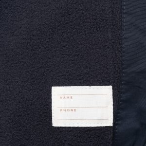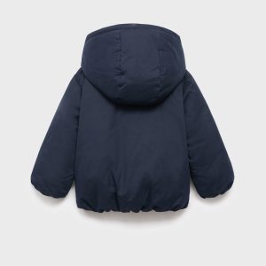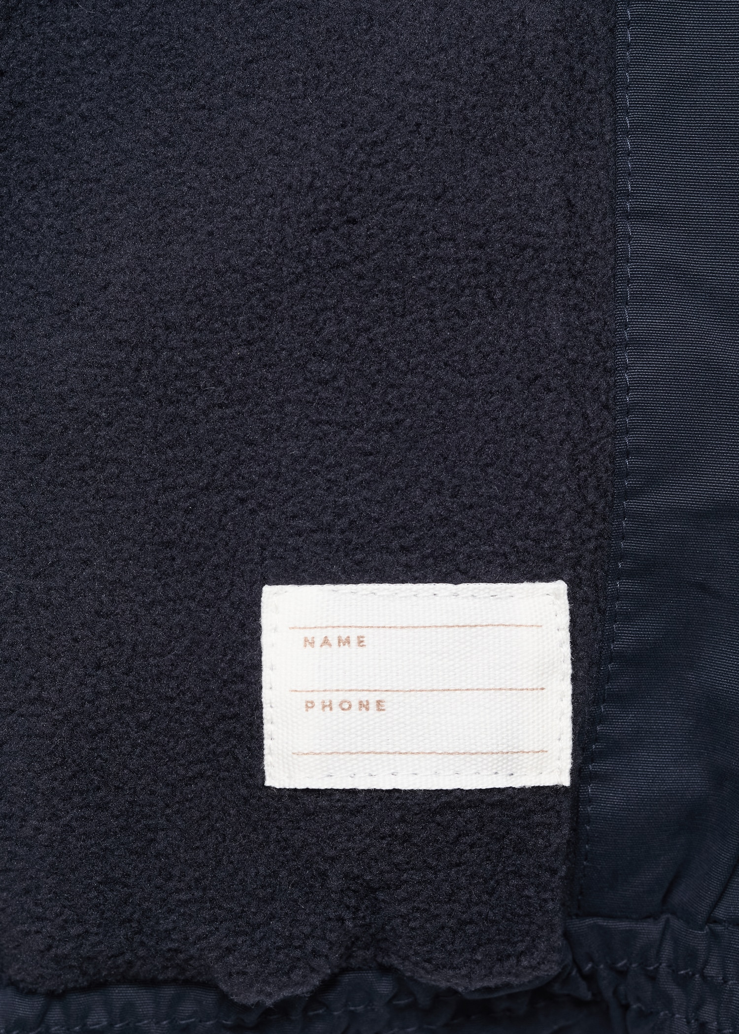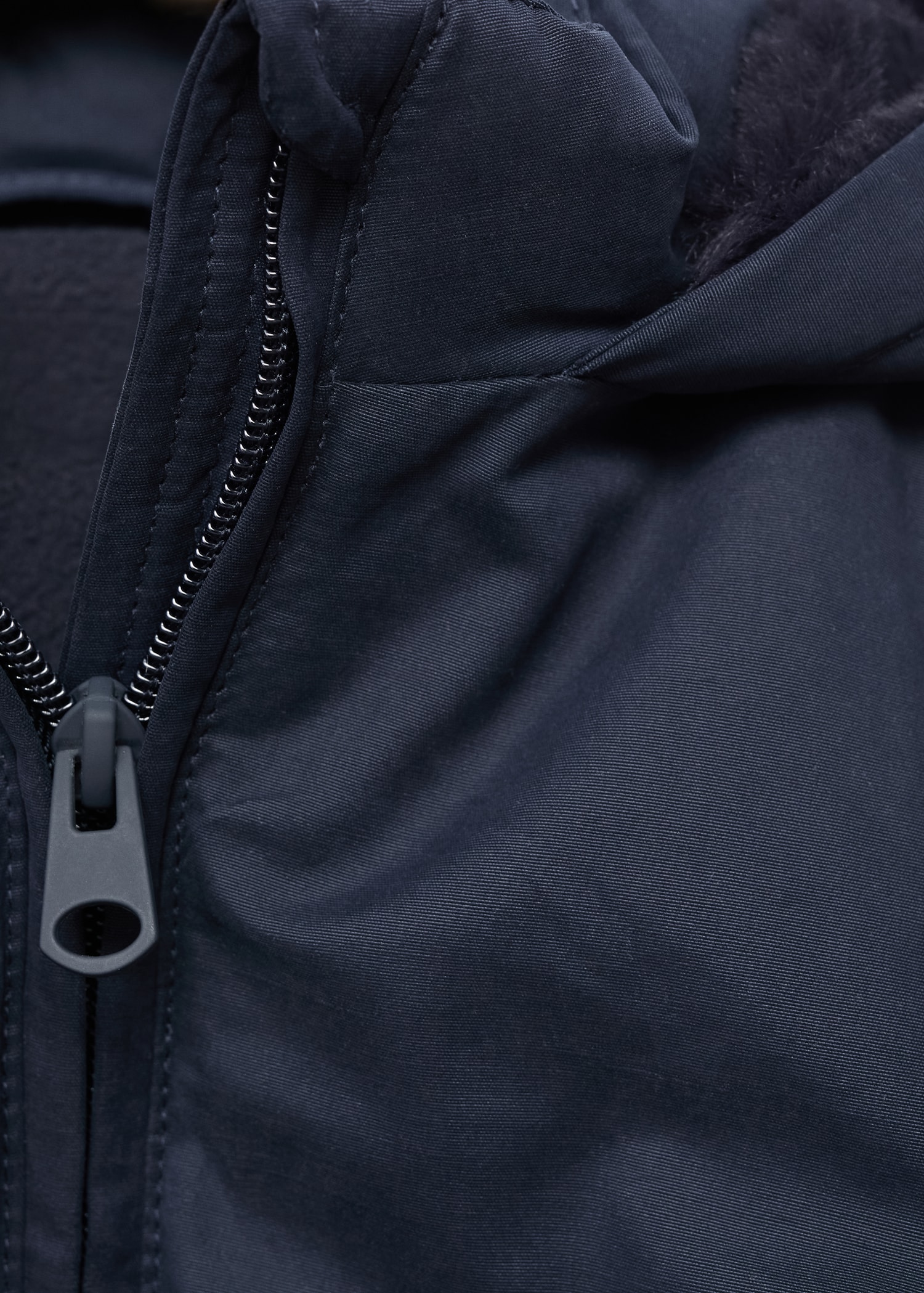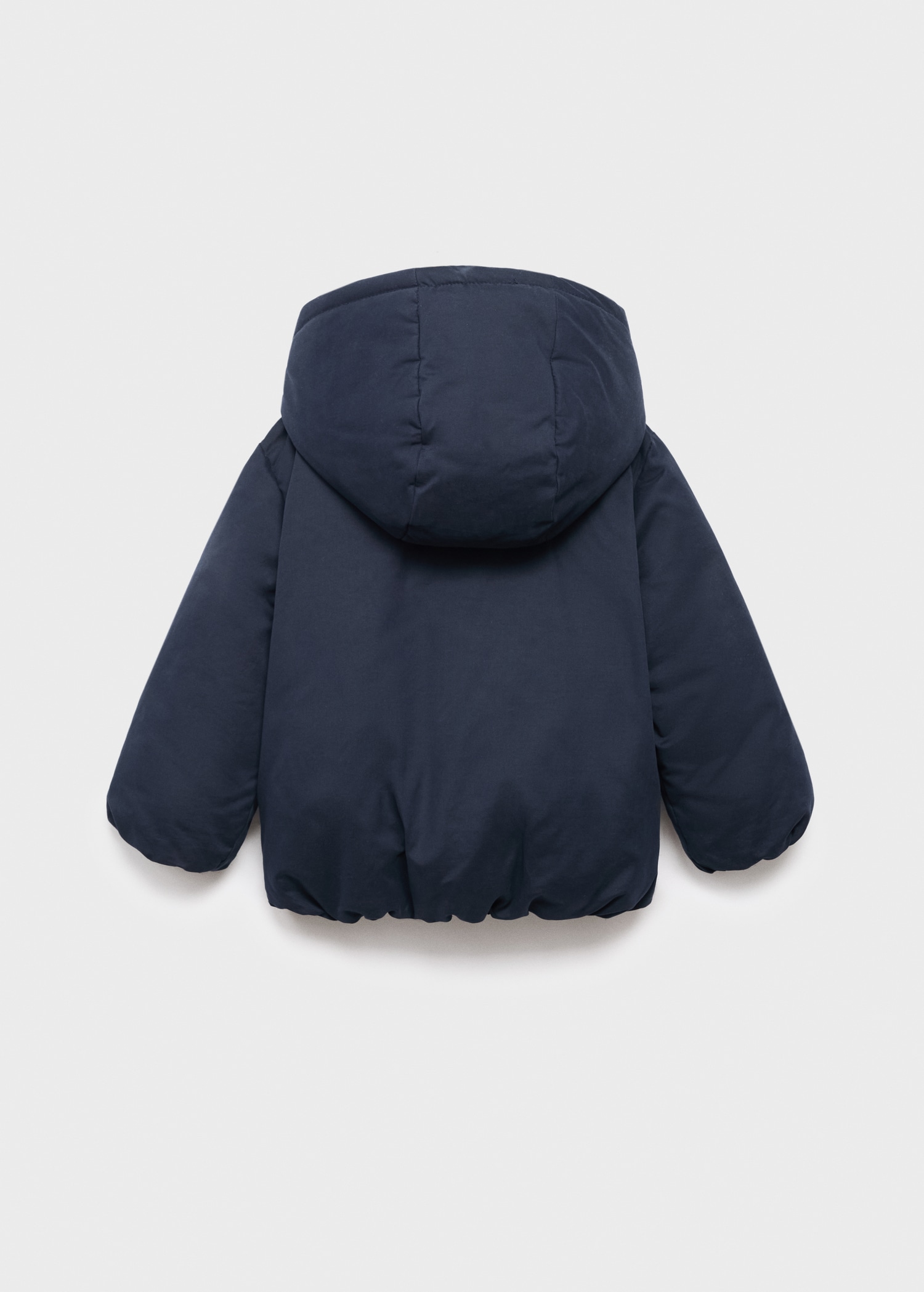 Quilted fabric. Straight Design. Long design. Crew neck. With hood. Long Sleeve. Two side pockets. Label for personal data. Front zipper closure. Back to school