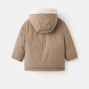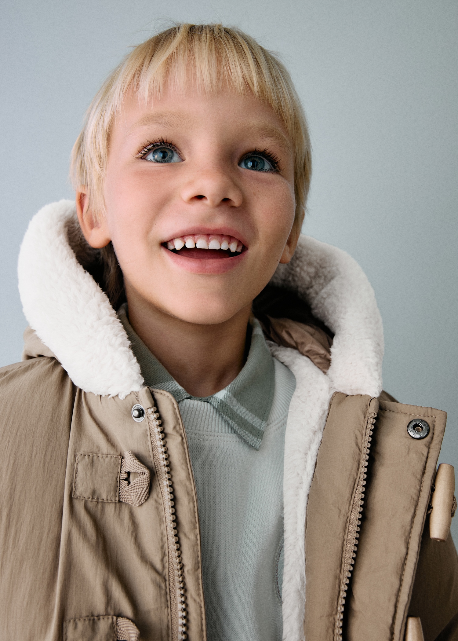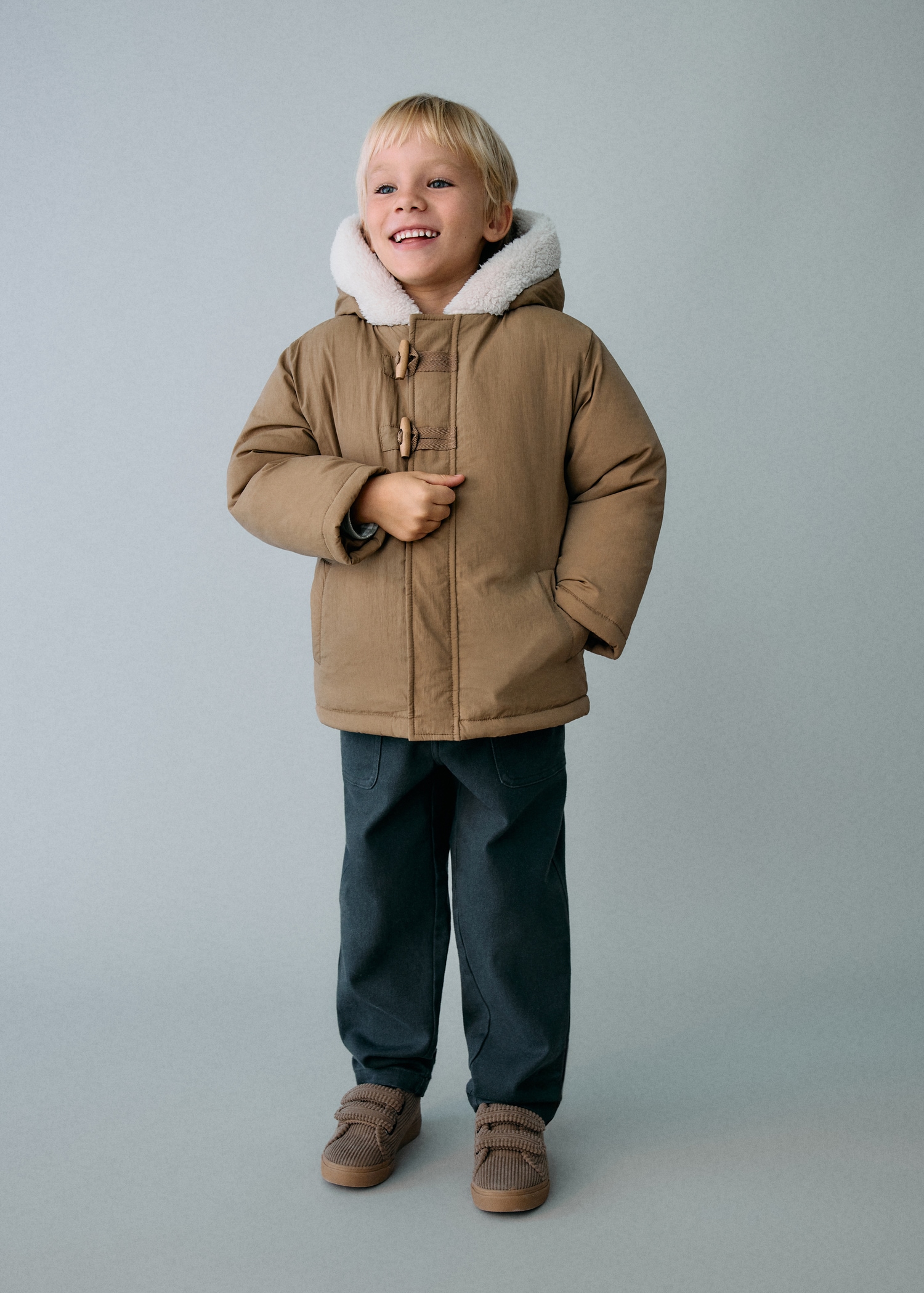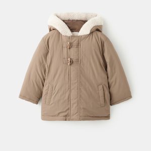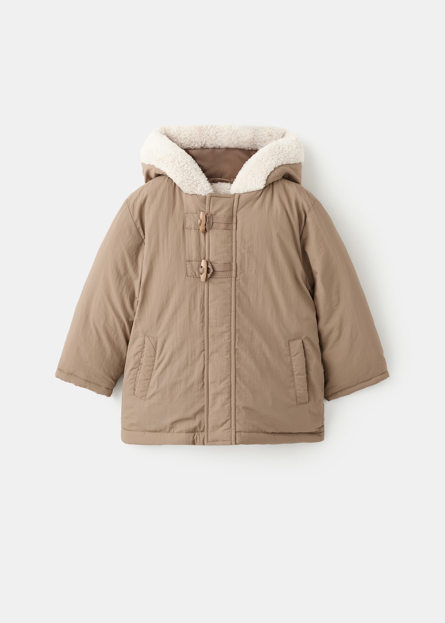 Quilted fabric. Long design. Straight Design. Faux shearling collar. Long Sleeve. Two side pockets. Front button closure