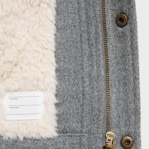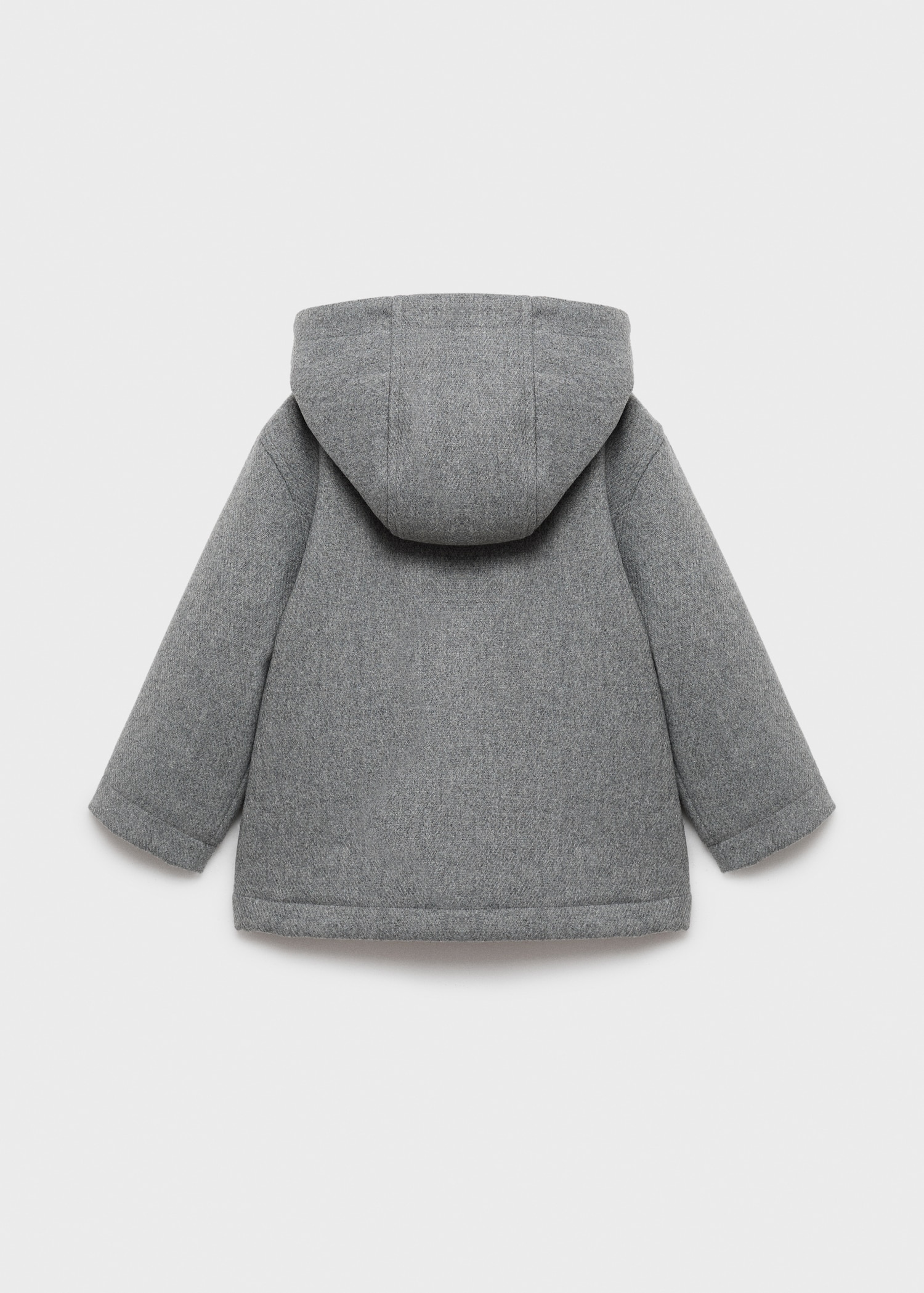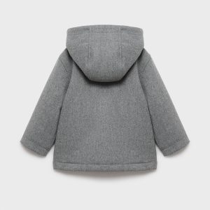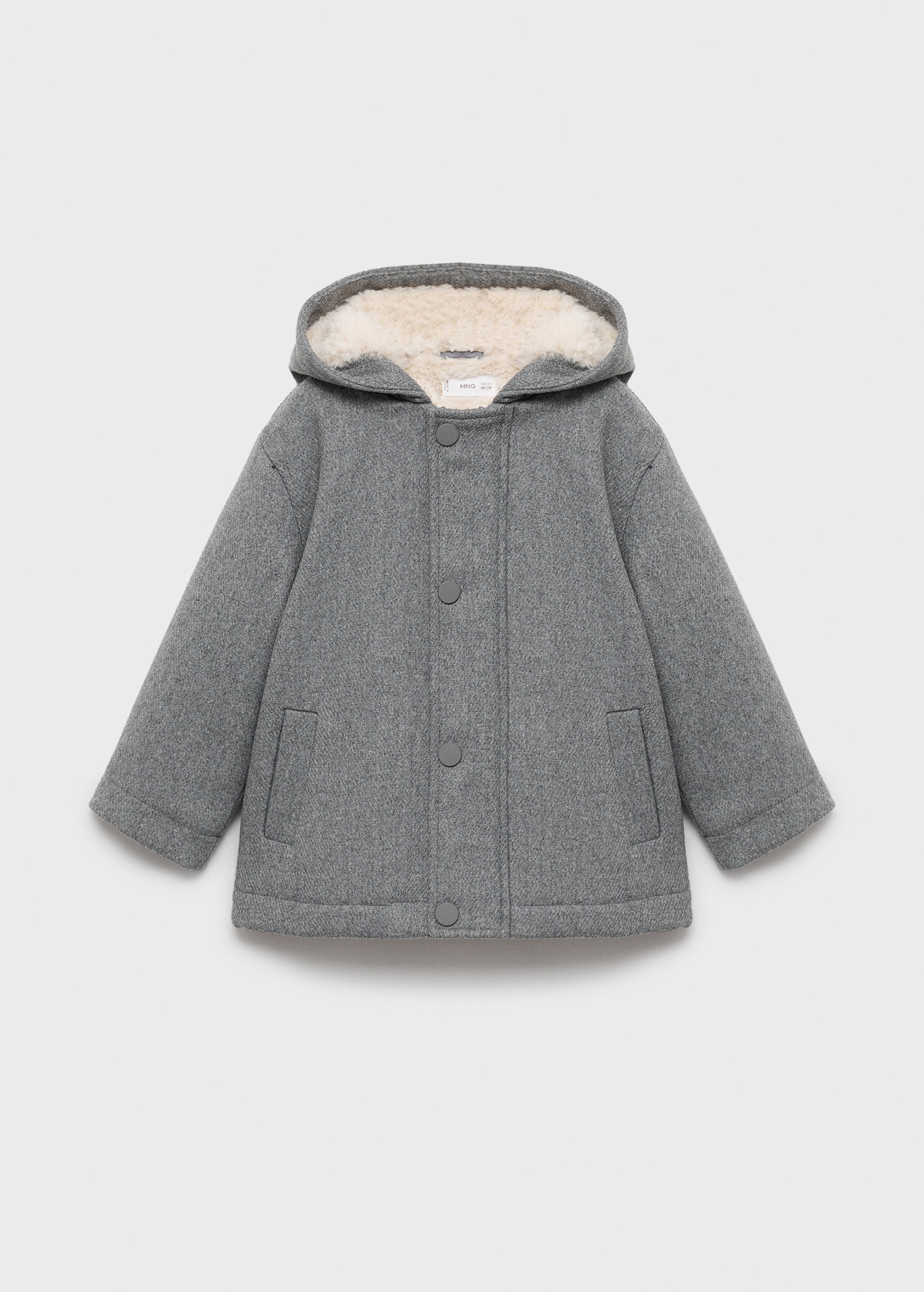 Wool mix fabric. Straight Design. With hood. Crew neck. Long Sleeve. Two side pockets. Faux shearling interior. Internal label for personal data. Front button closure. Back to school