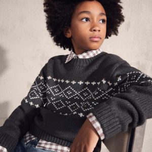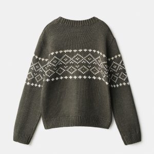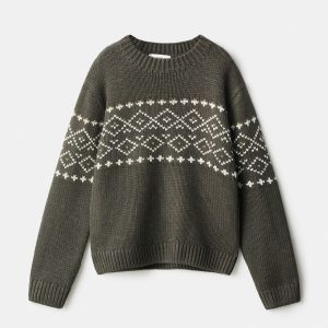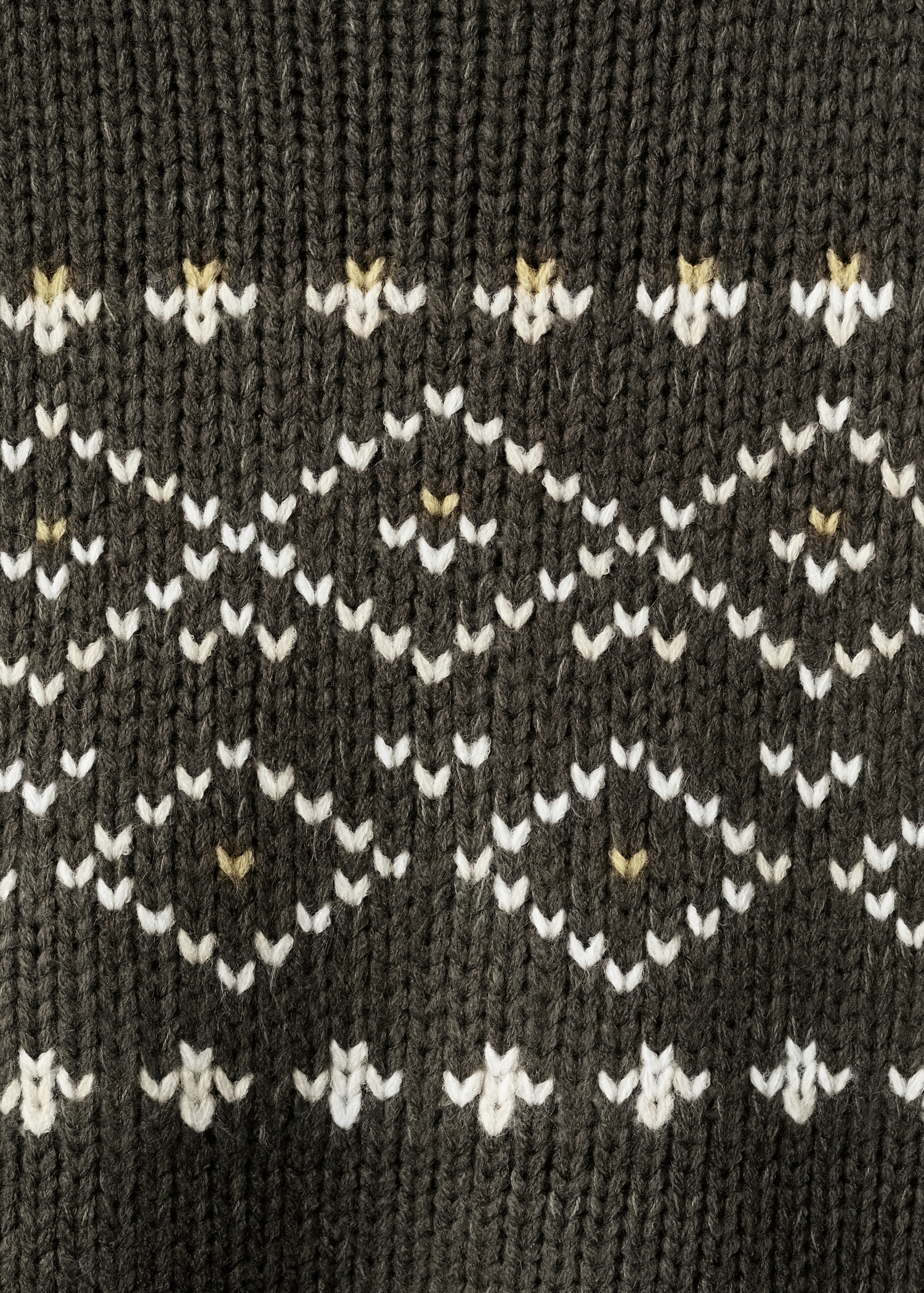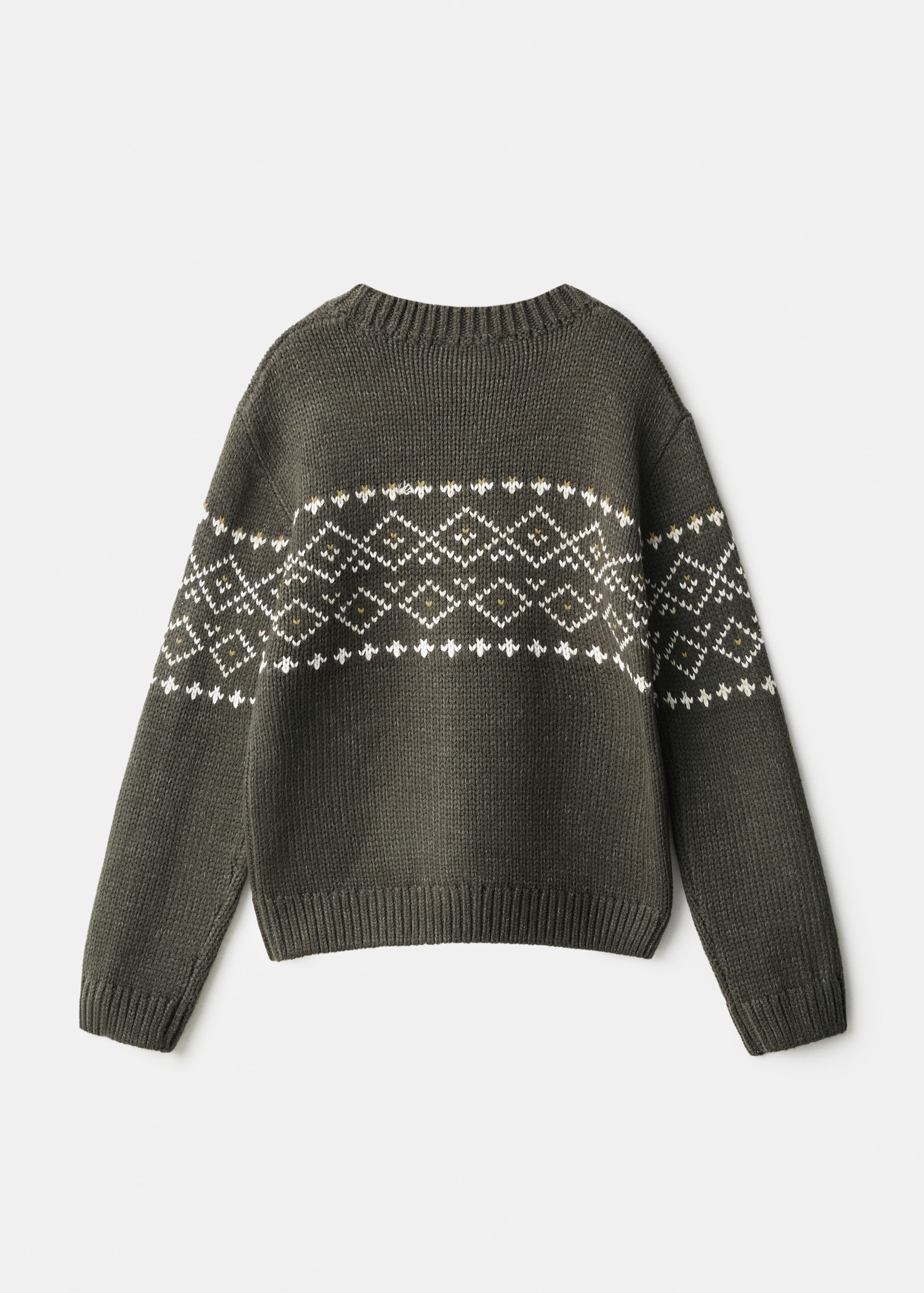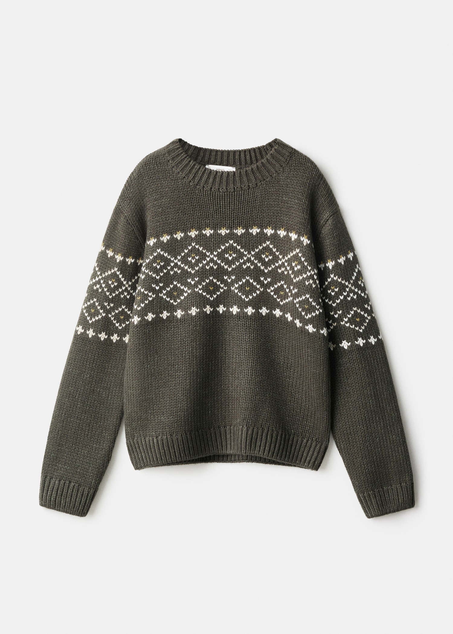 Knitted fabric. Jacquard design. Crew neck. Long Sleeve. Ribbed neck, cuffs, and hem