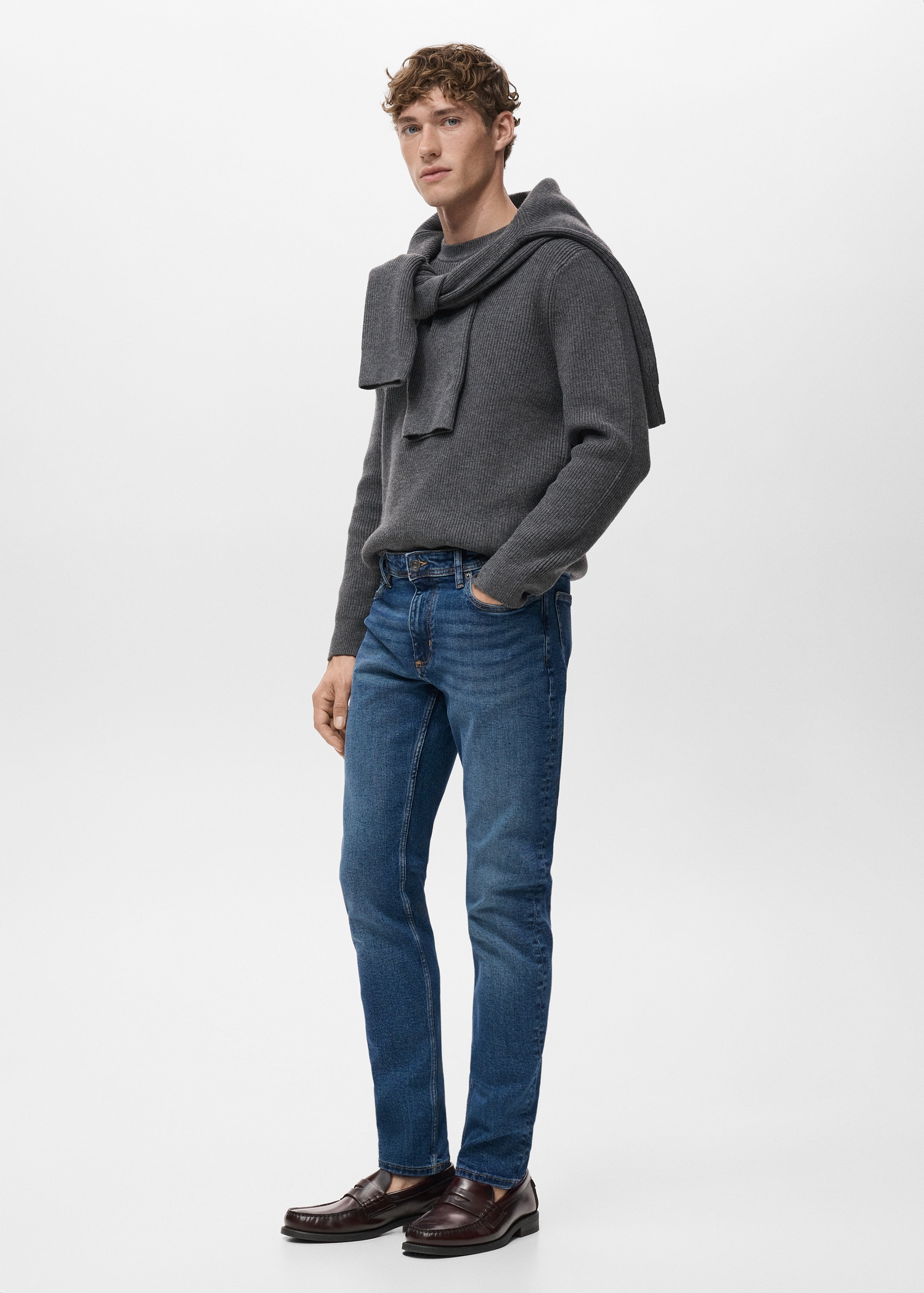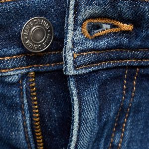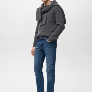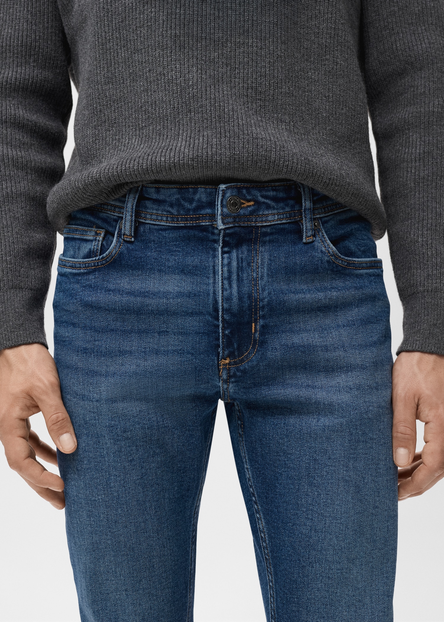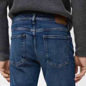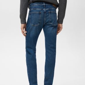 Slim fit. Cotton fabric. Denim jeans style. Button and zipper closure. Side pockets. Coin pocket. Two patch pockets at the back. Faded dark wash. Cotton denim fabric. Belt loops. Five pockets. Two front welt pockets. Standard Length. Slim Silhouette. Regular Waist Rise